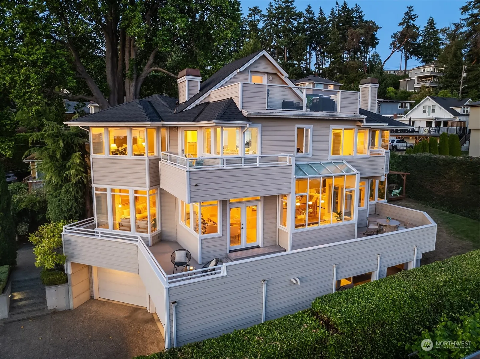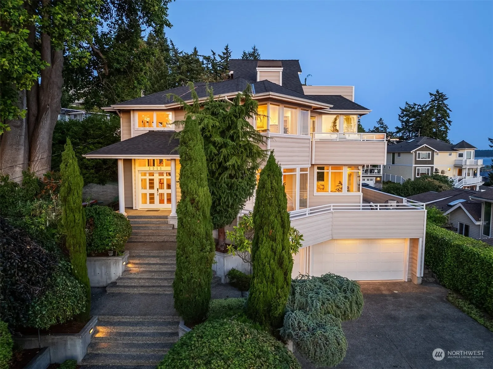 Commanding sweeping views of the Puget Sound & Olympics, this luxurious Richmond Beach residence offers grand-scale living w/ walls of windows & multiple view decks that seamlessly blend sunsets & vistas into everyday life. Dramatic 2-story w/ sweeping staircase, detailed craftsmanship: wainscoting, columns, & bespoke built-ins. Boasting 5 beds, generous Primary Suite w/ gas fireplace, private view deck, 5-piece bath, & walk-in closet w/ dual built-ins. Formal & informal spaces cater to various lifestyles, while a rooftop deck w/ hot tub plus lower level bonus offer ample spaces for relaxation & entertainment. Gourmet kitchen w/ gas range. 3-car attached garage. A rare opportunity to own a custom-built home, available for the first time.
