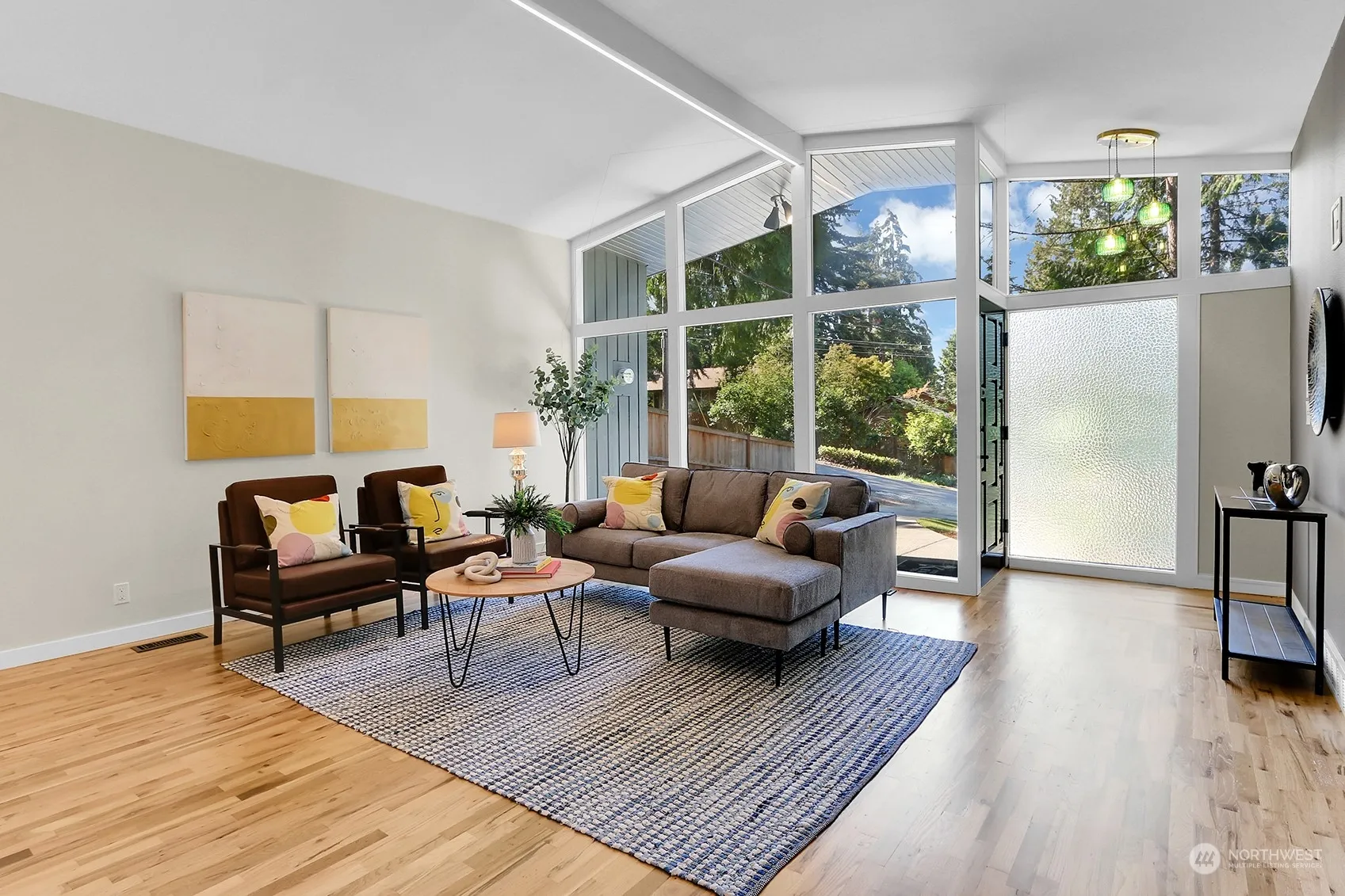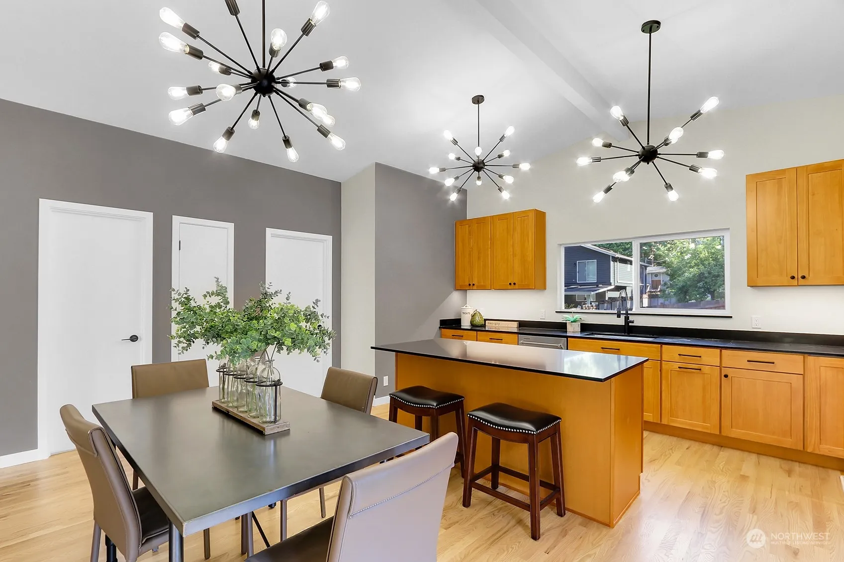 Mid-century made modern! Step into timeless elegance with this newly renovated 1959 gem in the tranquil community of Shoreline. This stunning 4-bedroom, 3 bath home seamlessly blends mid-century charm with contemporary upgrades. Gleaming hardwoods, vaulted ceilings, brand new island kitchen: Oak cabinets with slab Quartz counters & Kitchen Aid appliance package. Patio off dining area. Primary suite features a tile bath & walk in closet. Lwr lvl 2 bedrooms share a continental full bath. Relax by the fireplace in the cozy family room. Walk out to the fenced yard w/all new professional landscaping. 1 car garage w/EV Charger. This home is a rare find, offering classic mid-century architecture updated for today’s lifestyle.