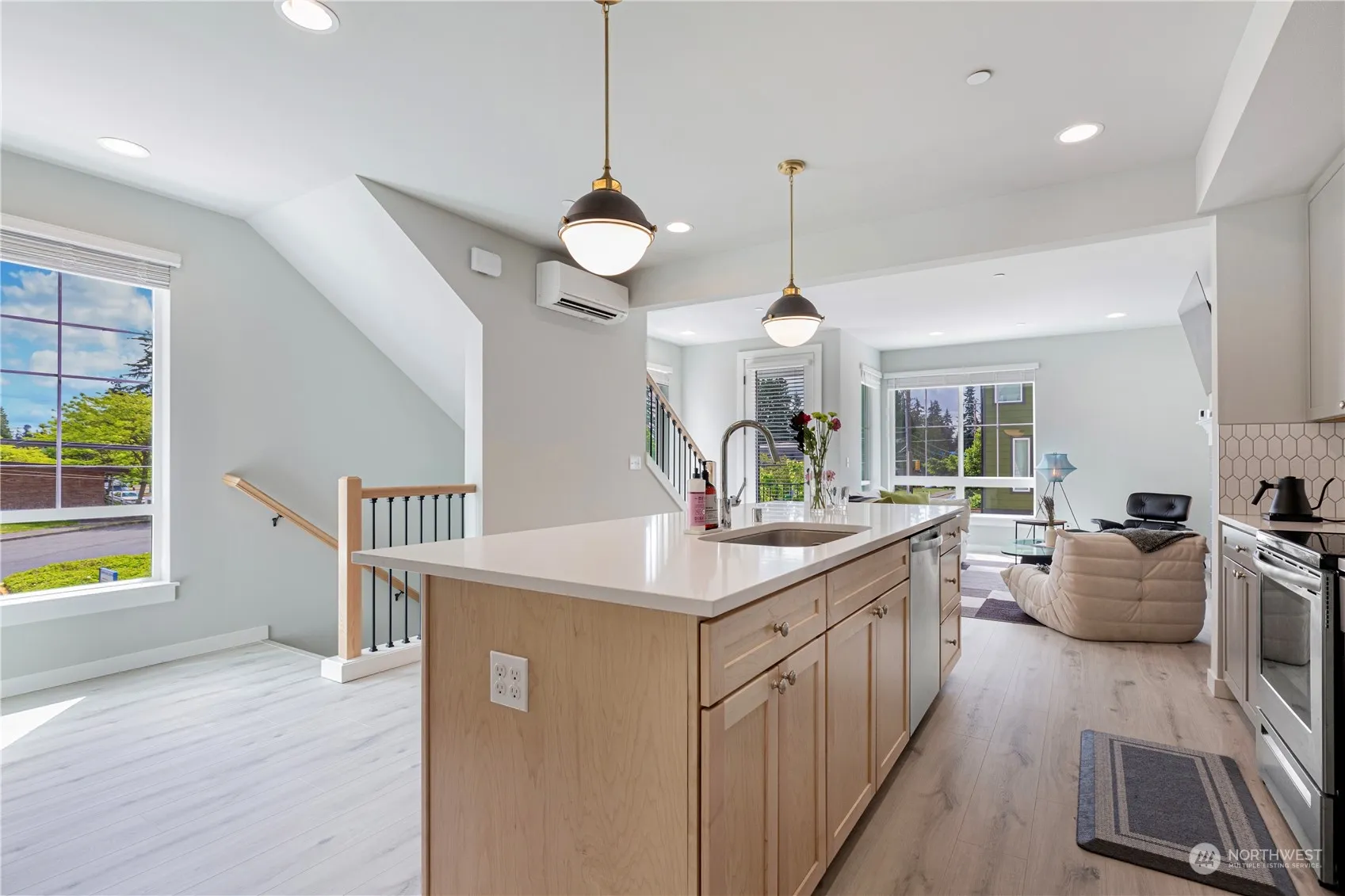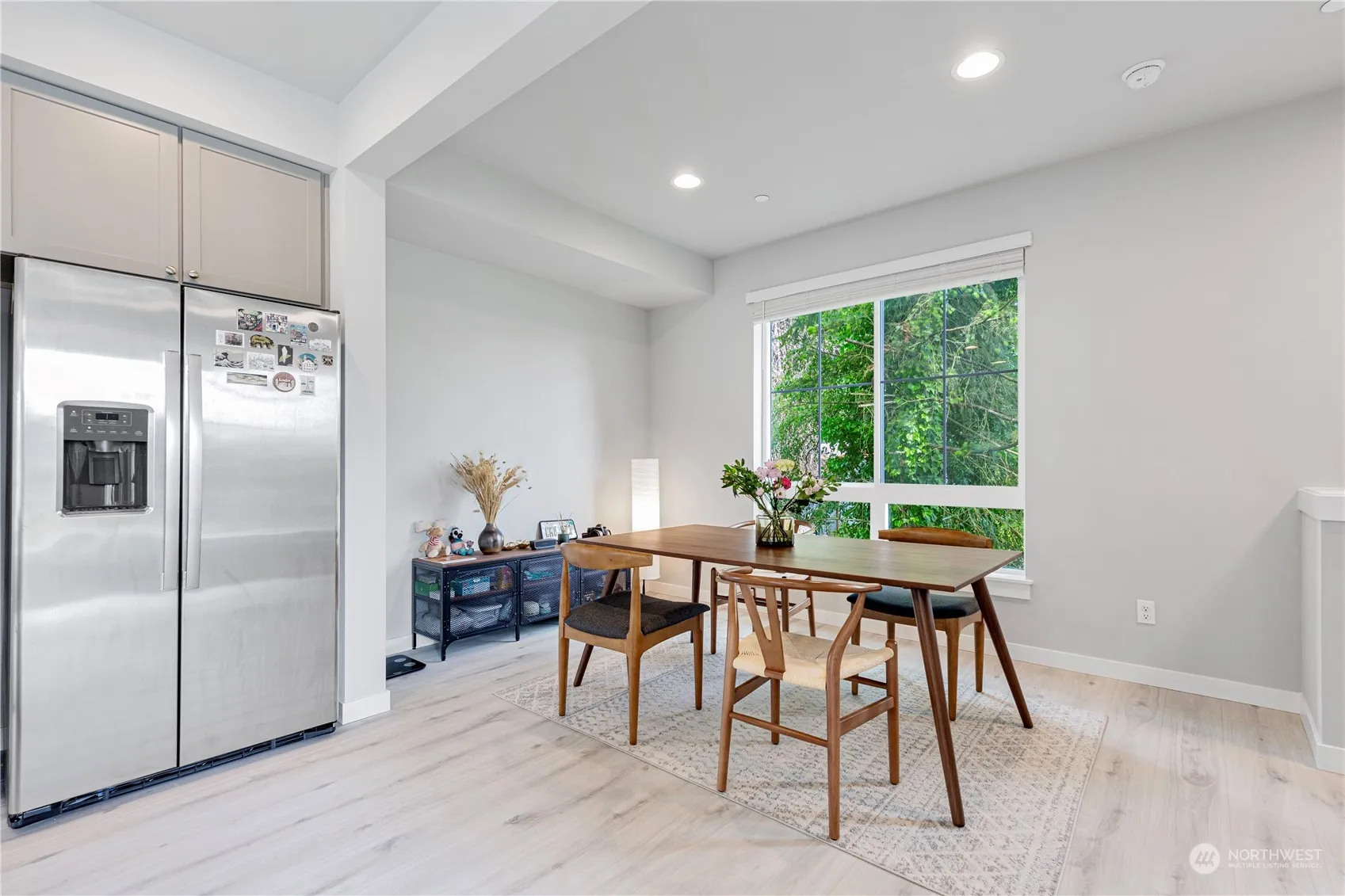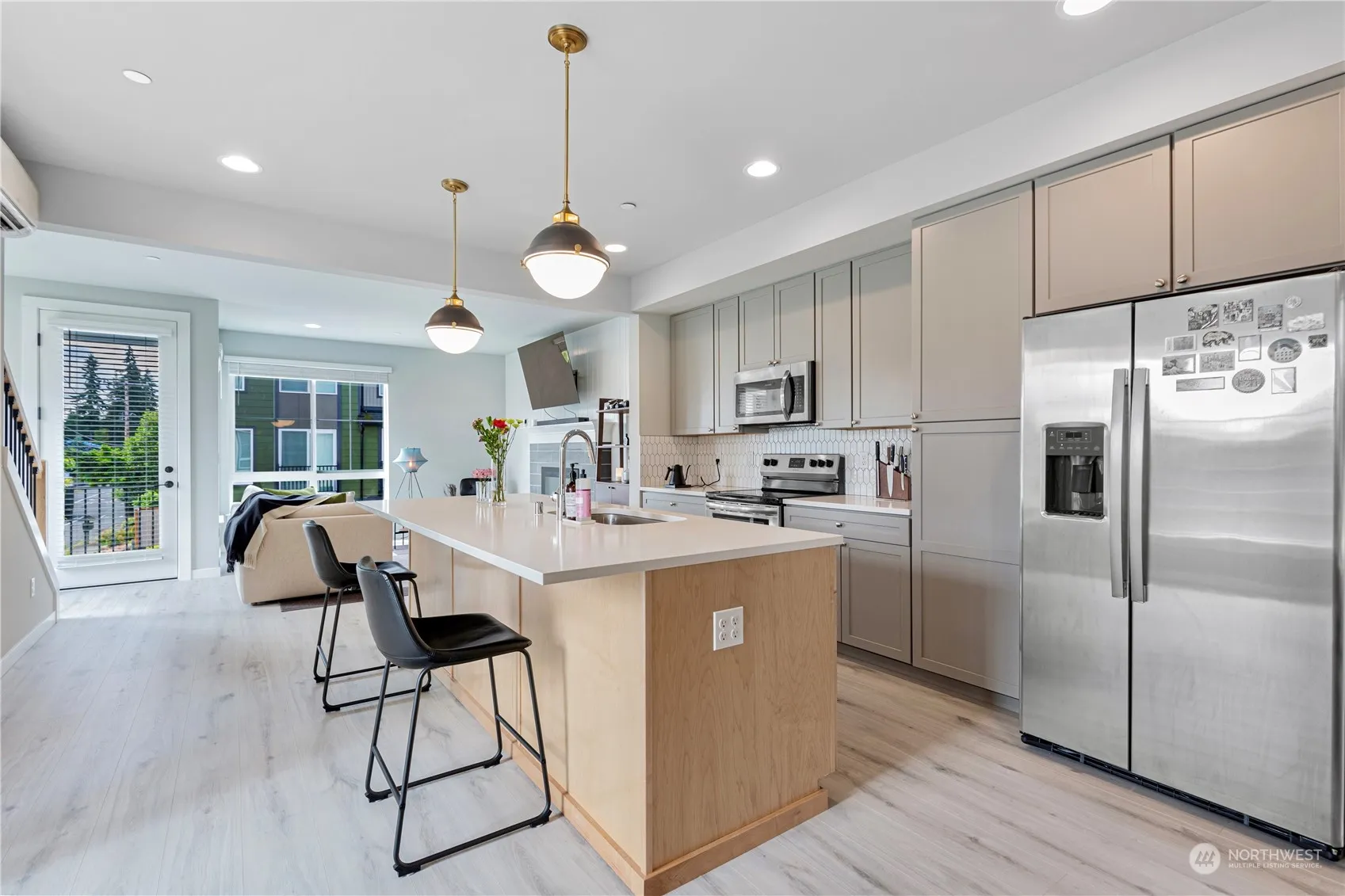 Better than new townhome located in the highly desirable city of Shoreline. Home features a spacious 1800sqft end unit, 4bd+2.25ba boasts an open floor plan. Extra features can be a butler’s pantry or Den behind the dining area. It has been eco-consciously designed w/a modern farmhouse feel. Light & bright w/ clean lines, luxury finishes& windows abound. Kitchen is stunning invites the most discerning of chefs with stainless steel appliances, soft-close cabinets w/quartz countertops. Primary suite features private bath, walk in closet and convenience of laundry on the top floor. 2 car attached garage w/parking pad and EV charging set this home apart. Close to award winning schools, parks, supermarkets, walkable to Shoreline Transit Station.