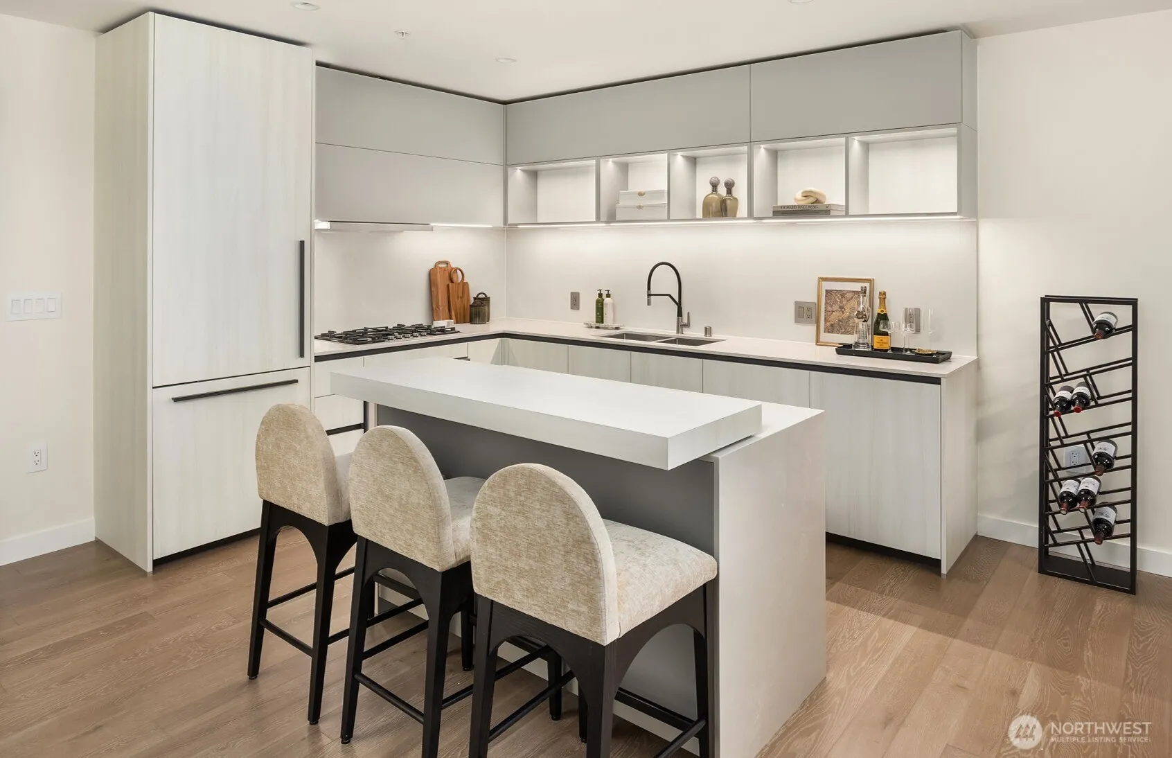 This brand new residence is defined by breathtaking water views and a sense of quiet luxury inside. The expansive primary bedroom commands panoramic views of Lake Washington and the Seattle skyline, while the secondary bedroom is well appointed to serve as a study or guest bedroom. Impeccable design details are included throughout, from Italian-made Ernestomeda cabinetry to German-engineered Gaggenau appliances. The home’s interior has been decorated by designer Tara Nelson, inspired by Liquene Dreams. Experience elevated living with 24-hour concierge service and a sophisticated first-floor lobby that sets a tone of refined elegance. Residents enjoy a private, fully equipped fitness center with dedicated yoga studio, a second-floor residential lounge with full kitchen and flexible entertaining space, and a beautifully designed outdoor terrace featuring firepits and a gas grill—perfect for gatherings under the stars. Thoughtfully curated amenities also include a private Dog lounge, dog walk area and an indoor bathing station, ensuring every member of the household is cared for in style. Avenue Residences is perched above a dynamic plaza marked with a growing retail collection and the renowned InterContinental Seattle Bellevue. This award-winning lifestyle destination presents Seattle’s east side with a new expression of international flavor, style and luxury crafted for connoisseurs of life.