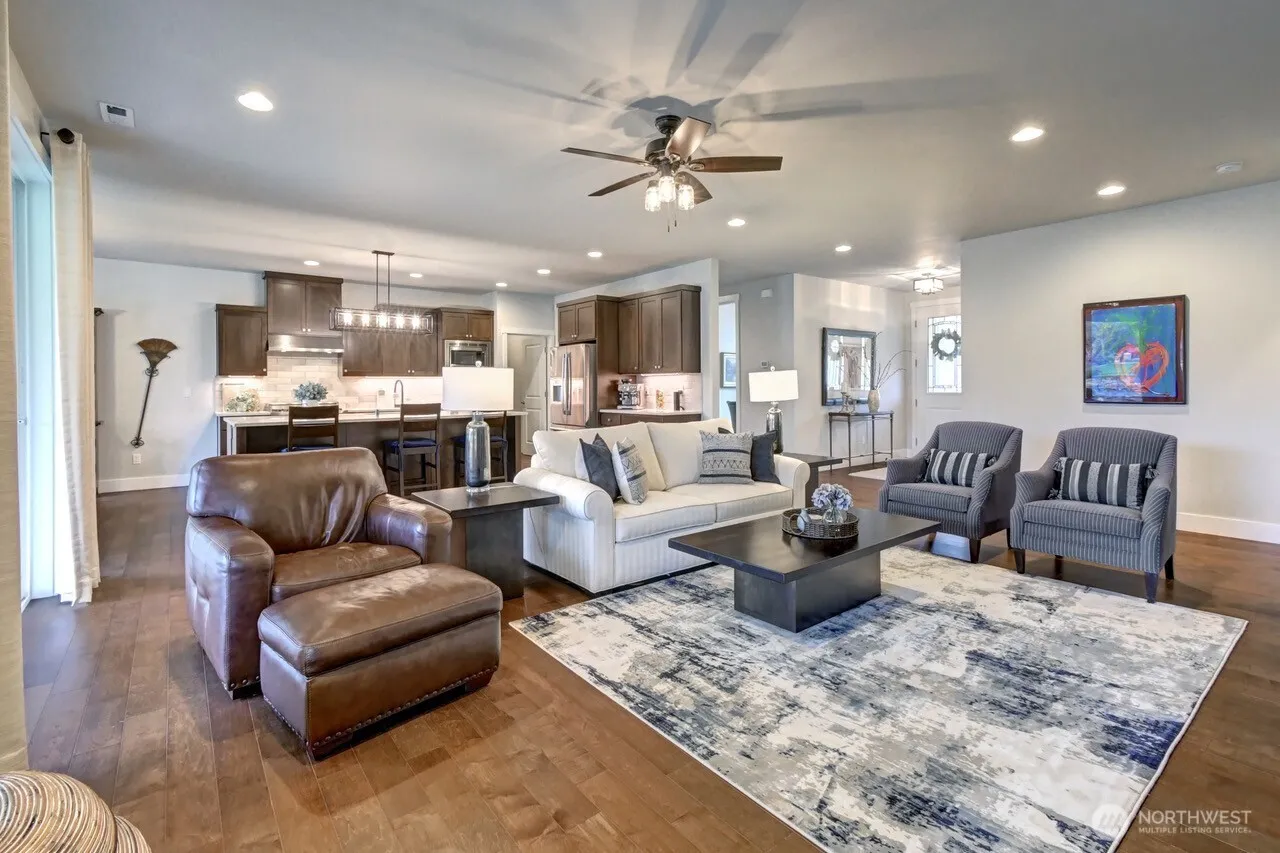 Refined one-level luxury on a sun-filled acre in coveted Kaiana Meadows. This expansive rambler showcases an elegant open-concept design with a welcoming great room featuring custom built-ins and a dramatic floor-to-ceiling stone fireplace. The chef’s kitchen is beautifully appointed with premium appliances, a generous island, and abundant workspace, perfectly suited for both everyday living and effortless entertaining. The spacious dining area flows seamlessly to the covered patio for year-round indoor-outdoor enjoyment. The private primary suite is thoughtfully positioned in its own wing, offering a peaceful retreat with sliding doors to a secluded covered patio—ideal for morning coffee. The suite features a luxurious 4-piece bath and custom built-in closet. On the opposite side of the home, a den with French doors provides a quiet office or library space, along with three additional bedrooms. The largest bedroom includes surround sound and a private ensuite bath, ideal for guests or multi-generational living. Beautifully landscaped and level, the 1-acre property offers exceptional outdoor living with a terraced backyard, a sprinkler system, invisible fence, outdoor lighting, and a cozy wood firepit, all backing to a tranquil greenbelt for added privacy. Quiet cul-de-sac setting with heat pump and A/C. Ideally located just minutes to downtown Woodinville, Duvall, Monroe and Redmond and top Eastside employers.