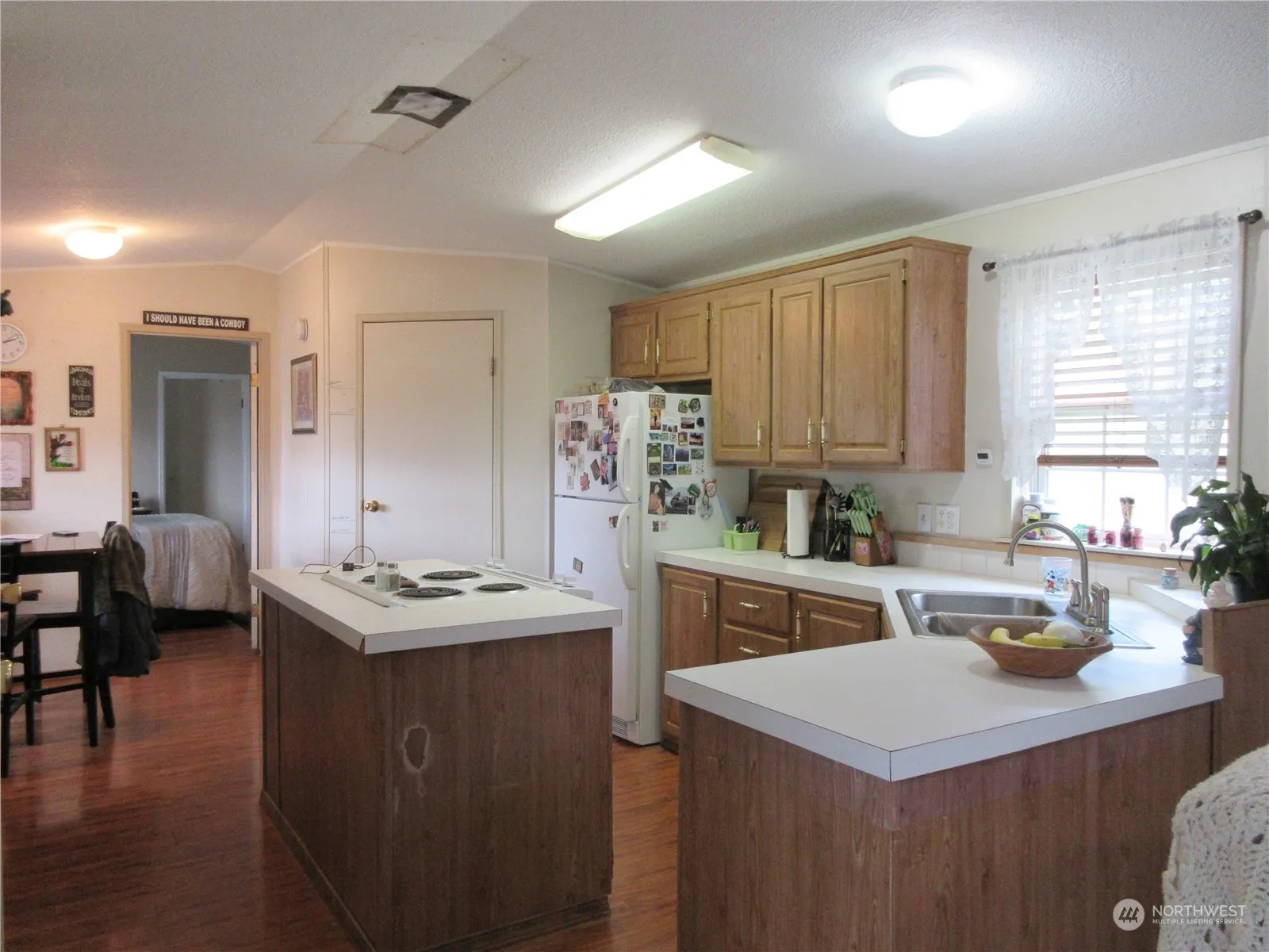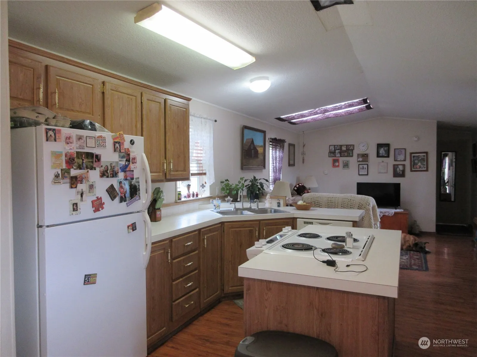 One of the best views in town from this 2 bedroom, 2 bath home near downtown Republic. 1996 single-wide manufactured home nicely set up on a leased lot with good sized storage shed and large deck included. Super cute kitchen with plenty of room for a dining table and cabinet storage. Skylights add natural light to this already bright home. Laundry room is just off the kitchen and has an outside entrance so it can also be used as a mud room. Great year around access!
