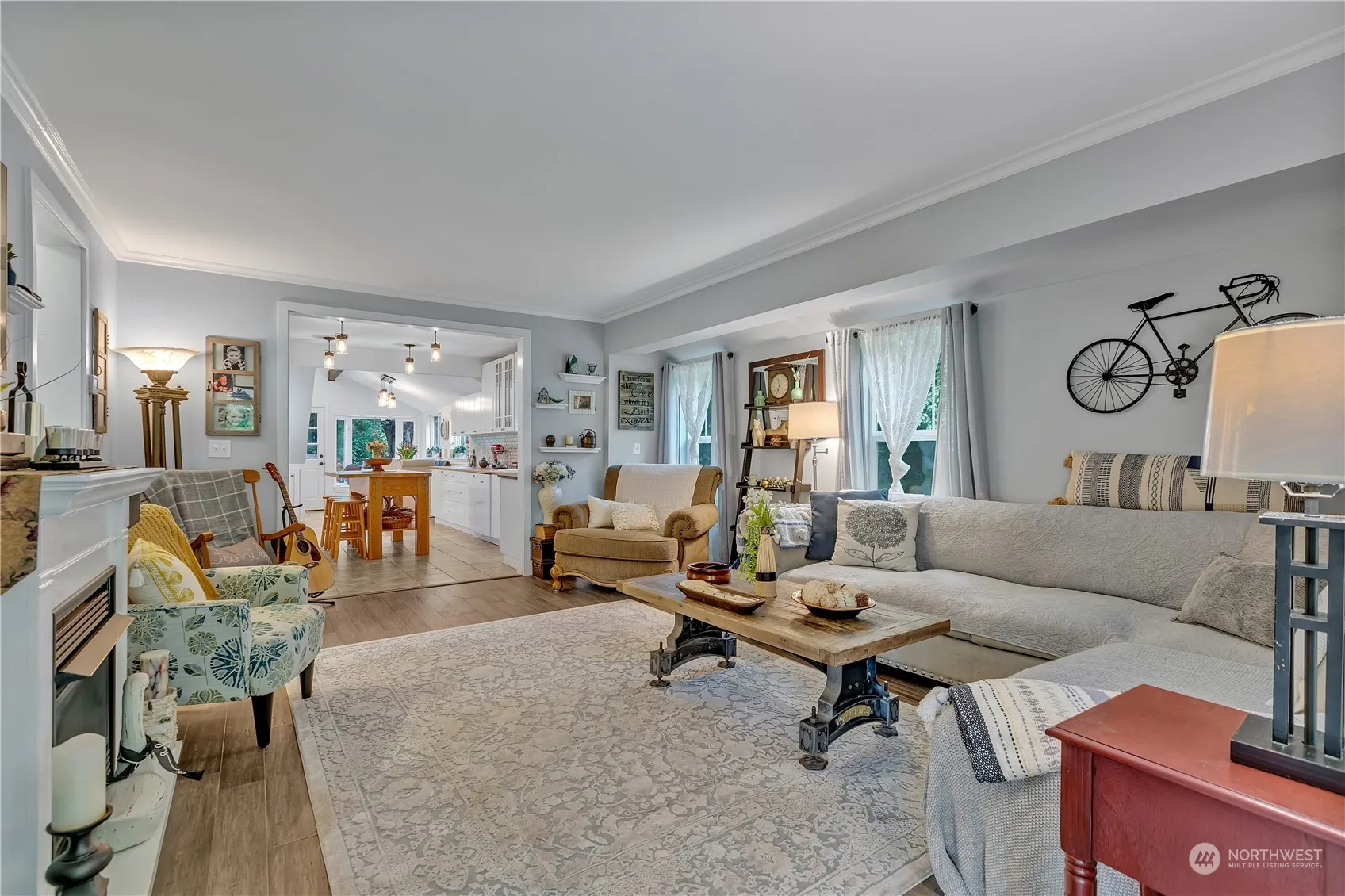 Perched above Kimball Creek, this sanctuary boasts an open layout flooded with natural light. The modern kitchen leads to a spacious deck overlooking the serene creek below, offering a peaceful setting. Enjoy the large private yard with mature gardens. Upstairs, a loft-style primary bedroom includes a versatile loft space with a walk in closet and full bathroom. Updates include a refreshed bathroom, spacious garage, carport, new roof, newer plumbing, and newer electrical. Recent improvements: New interior and exterior paint, kitchen backsplash, new washer/dryer, and extra storage in outbuilding. Take in the tranquil creek views from the deck, surrounded by nature’s beauty.