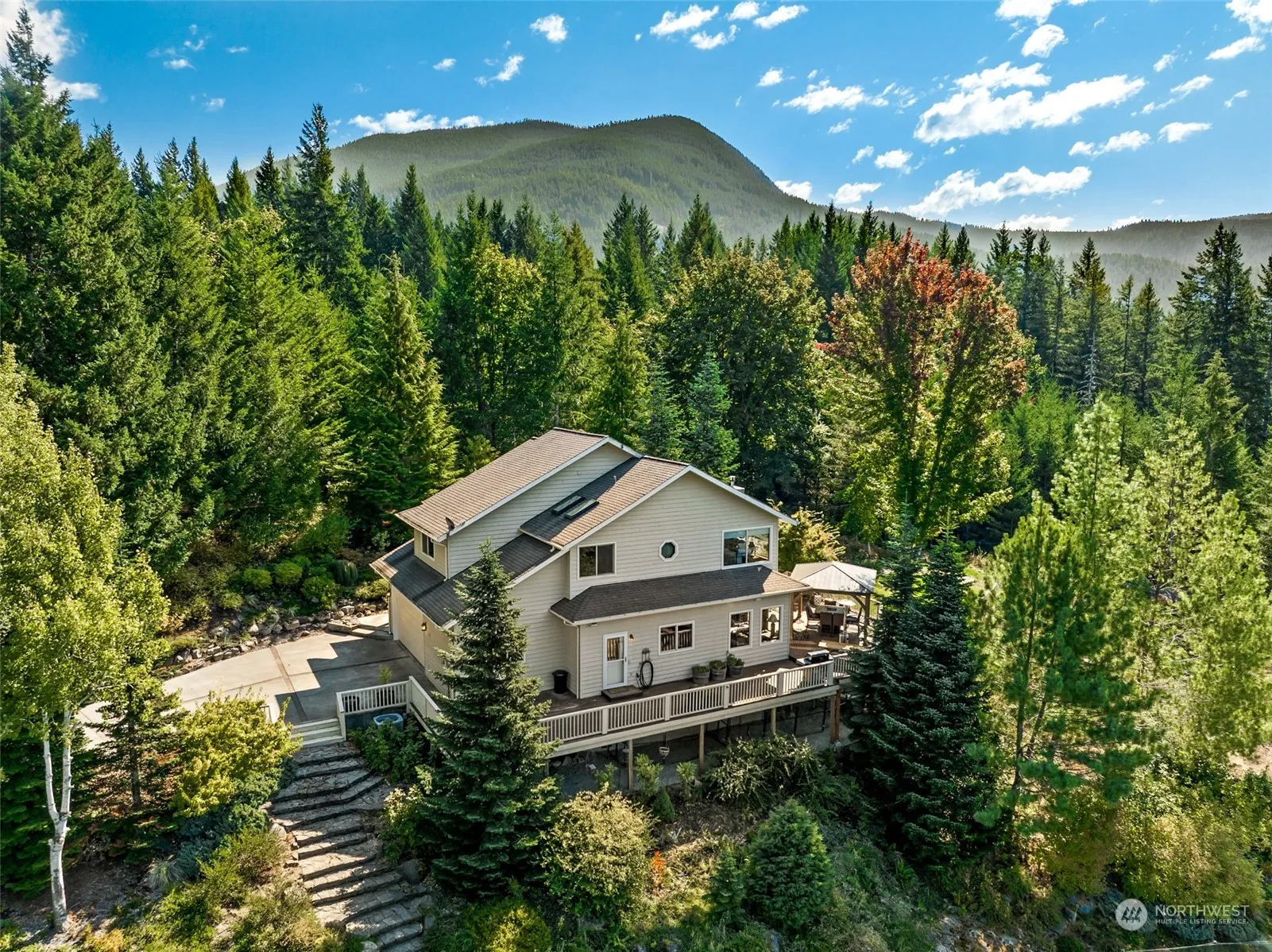 It’s a perfect day to buy your dream home! 3-bed/2.25 bath home in gated neighborhood. Detached ADU with 1 bed/.75 bath & garage/storage below. Amazing views of Mt Rainier & Cowlitz Valley/Tatoosh Range. This property is less than a mile from downtown Packwood & has easy HWY 12 access. 25 minutes to Mt Rainier Nat Park/White Pass Ski Resort. 2.5 hours to SEA & PDX. Open concept living space with river rock fireplace. Fully equipped kitchen, featuring ILVE gas range, double ovens, granite counters/maple cabinets. Expansive outdoor deck space. New hot tub & gazebo. The main home and ADU are both currently successful vacation rentals. Guests love the mountain views and relaxing sauna! Virtual tour & video available.