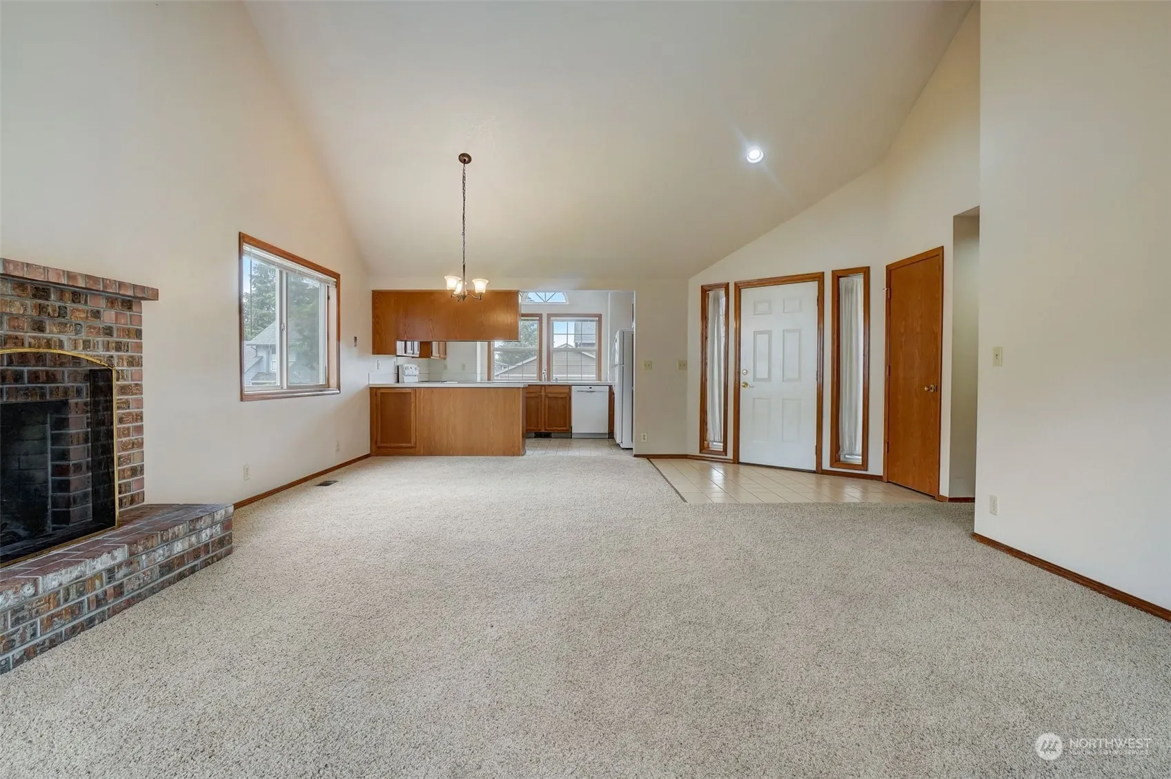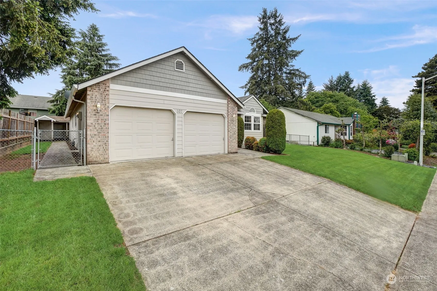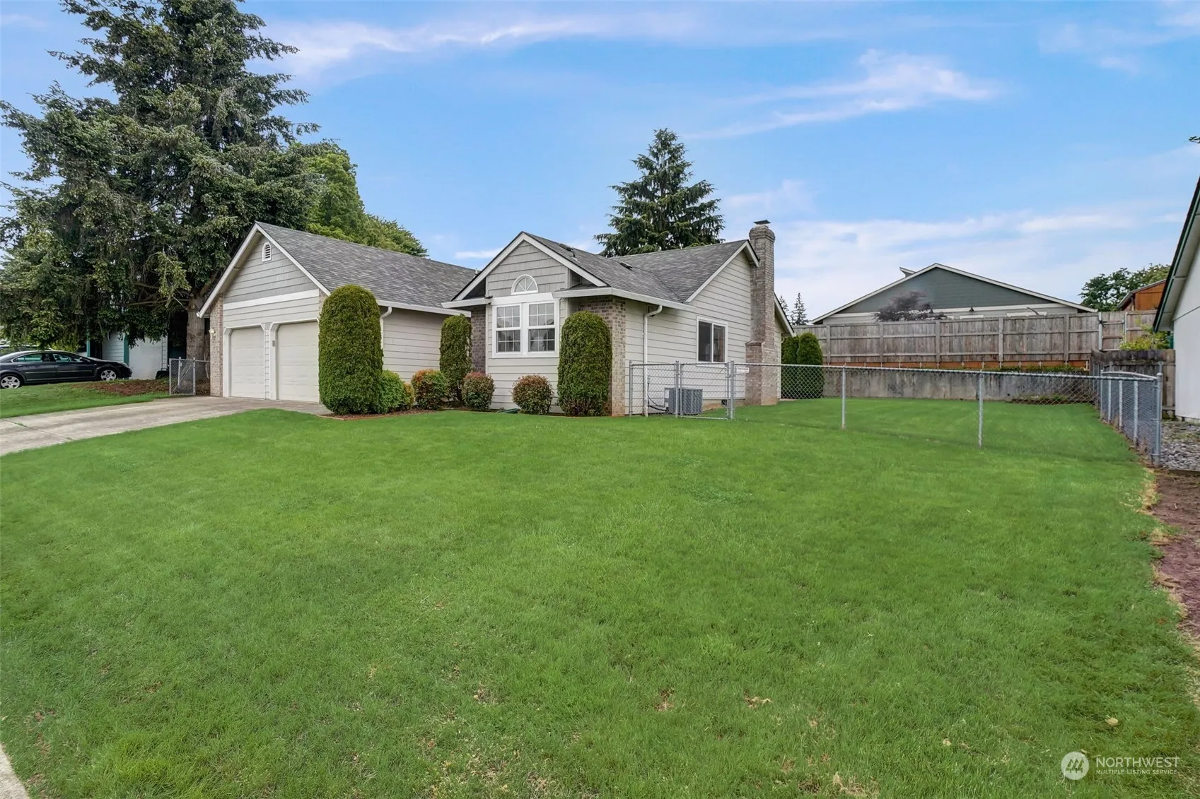 Welcome to this inviting home with a covered front porch and accessible entry. Great room featuring a family room with a brick surround wood-burning fireplace. Accessible via a 1-lite door, the patio and backyard offer seamless indoor-outdoor flow. The cathedral-style vaulted ceiling enhances the open, airy ambiance. The kitchen boasts ample oak cabinetry, a dishwasher, electric range, range hood and refrigerator. Adjacent dining area perfect for meals and gatherings. Spacious primary en-suite offers a cozy sitting area, walk-in closet and patio access. Additional bedrooms and laundry room add to the homes functionality. Enjoy the covered front porch, back patio, and 2-car garage. Fully fenced and landscaped. The perfect place to call home.