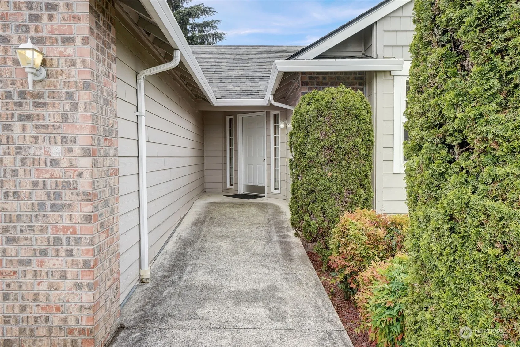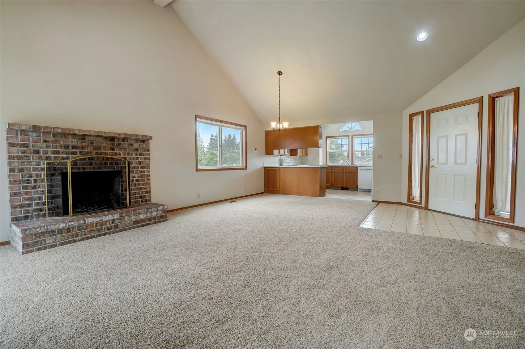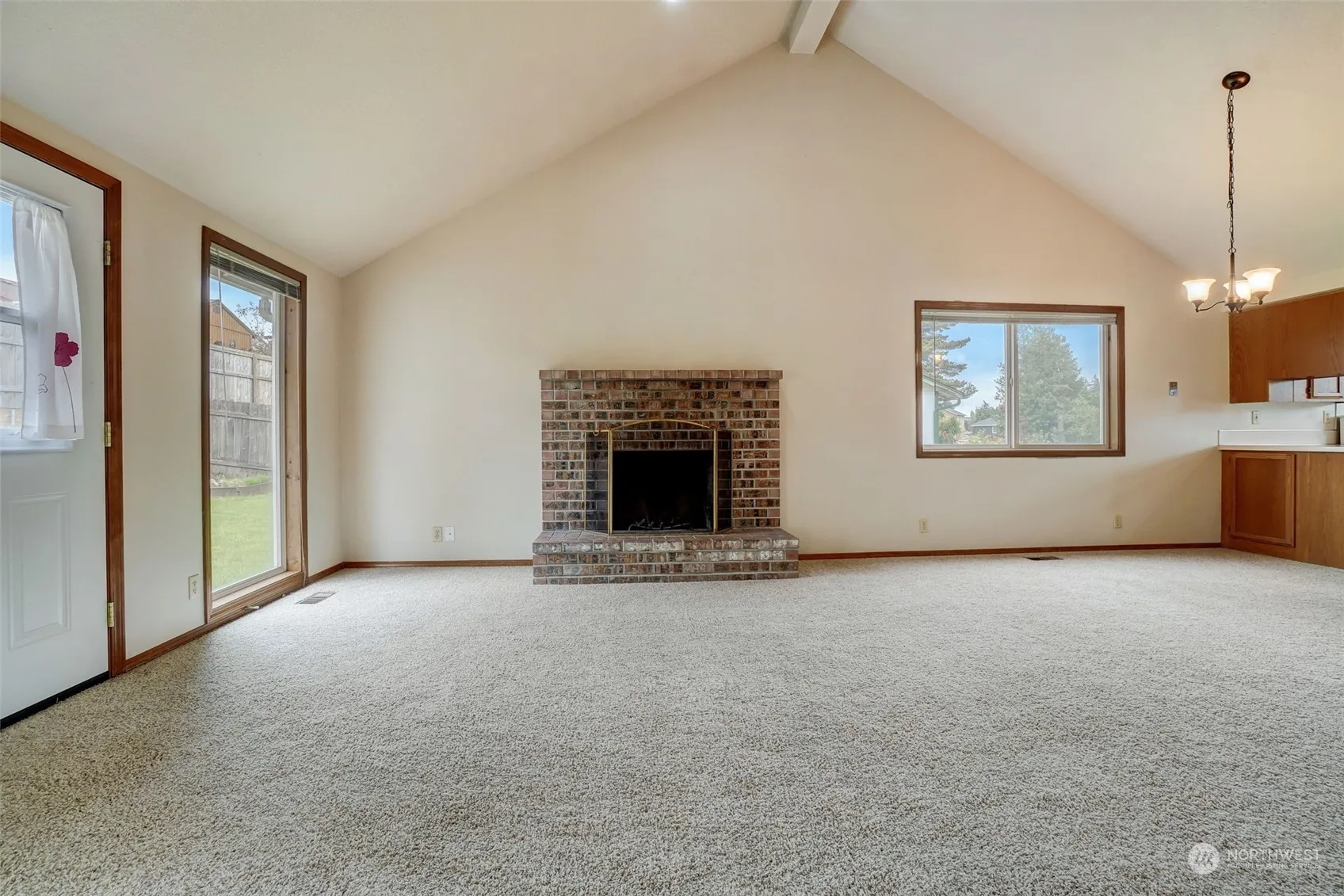 Welcome to this inviting home with a covered front porch and accessible entry. Great room featuring a family room with a brick surround wood-burning fireplace. Accessible via a 1-lite door, the patio and backyard offer seamless indoor-outdoor flow. The cathedral-style vaulted ceiling enhances the open, airy ambiance. The kitchen boasts ample oak cabinetry, a dishwasher, electric range, range hood and refrigerator. Adjacent dining area perfect for meals and gatherings. Spacious primary en-suite offers a cozy sitting area, walk-in closet and patio access. Additional bedrooms and laundry room add to the homes functionality. Enjoy the covered front porch, back patio, and 2-car garage. Fully fenced and landscaped. The perfect place to call home.