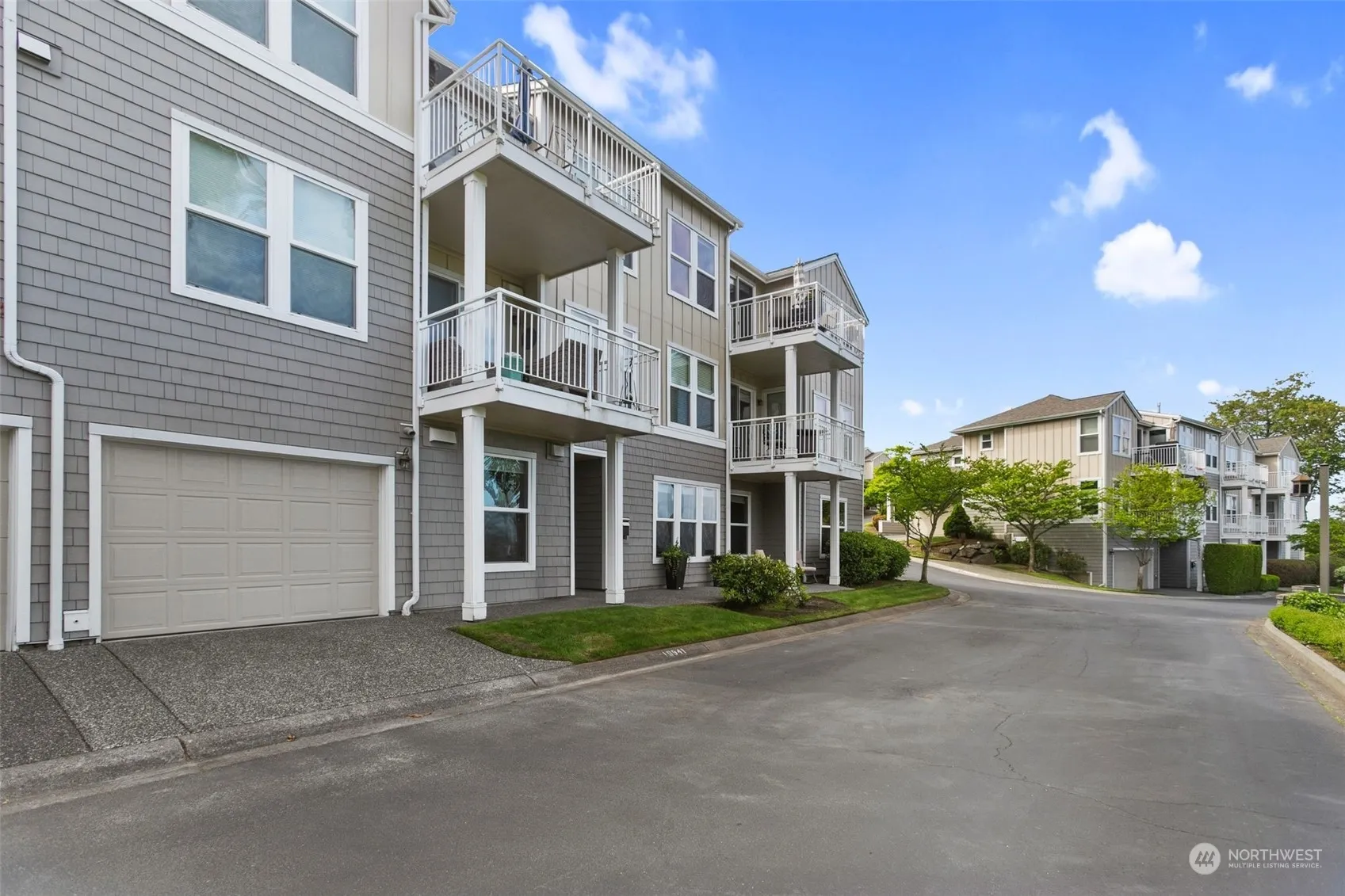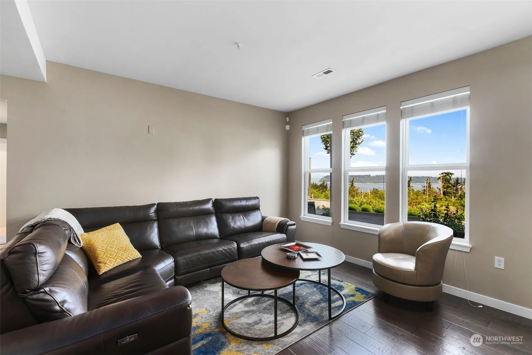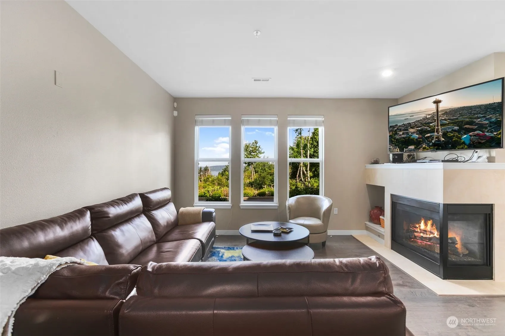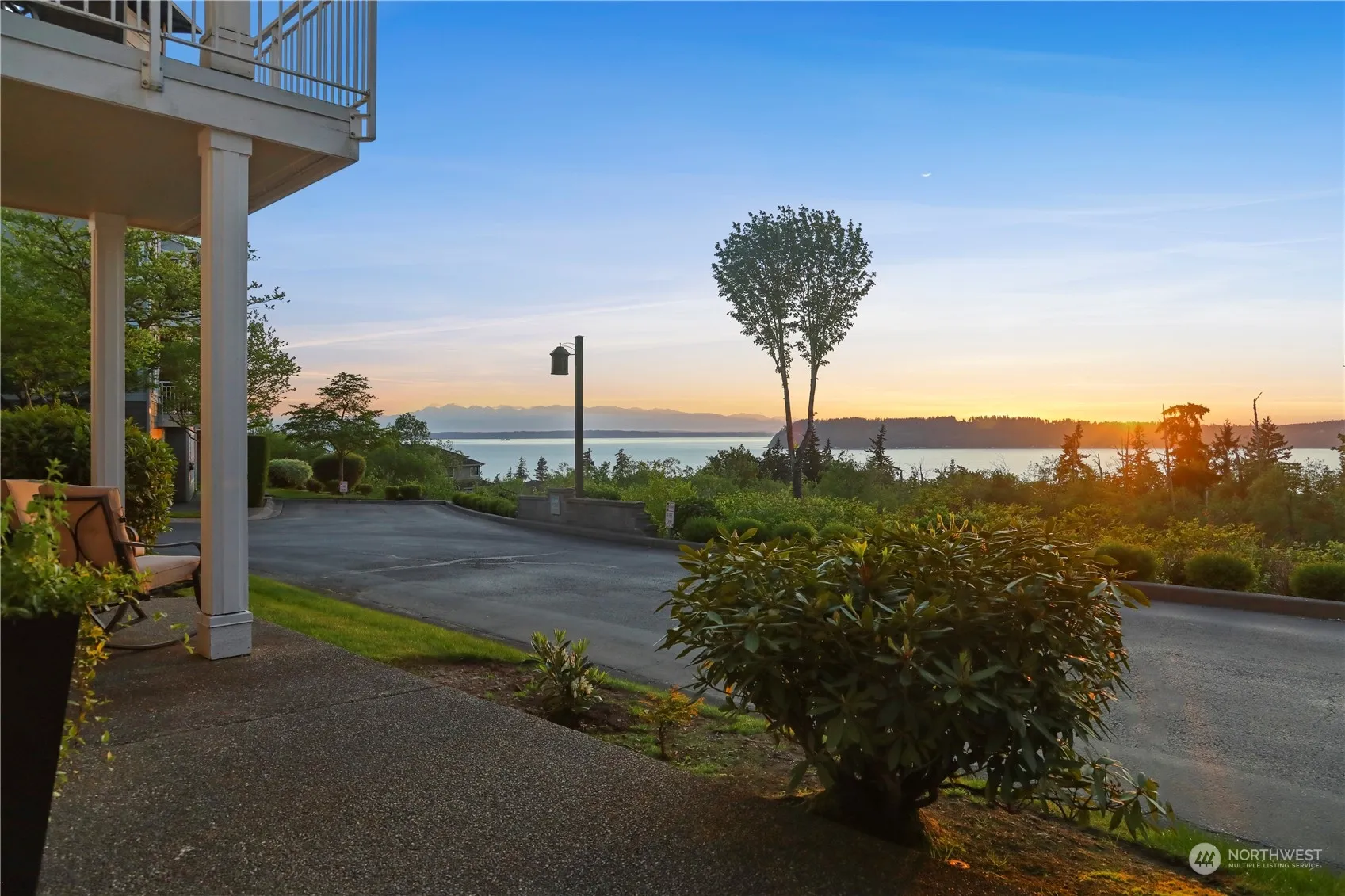Experience peaceful living in this 3-bedroom, Villa Monte condo with panoramic Puget Sound views. Enter through a private ground floor entrance to a gas fireplace-warmed open layout with updated hardwood floors. The gourmet kitchen offers a gas cooktop, elegant countertops, and abundant cabinet storage. Each bedroom provides breathtaking views, including the primary suite with a spacious walk-in closet and a lavish en-suite bathroom with a soaking tub and walk-in shower. Enjoy seamless indoor-outdoor living on the private west-facing patio. No stairs or steps. 1-car attached garage with storage.