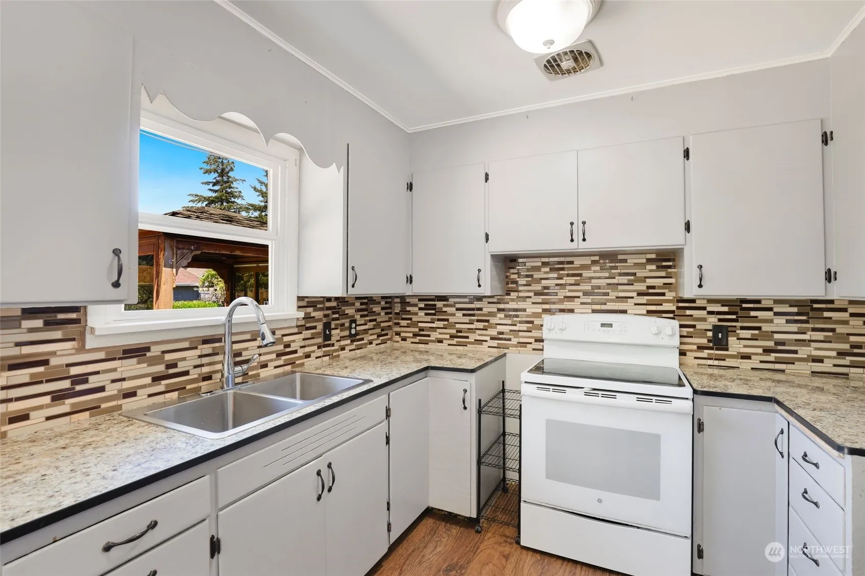 Excellent 3 bedroom 1 1/2 story with a detached 4 car shop in charming downtown Enumclaw. Oversized living room with lots of natural light. 2 good size bedrooms on main floor and an additional 3rd bedroom up with knotty pine ceilings and walls for a rustic feel and built in closets and storage. The Kitchen has french doors that lead to an entertaining sized deck with a hot tub pad and gazebo. The large 4 car detached shop has seperate power panel box plus there is a RV pad and also easy alley access. The home has all new LVP flooring throughout and newer vinyl windows. This is a Gardeners dream yard with a garden that the owner has insured as organic and natural. The location is great close to downtown, parks and ever popular Cole St.