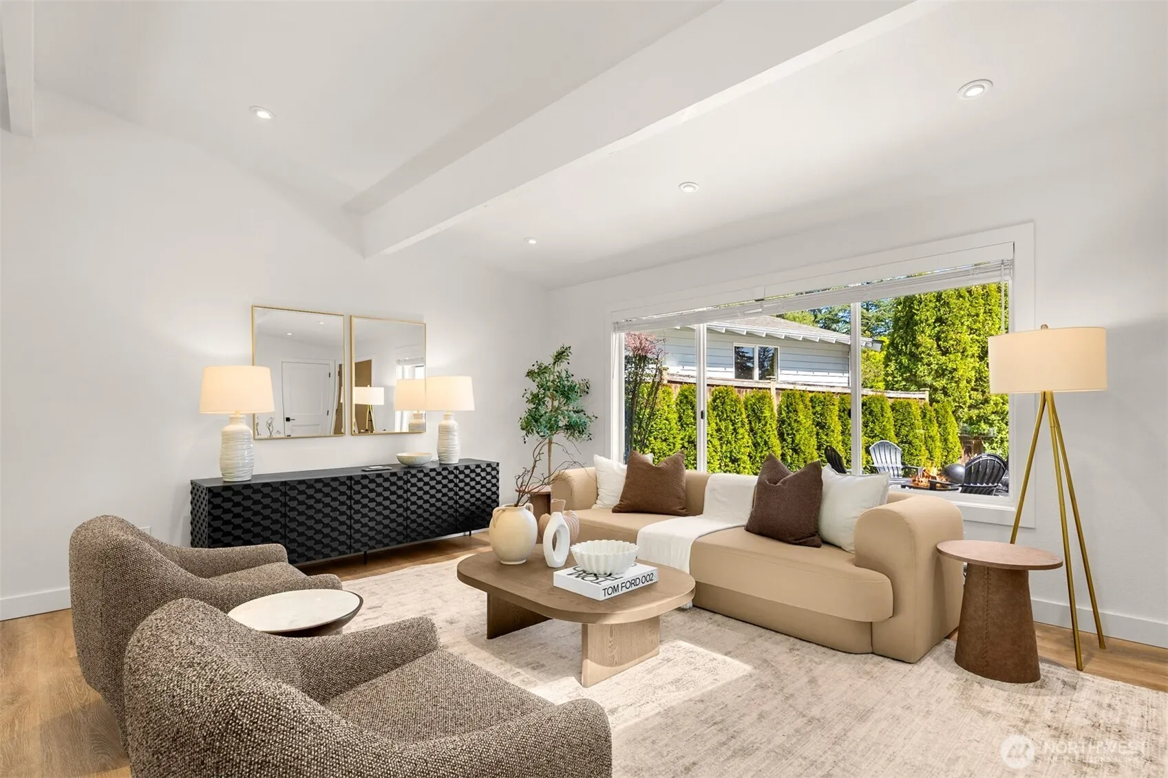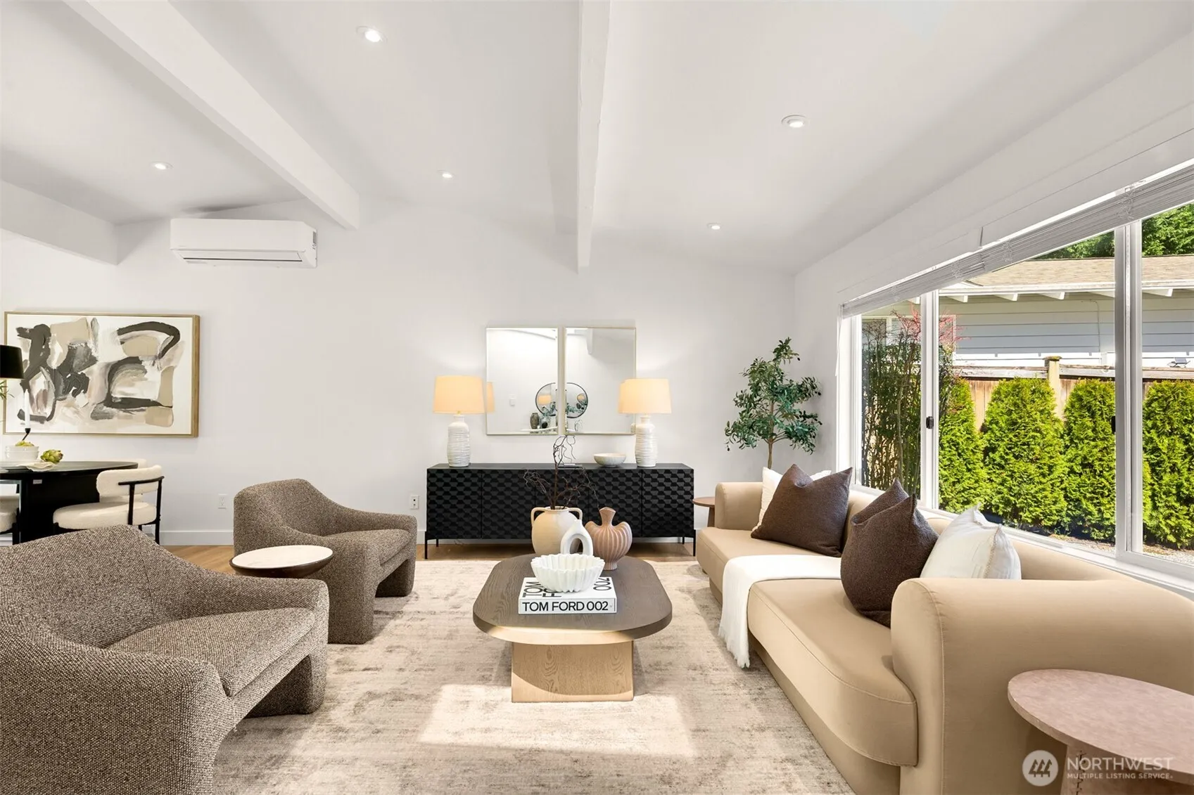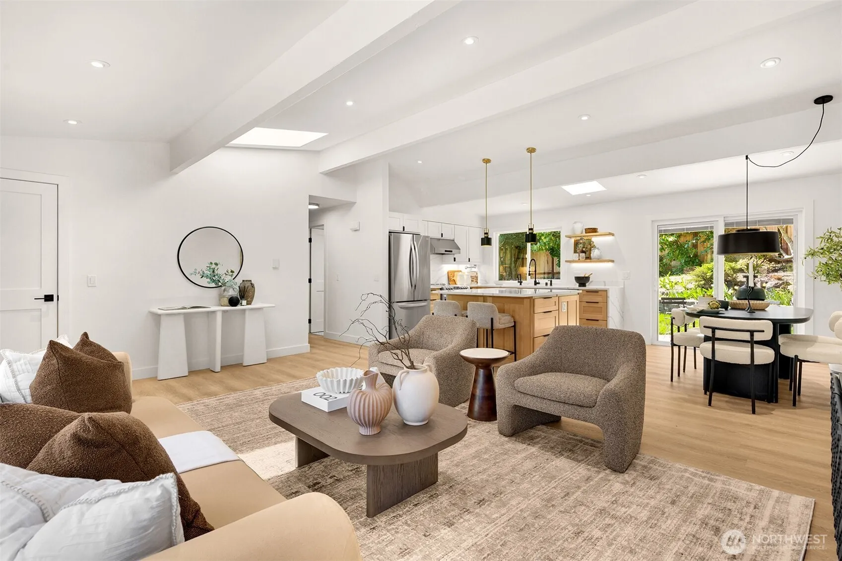 Stunning mid-century modern ranch East of Market home, fully reimagined with designer finishes throughout located on a private cul de sac. The open great room wows with vaulted ceilings and skylights, flowing seamlessly from the living area through the chef’s kitchen — featuring updated oak cabinetry, quartz waterfall island, open shelving, and premium stainless appliances. The dining area anchors the space with a statement black pendant, room for an 6-top table +sliding glass doors that open directly to the backyard patio — perfect for indoor-outdoor entertaining. Multiple living spaces offer incredible flexibility, each styled with warm, organic materials that feel both elevated and livable. Expansive sliders bring the outside in, opening to a private, fully-fenced yard with terraced stone garden beds and mature, curated landscaping. Three spacious bedrooms each carry their own distinct character, from floral wallpaper accents to built-in desk nooks and louvered closet doors. Updated full bath features hex tile flooring and a clean, spa-inspired palette. LG smart laundry, mini-split HVAC for year-round comfort, tankless h2o heater, and an attached 2-car garage with a sleek modern door complete the package. All of this tucked into a quiet neighborhood just minutes from Lake Washington – w/ sweeping lake and Seattle skyline views visible right from the street. Turnkey perfection. Walking distance to Peter Kirk and all things DT Kirkland offers! See site plan for future DADU.