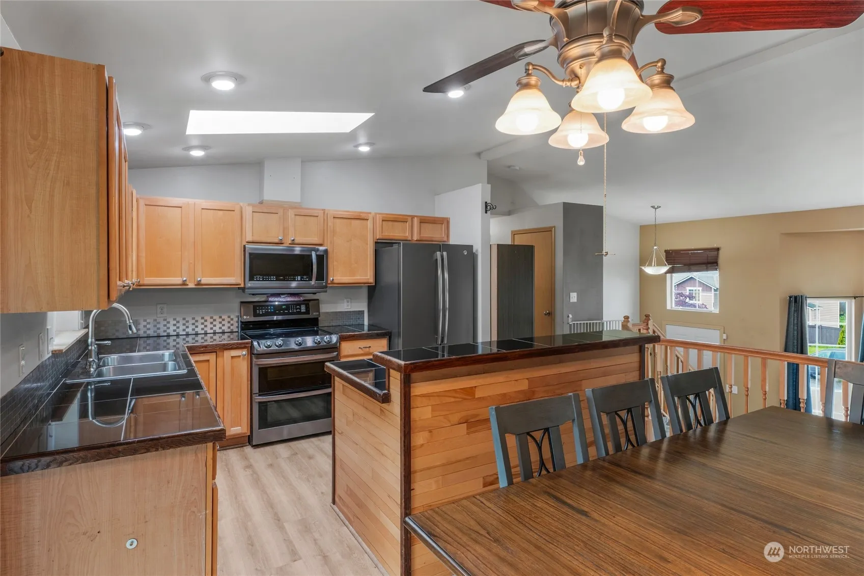 This stunning 1,815 sq ft home in The Crossing development sits west of Gleneagle. Layout as a California split with a living room on the main floor with gas fireplace and large picture windows for abundant natural light. New carpets throughout. Large bonus room great for entertaining. Kitchen with new flooring and tile countertops, stainless steal appliances with large island. Open dining room opens up to back deck, great for BBQ or enjoying the peaceful fully fenced backyard. Primary bedroom with ceiling fan, shelves for storage and walk-in closet. Downstairs features 3/4 bathroom with shower and bedroom with space for your imagination. Three air conditioning window units. New roof in 2022. RV parking with dump station.