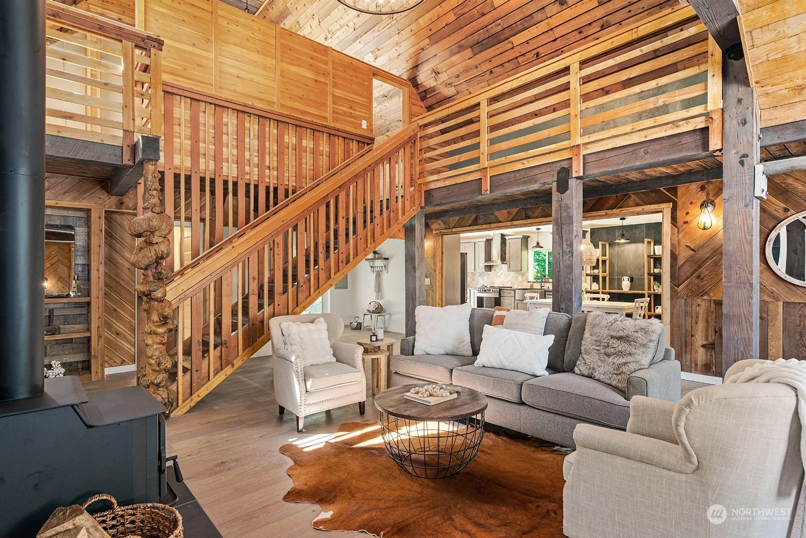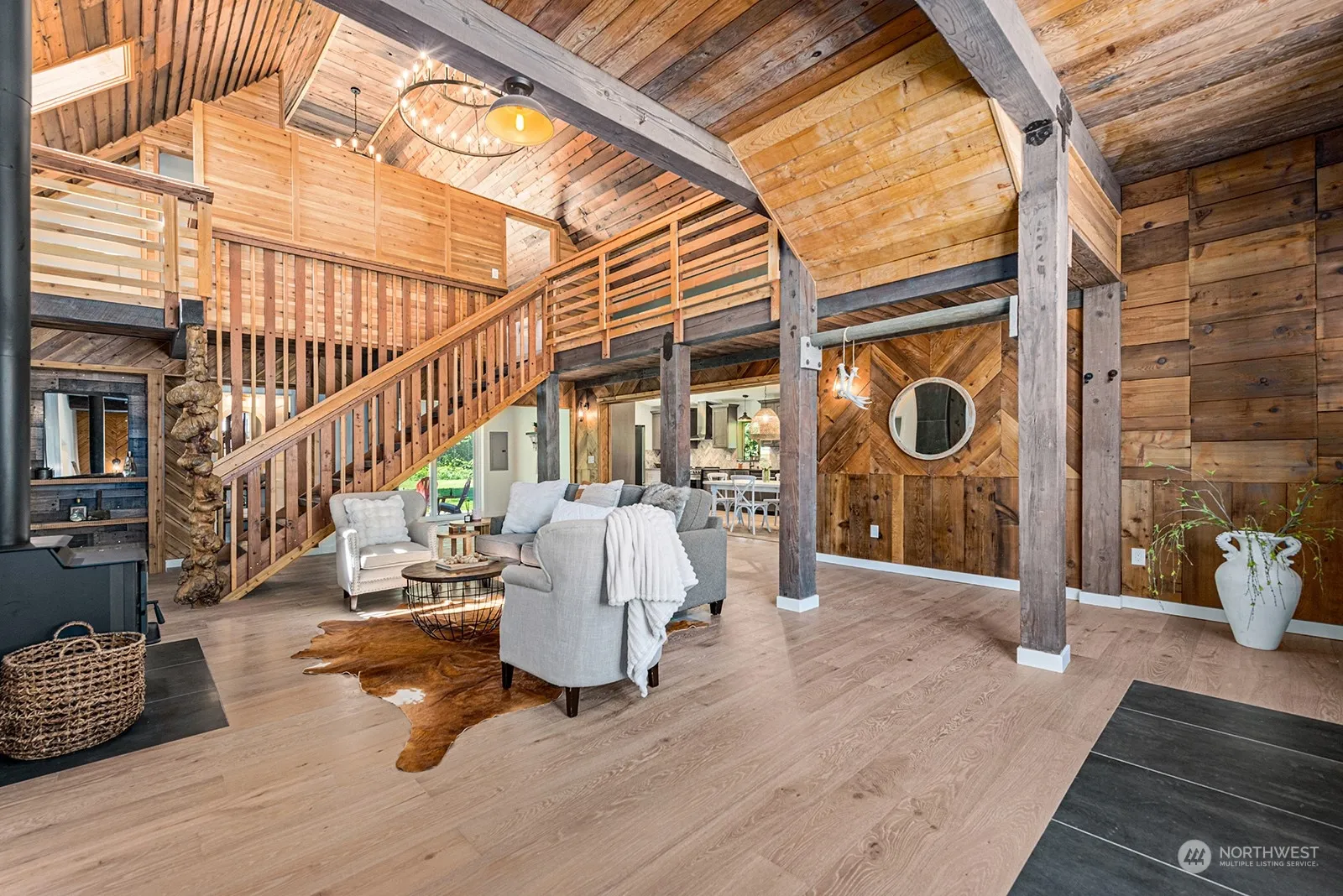 This completely restored & modernized three-bedroom, 3.5 bathrooms, with office stunning 2600+ Sq Ft home, showcases original woodwork and charm. Soaring ceilings, cozy wood burning fireplace. New black stainless-steel appliances, including washer and dryer, custom travertine heated floors in the master bathroom, metal roof, cedar siding & AC. Nestled on a shy 6 acres of serene parklike surroundings, this property offers a tranquil escape, lush green landscape & pathways along the creek for leisurely walks. The oversized four car garage /shop provides ample space for your vehicles and storage needs. RV parking pad & hook ups. Don’t miss out on this rare barndominium gem.
