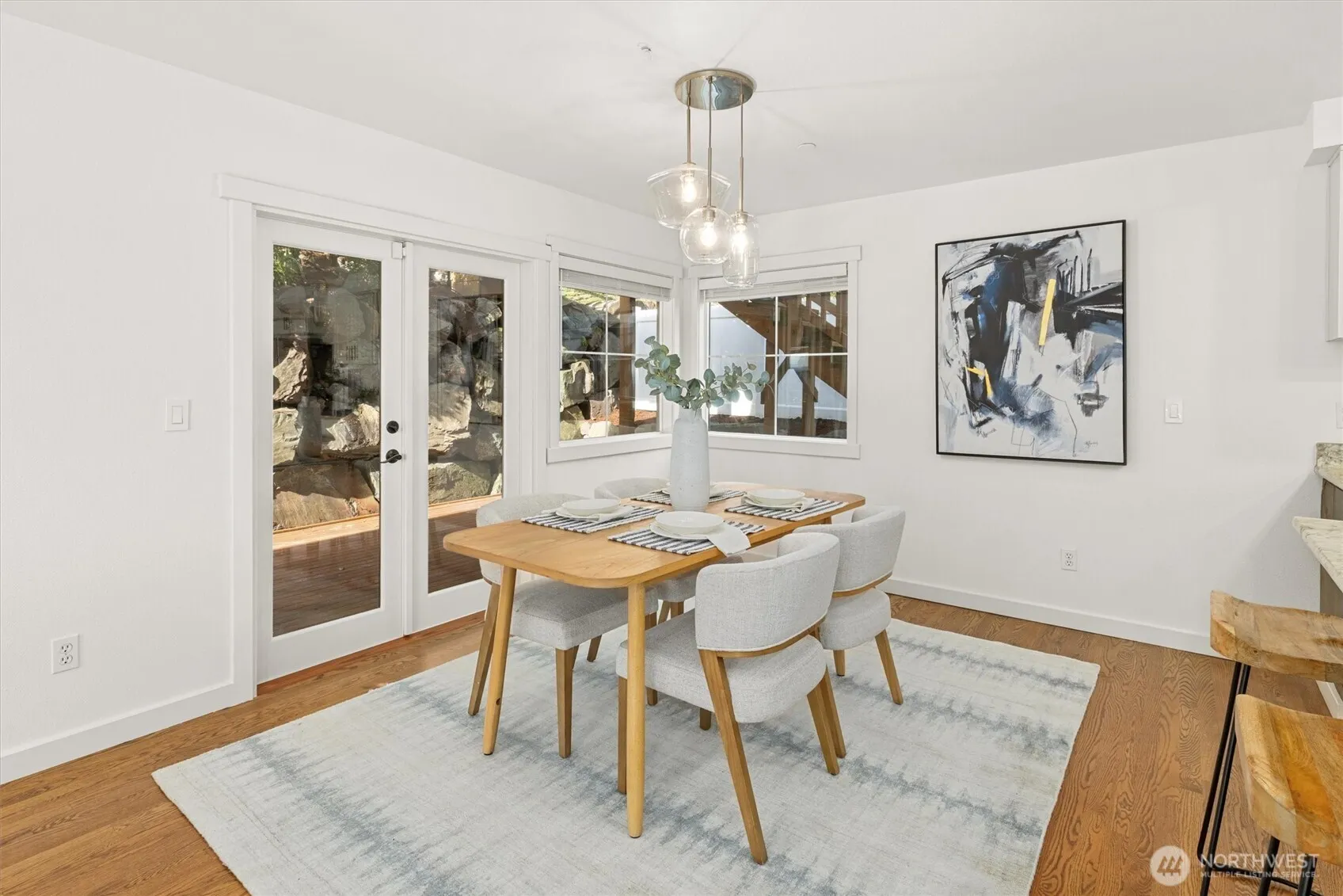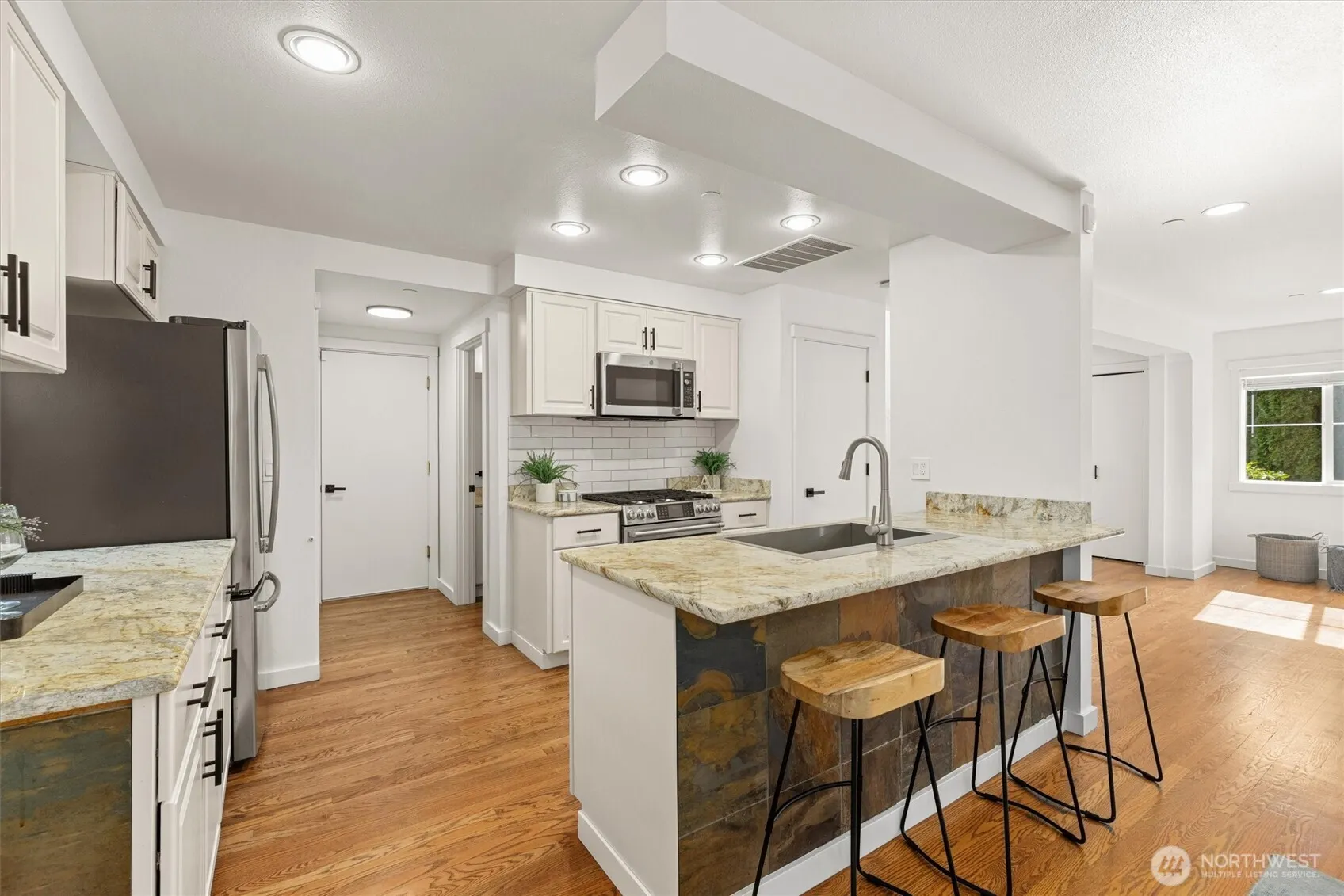 Welcome to this light-filled home on desirable Goat Hill, offering elevated views and just minutes from Juanita Beach Park, as well as Kirkland’s key amenities and commuter routes. Hardwood floors and a gas fireplace anchor the bright living room, while the open floor plan supports both everyday comfort and efficient use of space. The dining area extends to a covered wooden deck, creating a private outdoor setting. The primary bedroom enjoys sunrise exposure, natural light, and a renovated ensuite bath. An east-facing bedroom provides flexibility as a home office with scenic outlooks. Outdoors, the fully fenced, tiered yard features an upper deck with views of Lake Washington, Mt. Rainier, and vibrant sunsets. With A/C throughout and substantial updates including roof, gutters, furnace, paint, and renovated baths, the home offers move-in-ready confidence. Convenient to Totem Lake Village, Juanita Village, downtown Kirkland, major freeways, and Lake Washington schools, this property delivers comfort with strong location access.