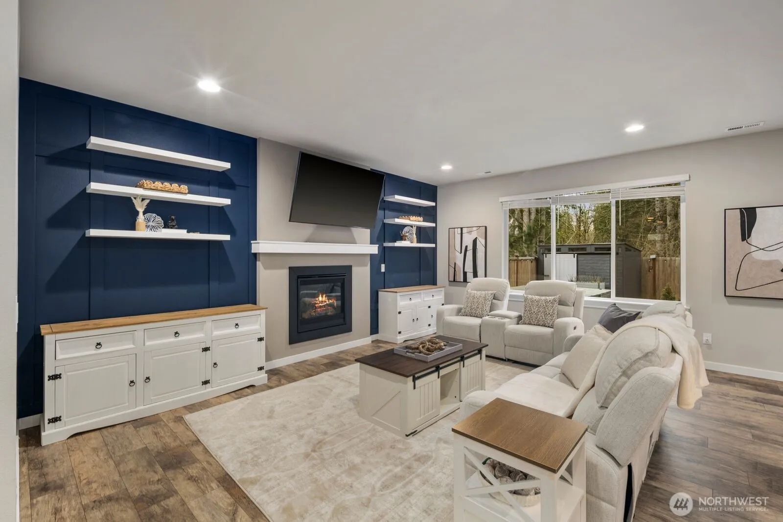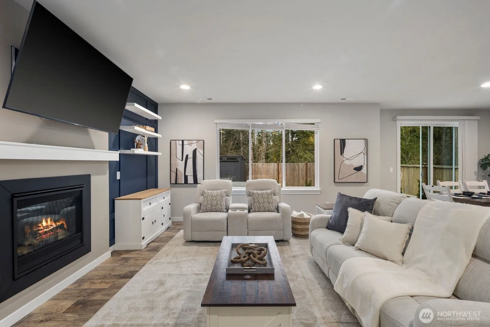 Stunning, like new home in the highly sought after Timbers community of Lake Stevens. Designed with both style and livability in mind, this light filled residence showcases a seamless open concept layout, luxury vinyl plank flooring, and expansive windows that bring the outdoors in. The living room is a true focal point, featuring a striking designer accent wall, custom built ins, and a dramatic floor to ceiling gas fireplace that anchors the space with warmth and sophistication. The gourmet kitchen is equally impressive, offering quartz countertops, stainless steel appliances, an oversized island, and a walk in pantry, all flowing effortlessly into the dining area for everyday living and entertaining. A main level bedroom and three quarter bath provide flexibility for guests, work from home, or multi generational living. Upstairs, a spacious bonus room offers the perfect retreat, along with four additional bedrooms including a beautifully appointed primary suite with a soaking tub, dual vanities, and a generous walk in closet. Step outside to a private, fully fenced backyard complete with a patio, hot tub, and peaceful backdrop of mature trees. Ideally located just minutes from Lake Stevens with wake surfing, boating, summer barbecues, and sandy beaches, plus easy access to parks, amenities, and commuter routes.