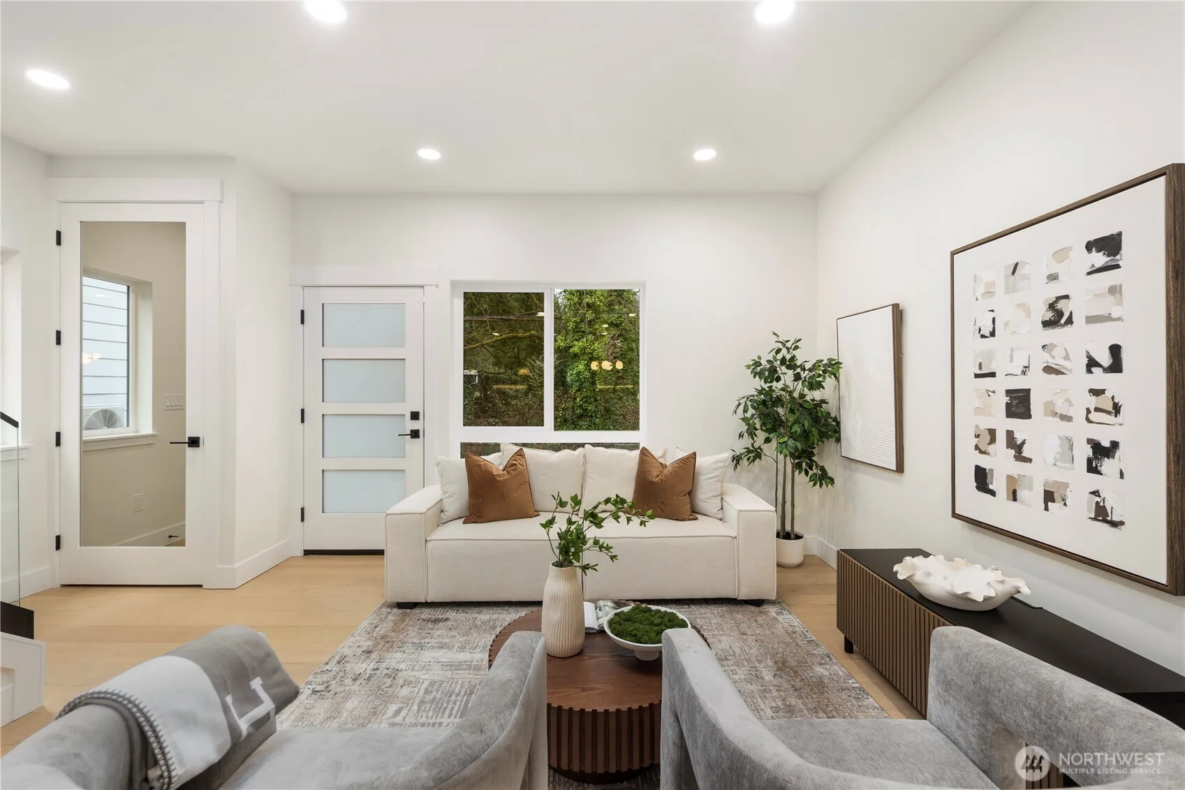 Artemis Homes presents a newly built modern residence on a desirable north-facing lot in the sought-after North Rose Hill neighborhood. Thoughtfully designed with clean architecture, efficient layout, and large windows bringing in natural light throughout. The kitchen features oak cabinetry extending to the ceiling, quartz waterfall countertops, full-height quartz backsplash, under-cabinet lighting, and a Thermador appliance package. A built-in desk or study workspace adds flexibility for work or daily use. The open living area offers recessed lighting, a frosted glass entry door, mirrored coat closet, and additional storage beneath the staircase.Upstairs features two spacious bedrooms including a primary suite with integrated cabinetry, built-in nightstands, vertical wood slat accent wall, and custom cabinetry pillars. Bathrooms include vertical stacked tile shower surrounds, gold and black fixtures, and backlit LED vanity mirrors. Additional highlights include 9.5″ wide plank European White Oak flooring, Carrier mini-split heating and cooling, recessed lighting throughout, and washer and dryer included.Outdoor features include a Trex deck, fully fenced yard, irrigation system, full-zone sprinklers, and a private driveway. Located near Mark Twain Park, North Rose Hill Woodland Park, I-405, shopping, dining, and trails.