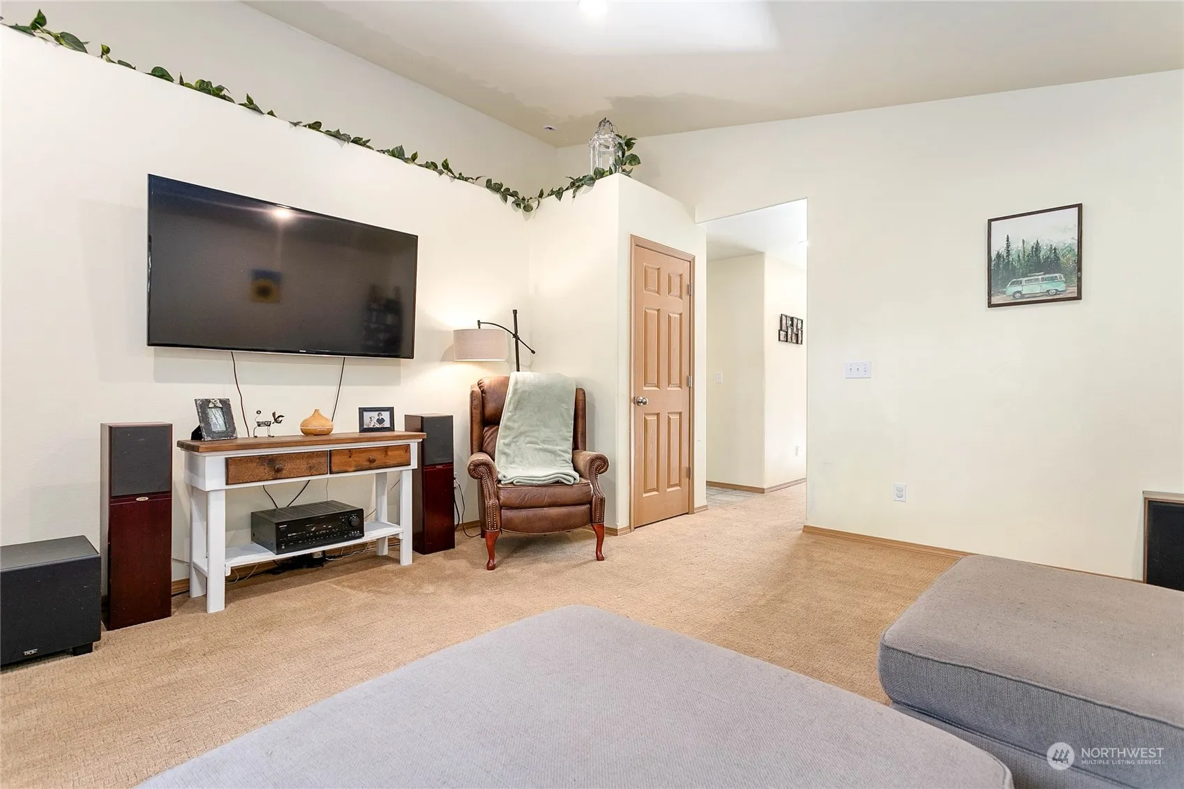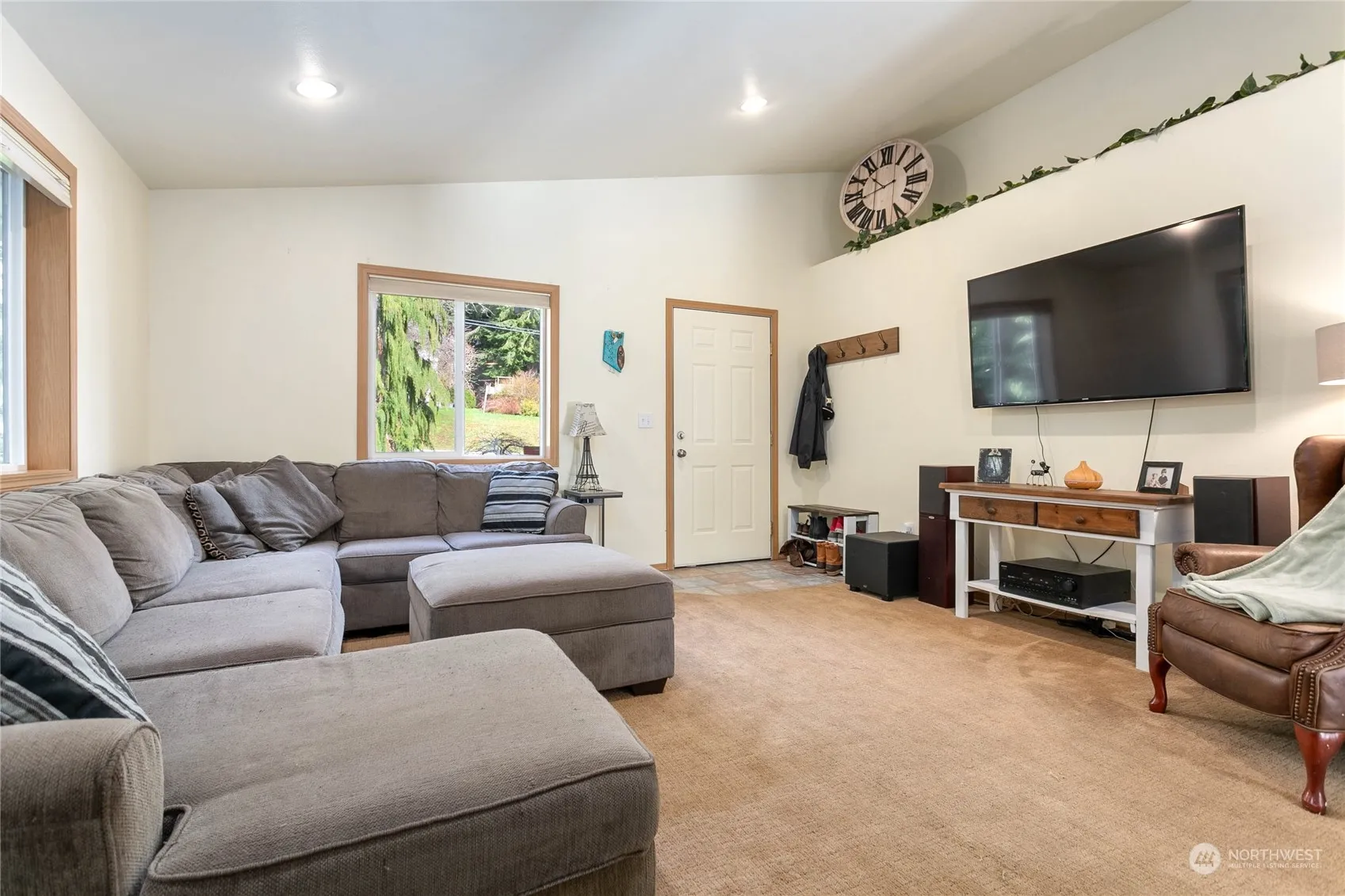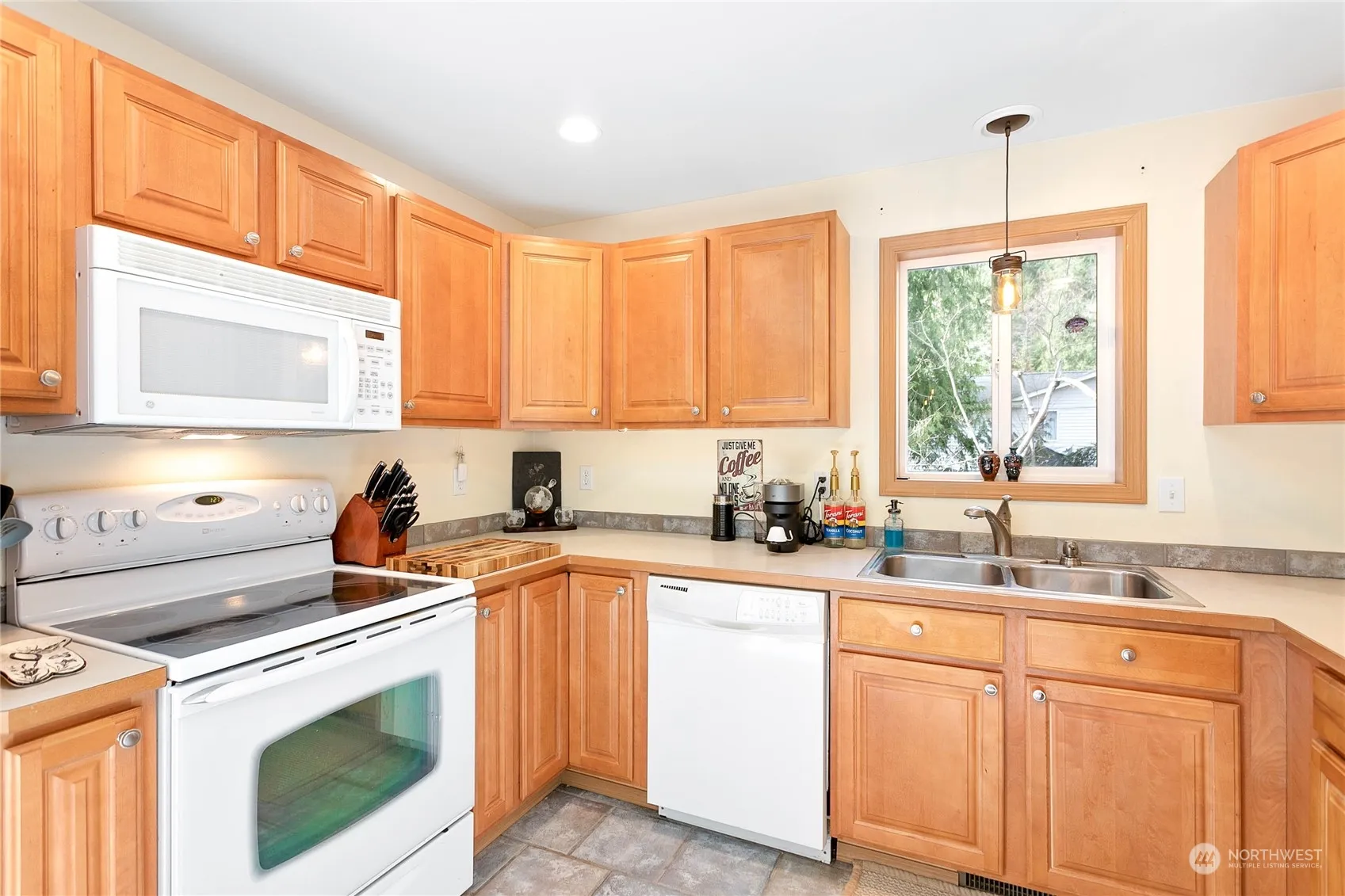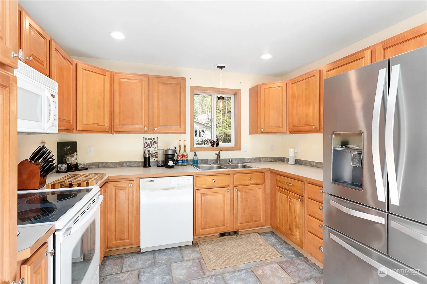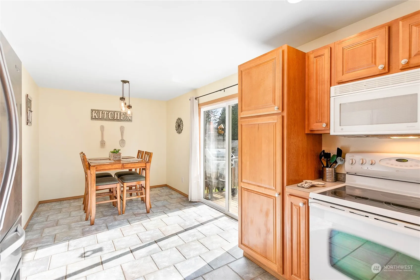 This charming and well-maintained home is nestled in the delightful Glenhaven community, boasting a spacious, inviting living room with high vaulted ceilings. The home features an efficient open-plan kitchen and a dining area bathed in natural light, courtesy of the sliding glass doors that lead to a back deck. The main level includes bedroom one or office space and a convenient half-bath with laundry. The upper level offers 2 cozy bedrooms and a full bathroom—the expansive primary features a walk-in closet and vaulted ceilings. Outside, the large fenced yard includes a garden shed all next to tall evergreen trees and a creek providing privacy. Additionally, the home offers a 2-car garage equipped with a built-in workbench and cabinets.