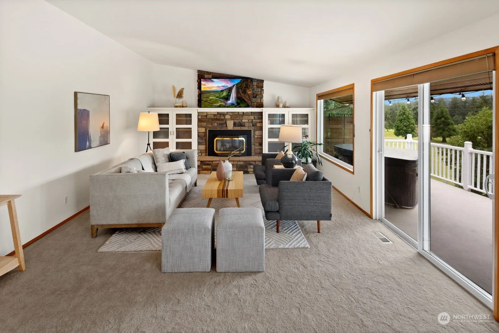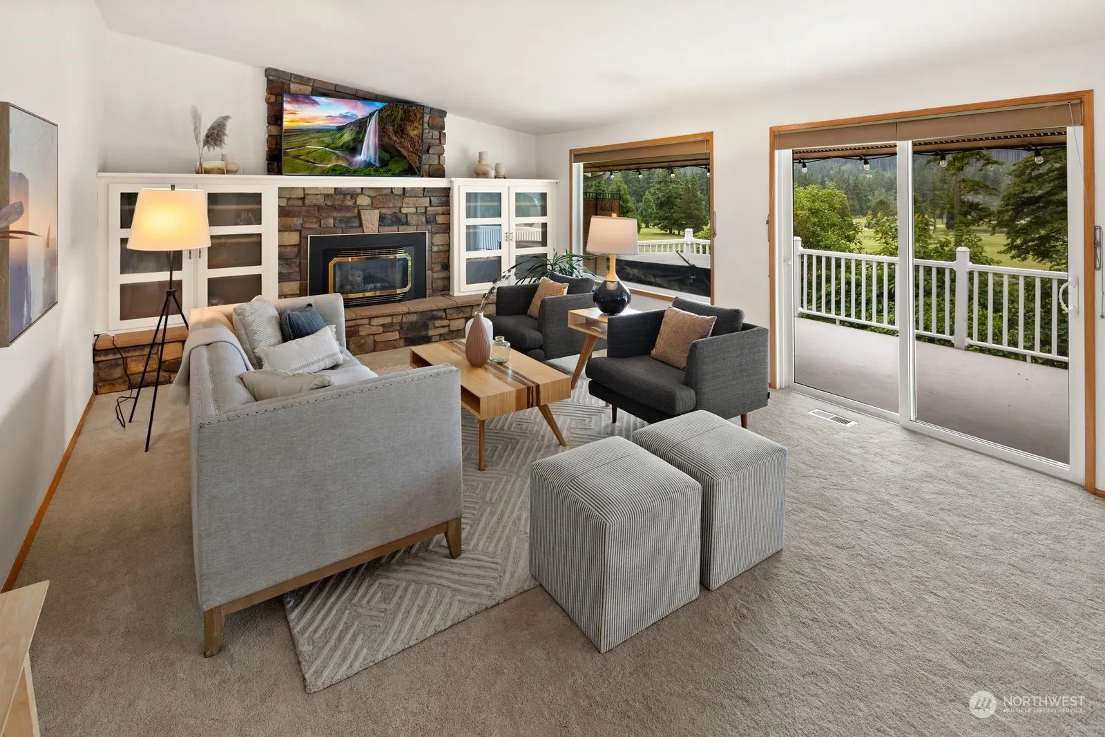 $10K Price drop! Welcome to Camaloch, a gated golf course community nestled in the rain shadow. West-facing VIEW home on 5th fairway gets lots of natural light. Open layout, vaulted ceilings, 2 fireplaces, fresh paint inside & new carpet. Spacious chef’s kitchen has granite counters, SS appliances, pantry, large drawers w/lots of cupboard space. Primary suite on main has walk-in closet & dual vanity. Daylight basement has bonus room/gym and media room w/murphy bed. 2 car garage, RV/boat parking, and your own Golf cart garage. Mature landscaping w/sprinkler system. HOA includes unlimited golf, 2 outdoor pools & fishing lake. Drive your golf cart to Camano Plaza: grocery store, shopping & restaurants. 1 hour drive to Seattle, no ferry needed.
