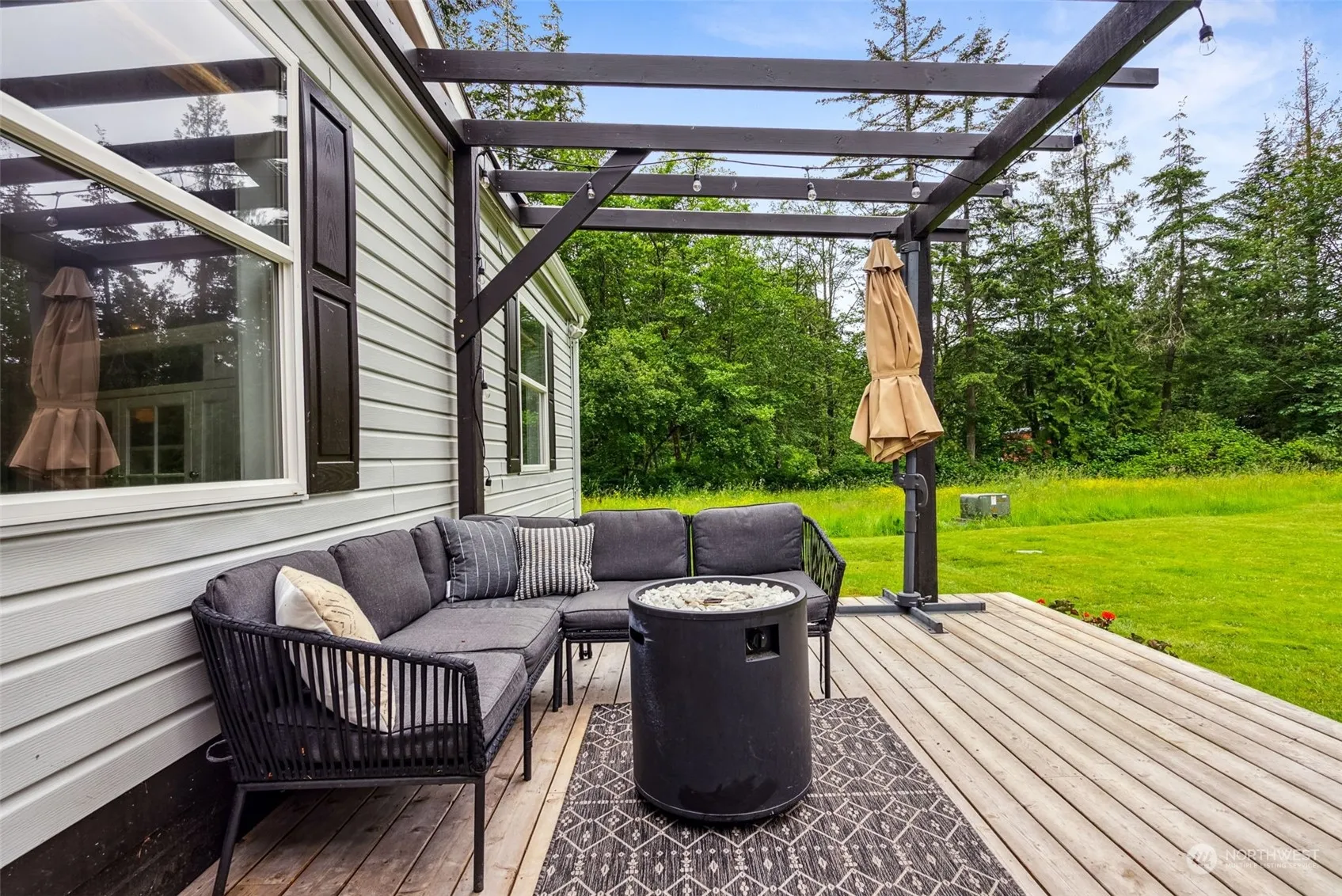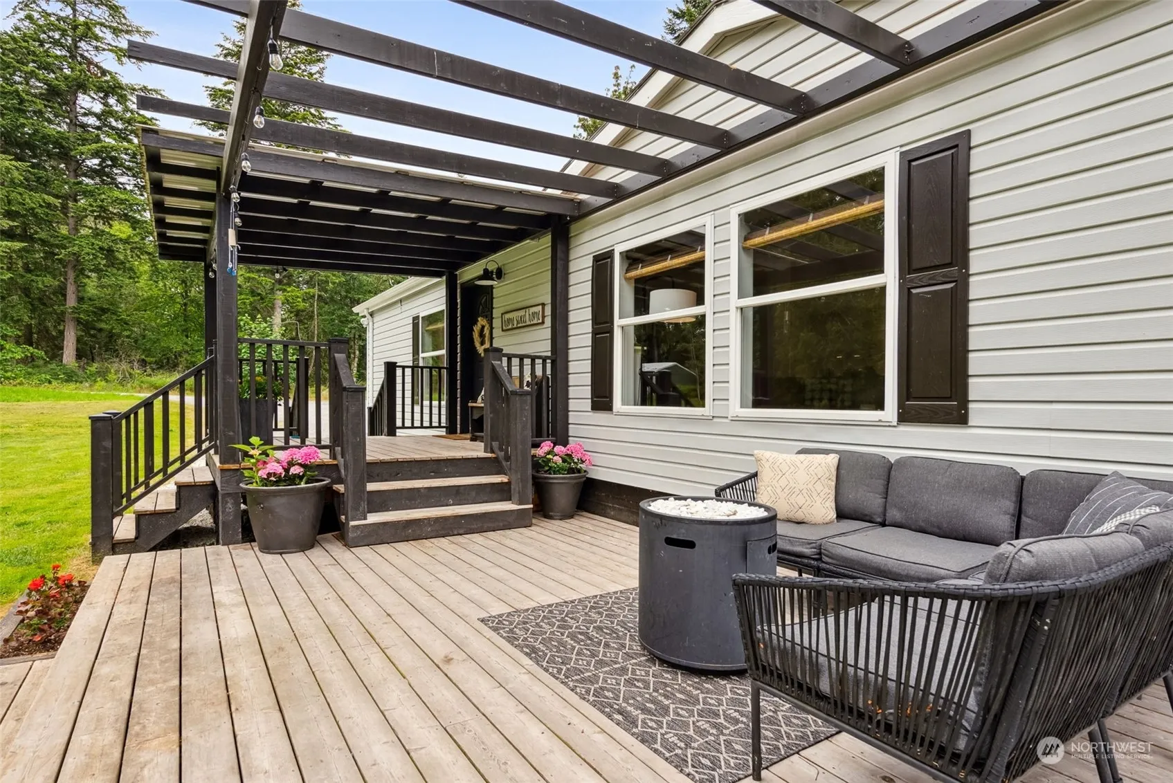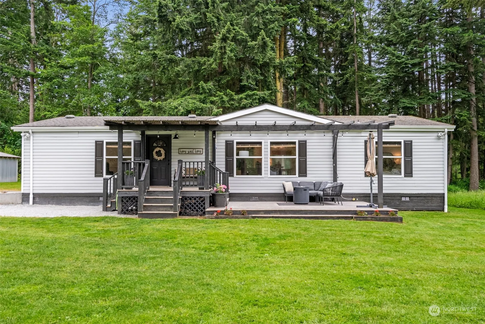 Storybook setting, this serene escape on sprawling 4.85 acres offers complete privacy. Tucked away past long driveway on the N. End of desirable Camano Island, this trendy home features white exterior & contrasting black accents. Lounge on 2-tier front deck overlooking spacious wooded & cleared property & adorable, newly updated well house. Home boasts vinyl tile flooring, white cabinetry & wood accents. Open floor plan w/ vaulted ceilings throughout spacious entry, adjacent living room, dining room & kitchen. Updated kitchen offers SS appliances & island w/ breakfast bar. Oversized primary bedroom w/ en-suite bathroom & WIC. Large shop for projects & parking. No HOA. Looking to build? Approved for 4BR septic. Island living w bridge access!