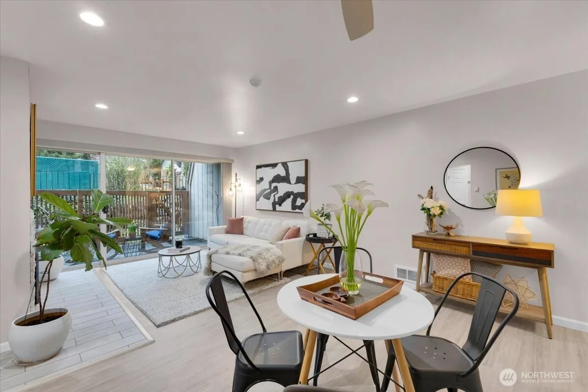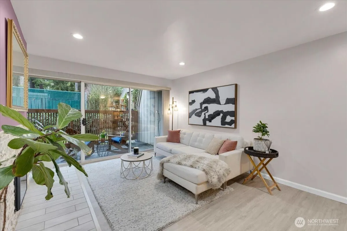Pre inspected and move-in ready. This bright and inviting ground-floor condo offers modern updates, comfort, and convenience in a highly desirable location. Fully renovated in 2019, the home features quartz countertops, modern cabinetry, updated appliances, newer flooring, recessed lighting, updated interior doors, trim, and more. The open-concept living and dining area is anchored by an electric fireplace and a large sliding glass door that fills the space with natural light while providing seamless access to the private patio. Two well-proportioned bedrooms offer peaceful retreats, complemented by a full bathroom with new vanity. Recent upgrades include electrical panel, Electrolux washer and dryer, new kitchen and bedroom window, and refreshed interior paint. Enjoy the outdoors with private patio with a storage closet, opening to a semi-private green space ideal for relaxing or pets. The grassy area connects to an upper pathway with convenient access to mailboxes and the community pool. Ideally located just minutes from Alderwood Mall with quick access to I-5, I-405, and the Lynnwood Light Rail Station, this home offers an easy commute. HOA dues include water, sewer, garbage, and common area maintenance, making this truly turnkey living. Inspection Report Available upon request.