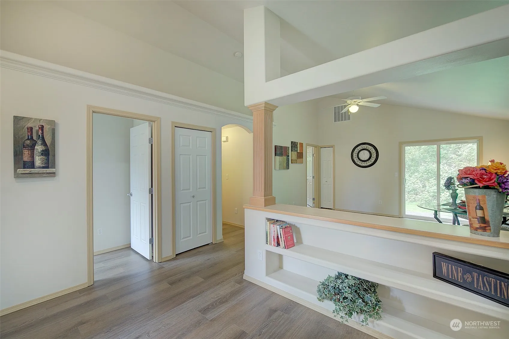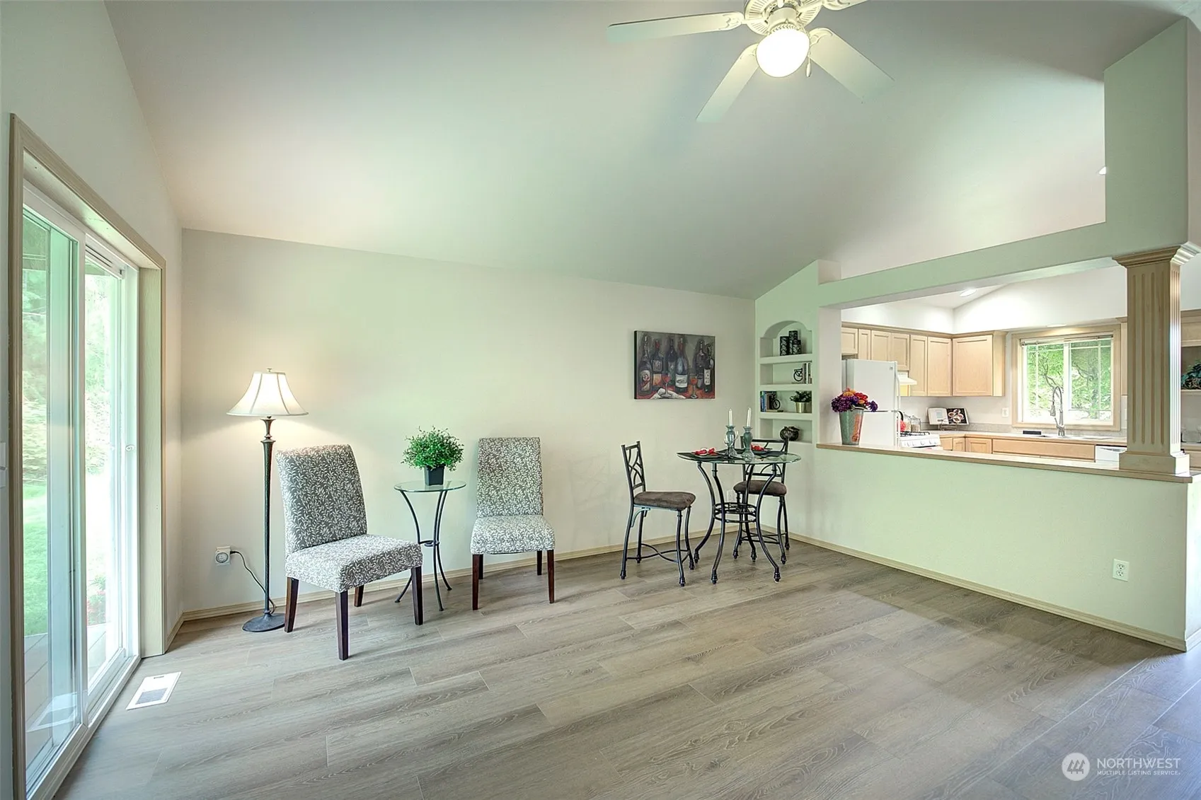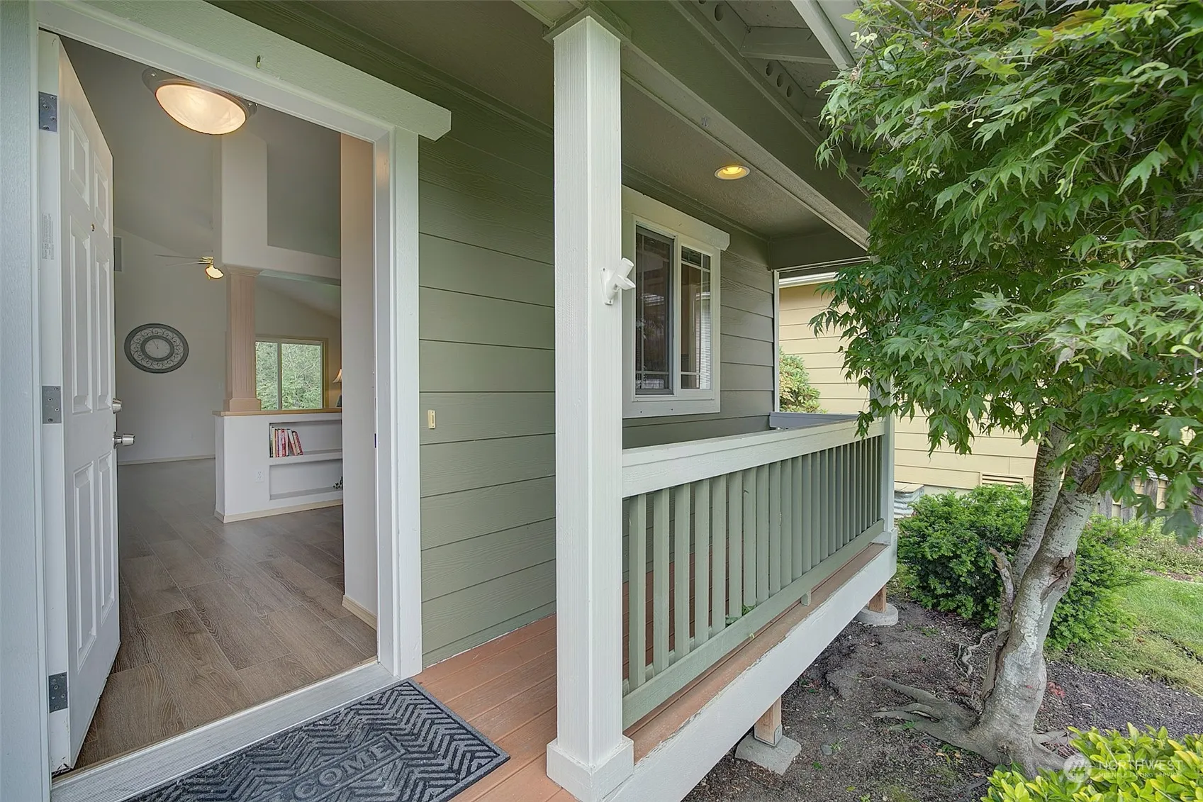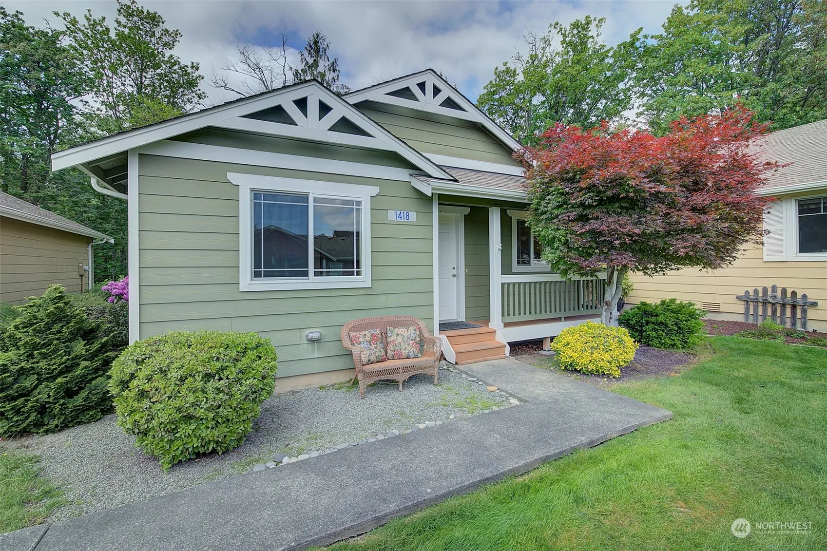 Newly installed 30-year roof with transferable warranty! NEW vinyl planking floors, paint throughout, sink & faucet in the kitchen. Newer dishwasher and stove. Light and bright, this two-bedroom home lives large with an open concept kitchen, dining room and great room which includes vaulted ceilings, ceiling fan and built in bookshelves in kitchen and dining room. In home washer and dryer make this home complete. Detached one car garage with parking in front of garage and an assigned spot (3 spots total). Covered front & back porch. Relax at the end of the day enjoying the view and sounds of nature emanating from the expansive green space behind the home. Truly a delightful place to call home with yardwork included in your HOA dues.