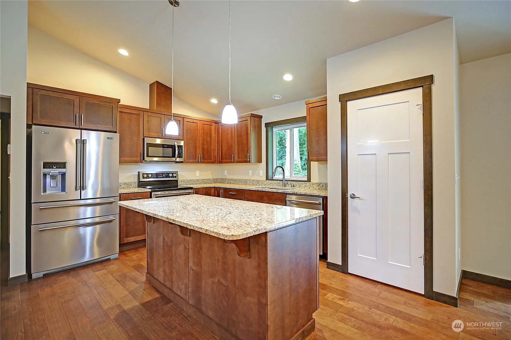 Step into this beautiful and inviting 2017-built split bedroom rambler. Vaulted ceilings and tall windows in the main room create a sense of openness and natural light, complemented by the cozy corner fireplace. Hardwood floors throughout main living and plush carpet in bedrooms. Gourmet kitchen features granite counters, ss appliances, and a slider to the back deck. 2 large bedrooms & main bath are conveniently located on one end, while spacious master suite on the opposite side features a stepped ceiling, walk-in closet, and a luxurious tiled shower with double sink in the en suite bath. Large 2 car garage. Heat/ac pump with propane backup & tankless HW. Outside, enjoy the large yard, fruit trees, & ample parking. Your dream home awaits!