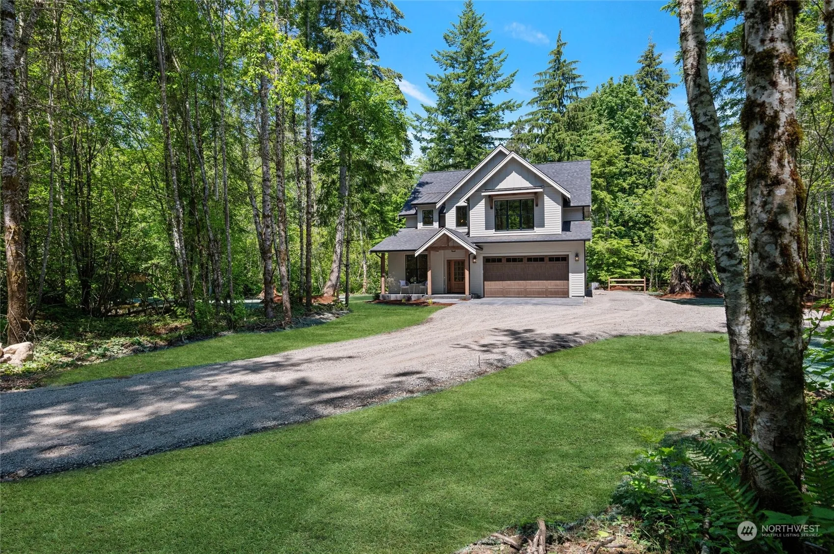 A luxury, private county home in a new development located on a dead end street equidistant between Seattle and Vancouver! This 2,600+ square foot home features high end finishes set in a private cedar glade with native trees, mountain vistas and great light. You’ll love the vaulted ceilings, and spa-quality bathrooms complete with waterfall showers and linear drains, gourmet kitchen with all SS appliances, expansive great room, huge primary suite, plus 3 bedrooms, and an office/den. This modern farmhouse style home has wide plank oak floors, a stone fireplace, a covered outdoor patio just off the living room, and generous living spaces throughout. With quick access to I5 and Mt. bike trails, this custom home deserves a look.