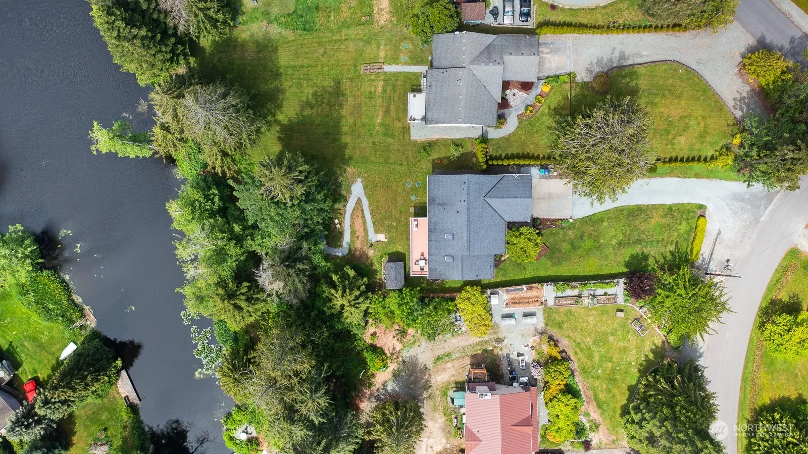 Captivating lakefront abode in tranquil Camano Island. Inviting covered porch, bright airy interiors with beautiful bamboo floors & soaring ceilings are just a few of the main level features. Embrace the warmth of a propane fireplace and relish the lake views & wildlife from the spacious deck. Large chef size kitchen boasts stainless steel appliances, granite countertops, & island seating. Main floor primary suite with walk-in closet (w/d hookups) & en-suite bath. Lower level includes a generous rec room w/pellet stove, utility room, additional bedroom, office/den & full bath. Access the covered patio, garden shed & sprawling landscape with lake access for use of your kayaks or toys. Don’t miss the opportunity to own this delightful home!