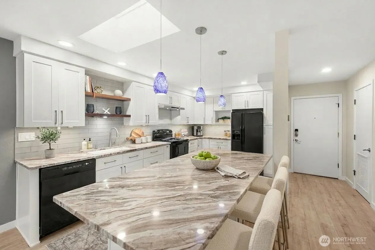 Unique lake front 2 bed 2 bath top floor unit in prime Redmond location. Private “Deeded” boat dock. Stunning unobstructed lake views from your living room & private covered deck. Completely remodeled W/everything updated. Upgraded kitchen, walls removed to create a gourmet kitchen with oversized island & open floorplan. Wide plank flooring, top of the line soft close cabinets with, pullouts, lazy Susan, under cab lighting and custom storage solutions. Light filled unit with multiple large windows and skylight. Upgraded remote control electric modern fireplace with heater. 2 generous sized bedrooms. 2 completely remodeled bathrooms with LED lighted storage cabinets. 2 dedicated parking spaces. One carport space with a covered breezeway to get to the building. Gated pool, hot tub, fire pit area, dock and green space for lake side entertaining. Kayak, bicycle storage. Lockers for gas storage. Private storage in locked common area. Secure building. Well maintained community on the shores of Lake Sammamish. Community Dock. No rental cap. Minutes to Marymoor, Idylwood beach park, major tech employers, light rail, public transportation and excellent freeway access. Please see feature sheet for all the extras this well-loved home has to offer. Unit measures 1150 sq ft see floorplan. Move in ready, be in by summer to enjoy lake front living. Rare opportunity!