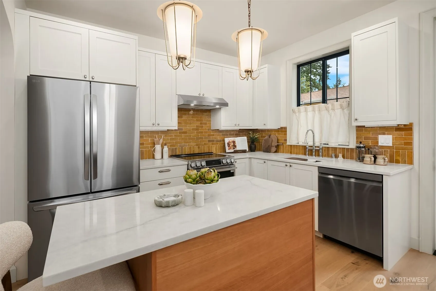 Artisan luxury defines this 2-bed + den Edmonds new-construction built by local Westerly. Old-world charm woven throughout. Open floor plan with arch that gently defines living area from kitchen and dining. Statement kitchen with ochre Zellige tile backsplash, prep island, stainless-steel appliances, quality Bellmont cabinetry, and huge walk-in pantry. Designer touches from living hardware that develops patina over time to upscale lighting. Inviting dining space with custom built-in banquette: furniture-style details and French ticking cushions. Upstairs the primary suite and 2nd bed feature vaulted ceilings. Primary bath and hallway bath blends vintage details with new. Roomy den/office could double as nursery. Built-in bookcase with hidden water heater. Oversized windows and wide-plank oak hardwoods. Golden Age design meets modern livability with too many features to list: mini-split heat pumps, mudroom nook, iron-detailed staircase, fully-fenced turf backyard with Trex deck, heated 1-car garage with space for gym and storage