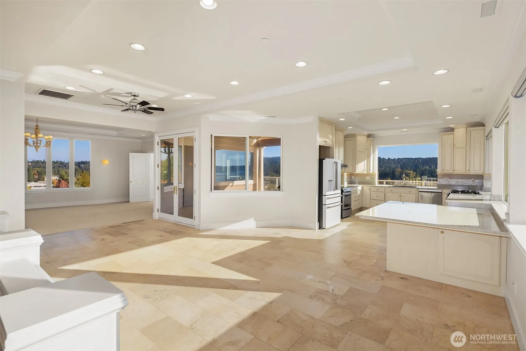 The panorama is permanent, the address irreplaceable.~6,927 SF. 7 bedrooms, (6 BR) with their own ensuite. 12 bathrooms total. Two residences. One address. Positioned high above Lake Washington, at Lake Top, the water doesn’t frame the room. It fills it. From every floor, through every window: shimmering open water, the Olympic Mountains on the western horizon, and Kenmore Air floatplanes tracing arcs across the surface below. The building’s height is grandfathered under current zoning. It cannot be built again. Two complete luxury residences, one above the other, both with 11ft crafted tray ceilings with crown molding. Each residence features master-level laundry and a second W/D on the lower level. The Upper Residence has a private 3-stop elevator. The Lower Residence has the shaft, fully framed, structurally prepped. The bones are there. The decision is yours. The Upper Residence (3,902 SF | 3 bed | 4.25 bath): travertine marble floors with radiant heat, a fully equipped lake-view kitchen served by two additional lake-view wet bars, a gas fireplace, a vaulted pavilion with classical columns open to the water, a curved five-window gallery, and a five-piece marble spa bath with crystal chandelier, Velux skylights, soaking tub, and walk-in shower. The Lower Residence (3,025 SF | 4 bed | 4.50 bath): cherry cabinets, granite countertops, SS appliances, gas range, a gas fireplace, HW floors, and a glass-railed lake-view deck. Two residences. One address. Welcome to Lake Top.