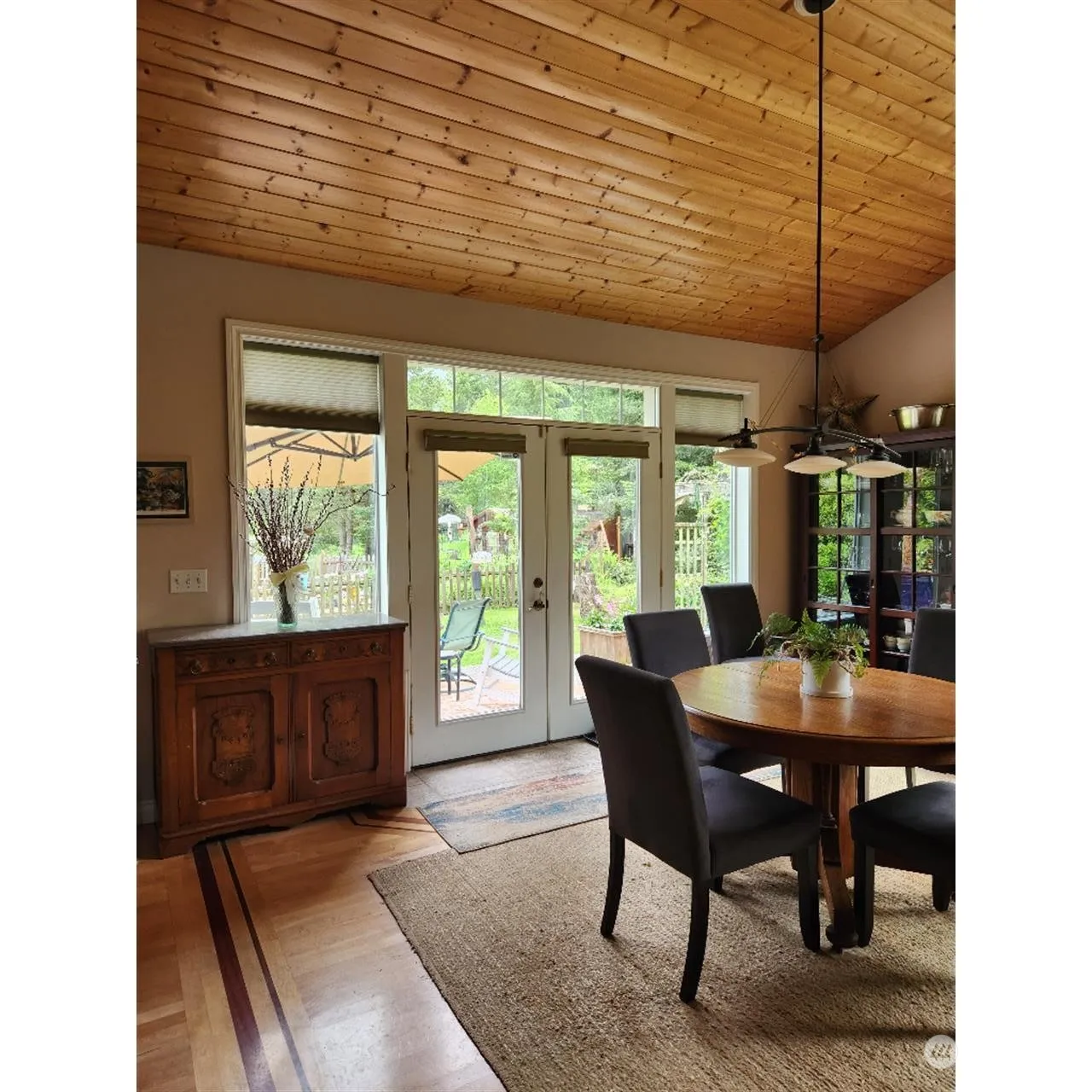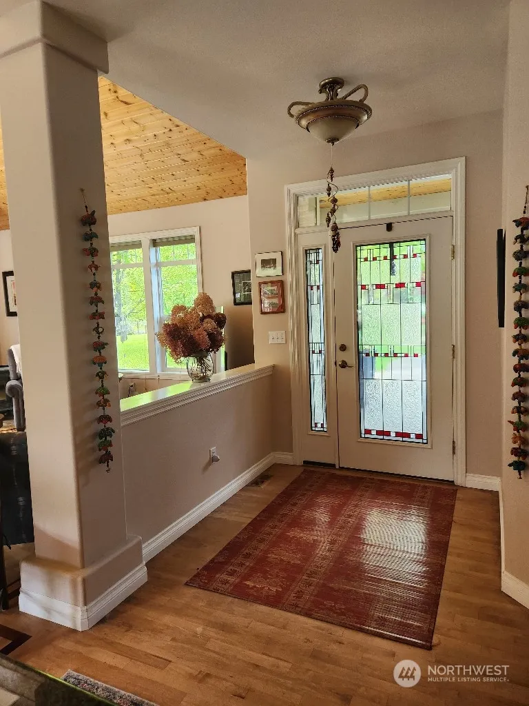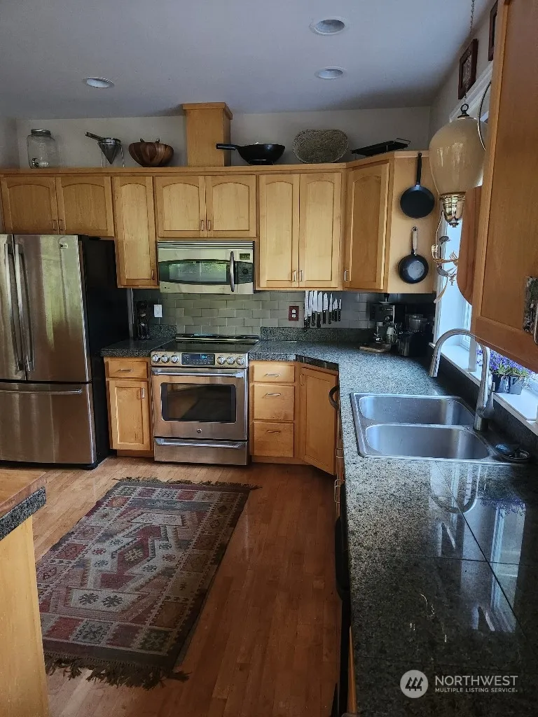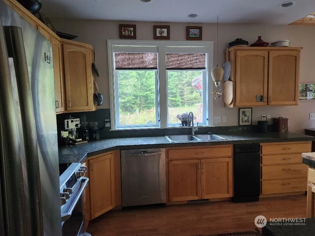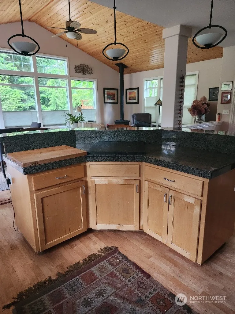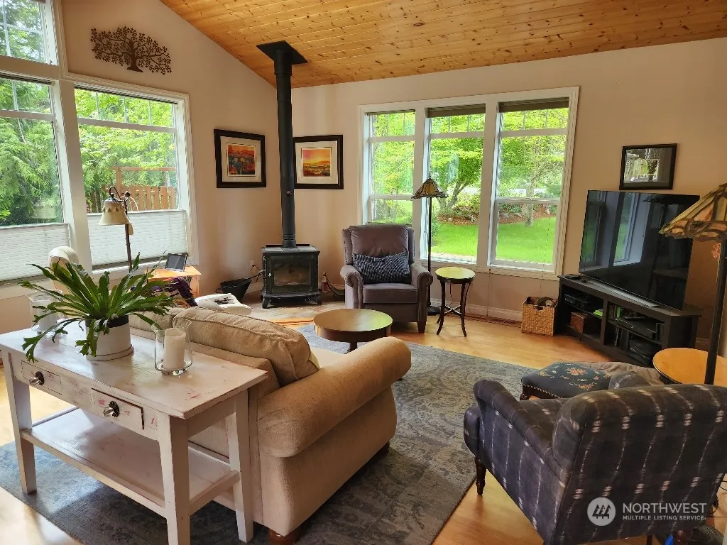 2 wooded acres; Loads of custom features – unique hardwood floors, maple cabinets, granite counters, vaulted wood ceiling. Soapstone woodstove (w approx 3 cords of wood staying). Custom closets; Huge windows throughout. South patio accessed by the dining room and master bedroom. MBR customized walkin closet. A separate private patio with a hot tub is accessed through MBR bathroom. Lg. portion of prop is fenced to keep pets in and deer out. extended side patio. Greenhouse w running water & electricity; shed large enough 4 storage or workshop. 2nd fenced area for flowers and vegetables. Fenced orchard is at the front of the property. 15 Kw generator and hot tub stay with the prop.