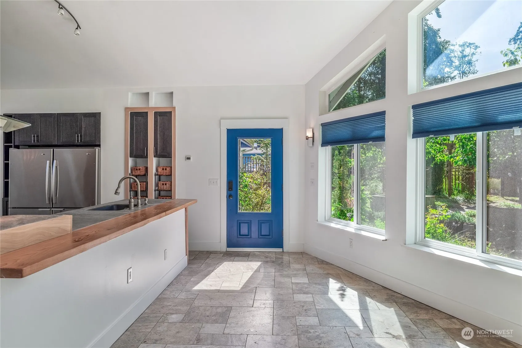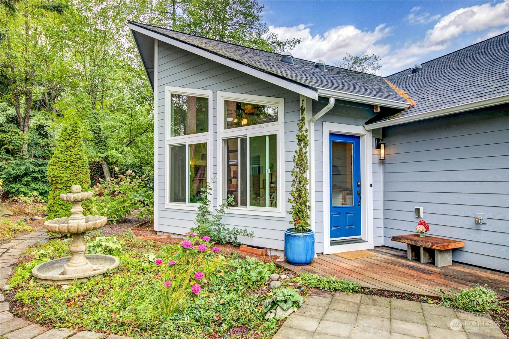 Home on 2 lots only. Sparkling clean and move-in ready! Garden-wrapped home with entrance leading to an open kitchen with w/light streaming through floor-to-ceiling windows. Vaulted ceilings, modern lighting, and a walk-in pantry make this an entertainer’s dream. The primary wing has two primary bedrooms, a spa bath, & laundry. An additional bedroom, bathroom, and studio on the other side of the house with a separate entrance that can serve as a home office or guest suite. Travertine floors throughout. Enjoy a gazebo for year-round al fresco dining and a double-car garage. Incredible one-story home in city limits close to trails, schools & town.