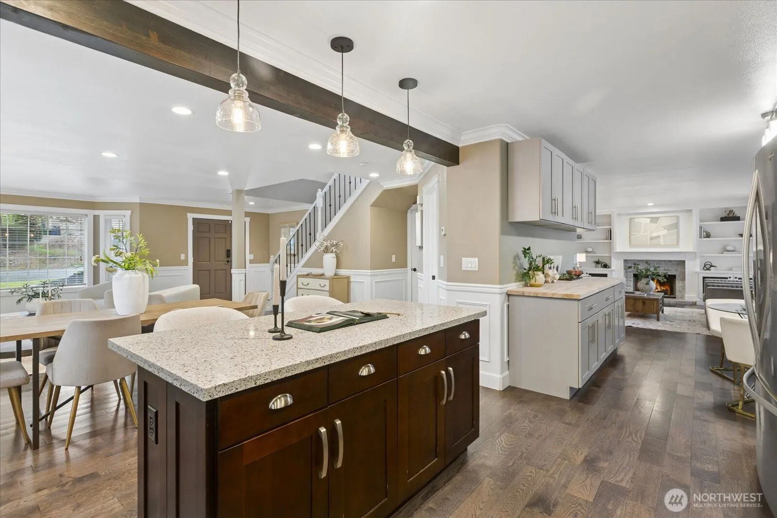 Welcome to Gleneagle! Ideally positioned on a desirable corner lot, this beautifully designed home showcases an open-concept layout with rich hardwood floors, custom wainscoting, elegant trim, and crown molding throughout. The spacious kitchen serves as the heart of the home, featuring a large center island, stainless steel appliances, buffet bard, and cabinetry that blend style and functionality. Sliding doors off the kitchen lead to a covered deck and fully fenced backyard, perfect for year-round entertaining, outdoor dining, or relaxing while enjoying the privacy of mature landscaping. The adjacent family room offers a warm gathering space with a cozy fireplace, custom mantel, and built-ins. A convenient half bath and access to the heated two-car garage complete the main level. Upstairs, a striking wrought-iron staircase leads to the private upper level where the spacious primary suite awaits with walk-in closet. Three additional bedrooms, a full bath, and utility room complete the upper level. New carpets and fresh exterior paint enhance the home’s move-in ready appeal. Ideally located near community activities, the Centennial Trail, and convenient shopping and dining, offering the perfect blend of neighborhood charm, outdoor recreation, and everyday convenience.