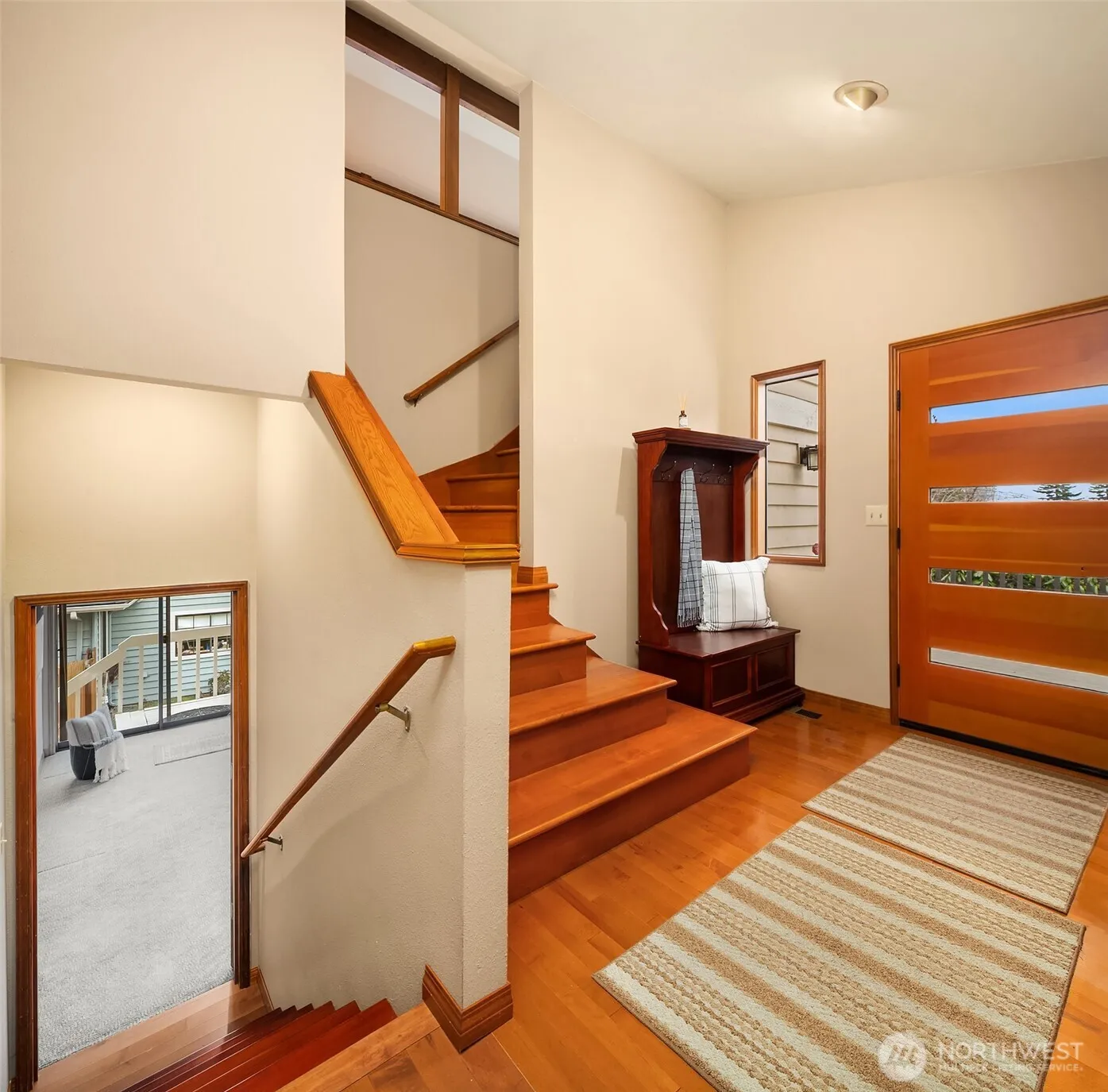 4-bed walkable Edmonds Bowl home privately tucked on 7th Ave. Top floor great room w/ vaulted beamed ceilings & details. Oversized windows w/ views of the Puget Sound & Olympics. Wood-burning fireplace. Updated kitchen w/ shaker-style maple cabinetry, slab quartz countertops, & all SS appliances. Hardwoods throughout. 3-beds on main including the generous Primary Suite w/ ¾ en suite bath featuring dual sinks, large walk-in shower with glass barn-style door & skylight. Walk-in closet. Huge lower-level bonus w/ built-in media cabinet & gas fireplace. Front & back decks extend entertaining outdoors. Tankless water heater. Turnkey & meticulously maintained. Walk to farmer’s market, shopping, coffee, & eats.