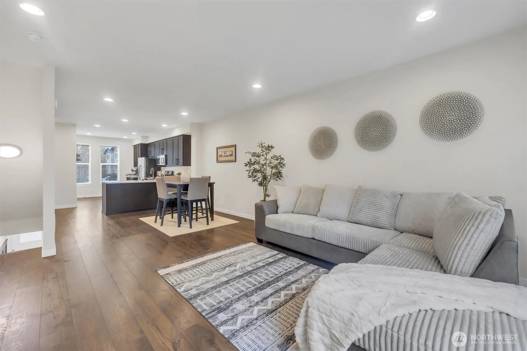 Spacious and bright open-concept layout on the main floor with kitchen, dining, and living areas. The kitchen offers plenty of counter space, a huge breakfast bar, and high-end finishes like laminate hardwood floors, quartz countertops, and stainless-steel appliances. Upstairs, the primary suite features side-by-side closets and a luxurious full bath, while the second bedroom has its own en-suite bathroom. Convenient upstairs laundry, a balcony, and a tandem attached 2-car garage add to the appeal. Community perks include a playground, soccer field, and basketball court, with Lake Stickney and a dog park just a short distance away. Close to Boeing, Paine Field, and in the Mukilteo School District.
