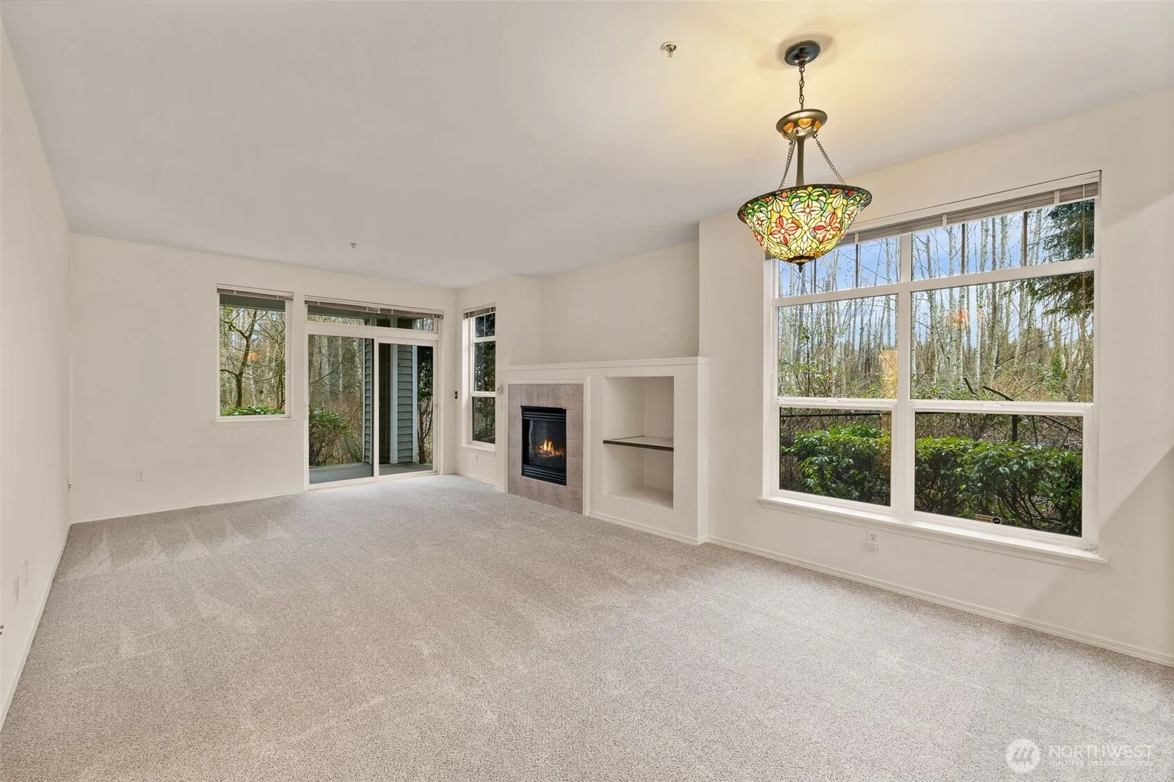 Well maintained, desirable end unit opens onto a protected greenbelt of woods, ponds and wildlife. Private patio off living room is covered and has an outside storage closet. Spacious living room features built in bookcases, gas fireplace and dining area. Kitchen offers lots of cabinets and countertop work space. 9’ceilings and transom windows give the unit a spacious feel. 2nd bedroom for guest or office. Two baths, one off primary, one with tub. Large separate laundry room with washer/dryer. All appliances and window coverings included. Fresh paint and new carpet throughout. Single car garage attached allows secure entry into unit and provides additional storage space. The Woodlands is a well established community with a great clubhouse for large gatherings and a playground for little ones. Easy access location and bus service on 128th St. S.W. Don’t miss this one!