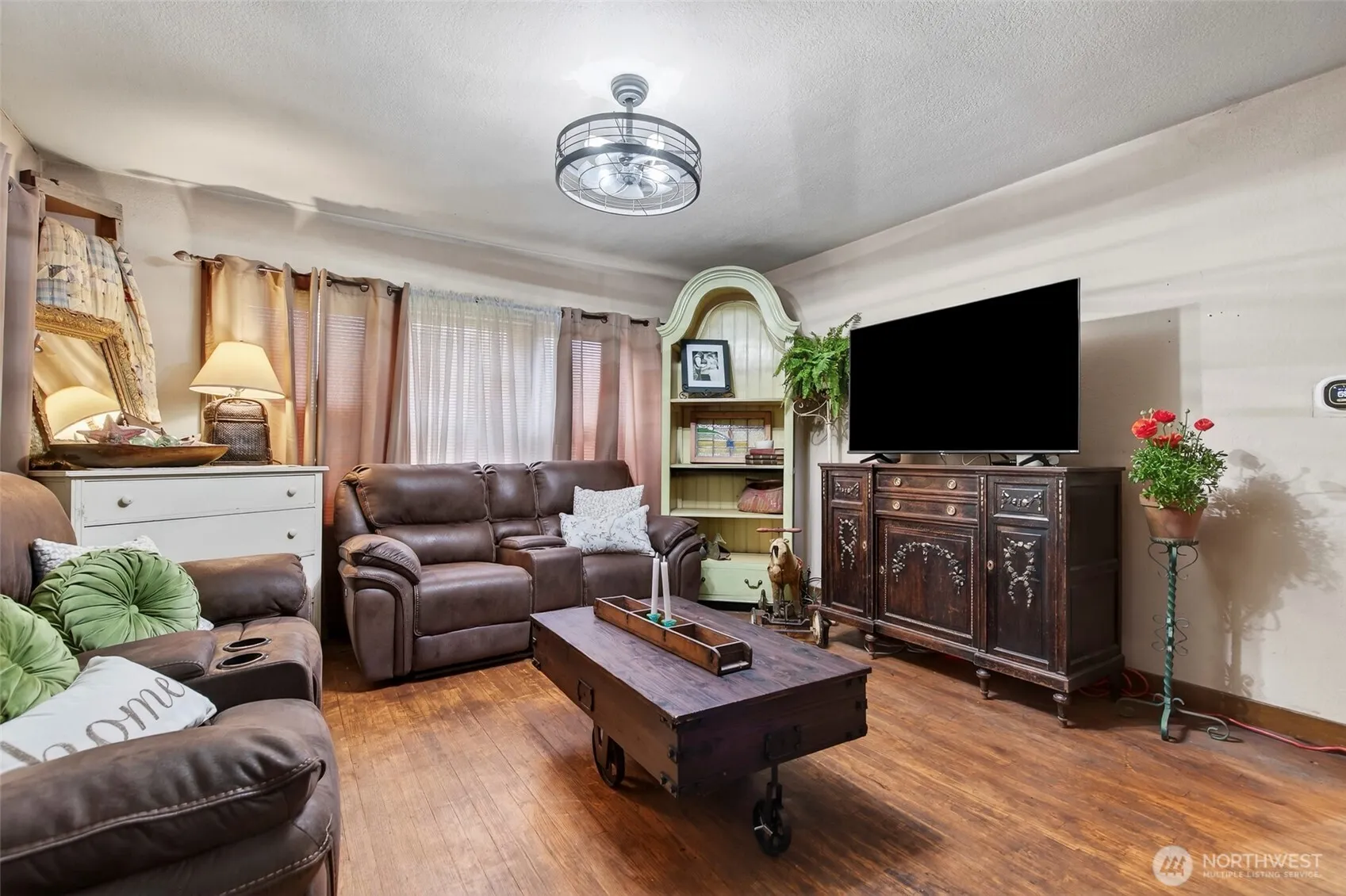 This 100-year-old ranch-style home offers character, space, and practical updates. A large covered front porch welcomes you in and provides a great place to relax. Inside, you’ll find real hardwood floors, glass door knobs, and classic details throughout. The main level features a comfortable living room with window coverings, a dining area, and a functional kitchen with laminate countertops, stainless steel appliances, electric range, microwave, and LG dishwasher. Off the dining area is an additional bedroom and laundry space, along with a nearby family room that opens to the backyard through a sliding glass door, creating a flexible layout for everyday living. Upstairs includes two dormer-style bedrooms with hardwood flooring, blinds, and built-in closet spaces. The upper level also features a bathroom with a shower stall and a convenient coffee bar area. Major updates include a new roof and central heating and air conditioning system installed in 2025. The backyard offers space and versatility with multiple outbuildings, garden beds, fire pit area, and access from a rear road—ideal for adding a shop or additional entry