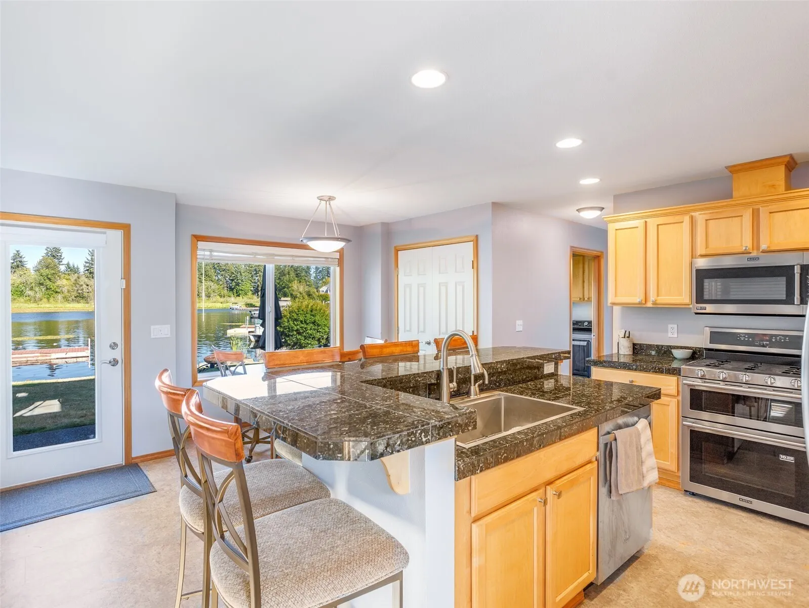 Unrivaled no bank waterfront on Long Lake! Find yourself in the most serene part of the lake. Here you will not find high speed boats and jet skis but you can still enjoy them by easy access to the part of the lake that allows. In this part of Long Lake you will find plentiful wildlife and bird watching. This home boasts comfortable Cortec Smart core solid surface flooring, solar panels, Hot Tub, Electric car hookup, garage large enough for either three cars or two cars and a boat. On demand water heater for no cold showers! Extra plush carpet with high end pad. PABCO Prestige 50-year roof installed 2025, New paint, Boat lift with key fob to operate while in the boat. Very close to I5, restaurants, and shopping. Come see today!