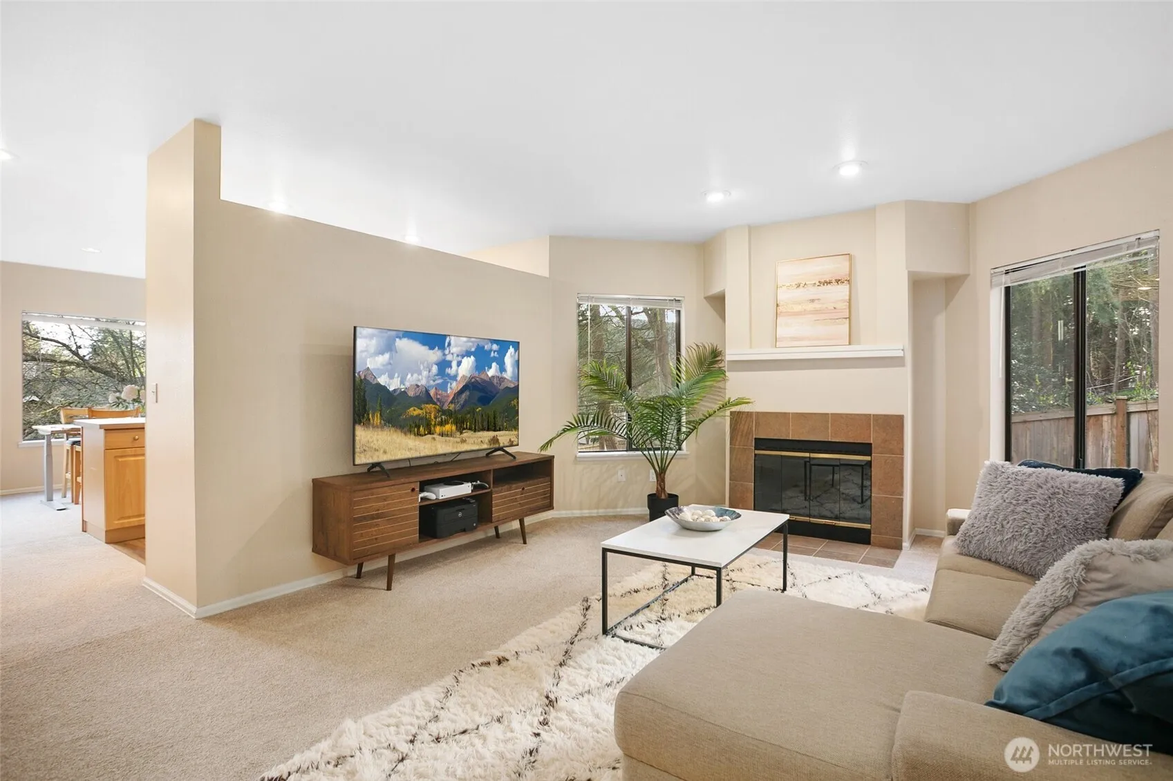 Beautifully well-maintained 2-bed, 1.75-bath ground-floor condo in desirable Pointe East! A welcoming formal entry leads into a bright, airy living space with soaring vaulted ceilings and a cozy wood-burning fireplace. The open layout flows seamlessly into a spacious kitchen and dining area with direct access to a private patio and serene green space—perfect for relaxing or entertaining. The generous primary suite offers room for a king-size bed, double closets, and a large ensuite bath. A second bedroom, guest bath, and full laundry room add to the functional layout. Enjoy both carport and garage parking. Community amenities include a clubhouse, gym, outdoor pool, and hot tub. No rental cap—ideal for investors! Conveniently located near shopping, dining, parks, SR-520, with Microsoft, SpaceX, and downtown Seattle just minutes away. Close to new light rail. New windows and siding coming soon, adding future value!