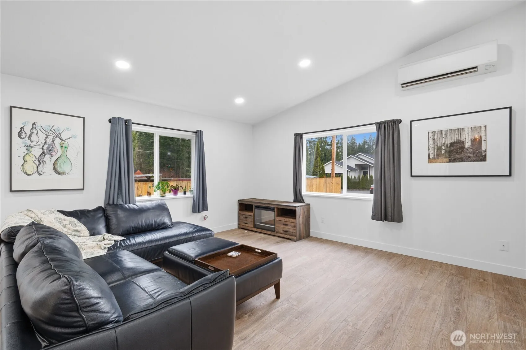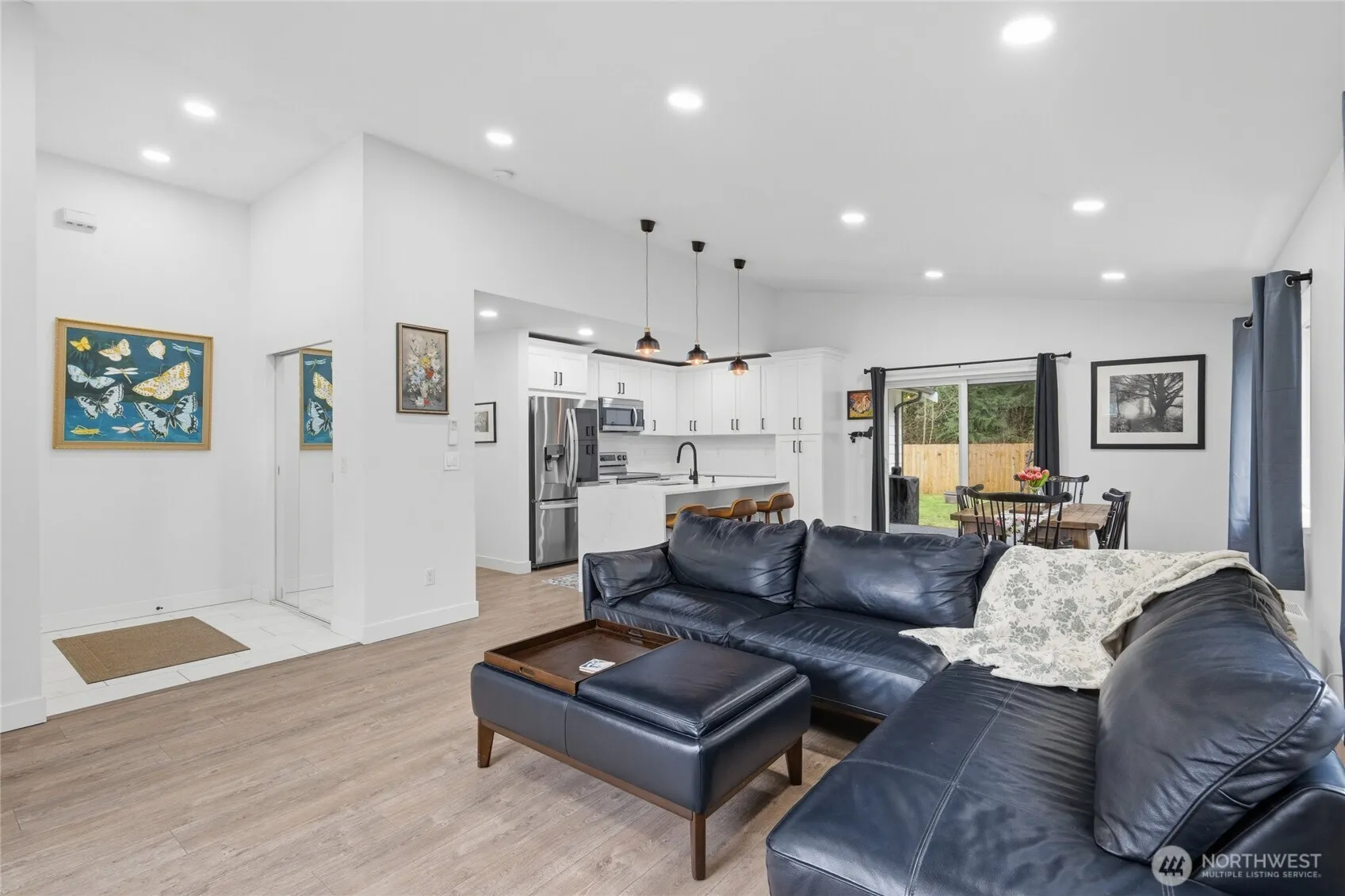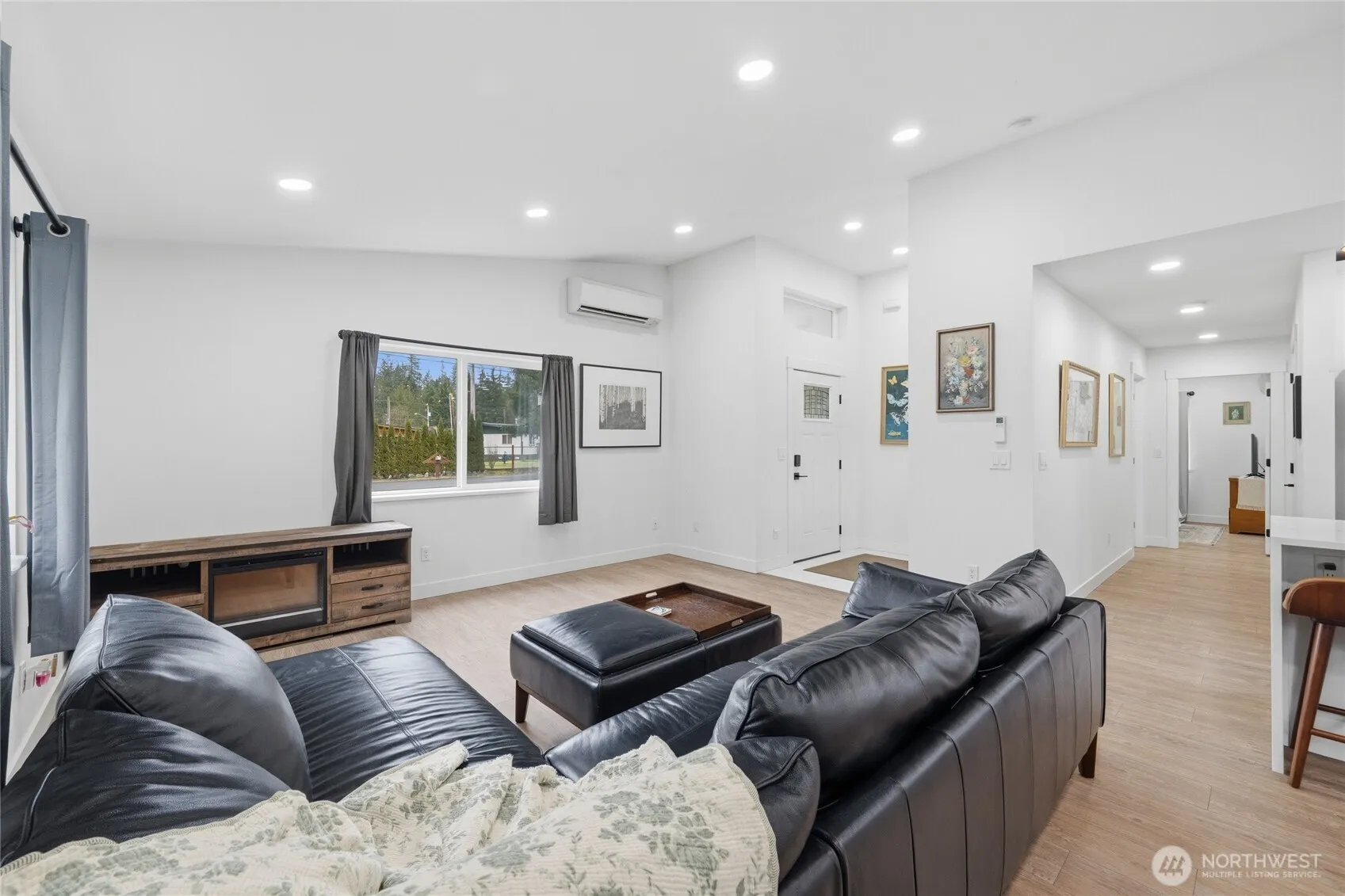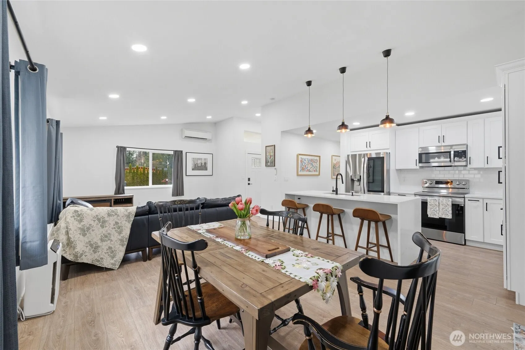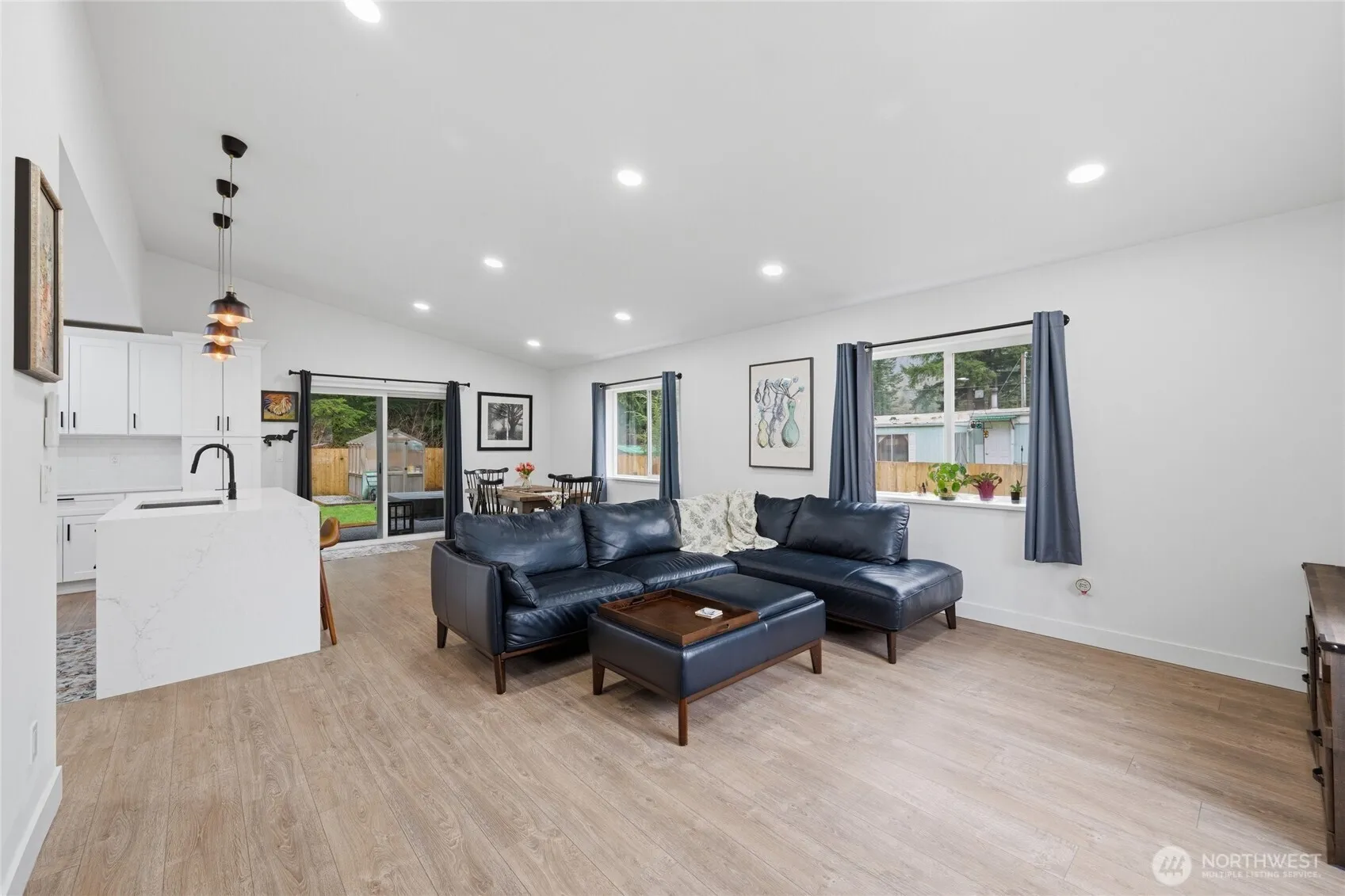 Gorgeous high-end 3 bedroom, 2 bathroom home situated on a level lot with a bright open floor plan and soaring cathedral ceilings. The living area is filled with natural light and flows seamlessly into the modern kitchen featuring white cabinetry, quartz countertops, island seating, a waterfall island, and beautiful easy-care flooring throughout. The spacious primary suite offers a huge walk-in closet and a luxurious five-piece bath with a freestanding soaking tub and separate glass-enclosed shower. Enjoy outdoor living year-round on the covered exposed aggregate patio overlooking the fully fenced backyard. The yard offers plenty of garden space with raised garden beds, a greenhouse, and a newer hot tub-perfect for relaxing or entertaining. A larger driveway provides ample parking and includes EV charging capability. Energy-efficient features include a hybrid electric water heater and a highly efficient 4-zone Daikin heat pump providing both heating and A/C. Conveniently located just 20 minutes from the Canadian border.