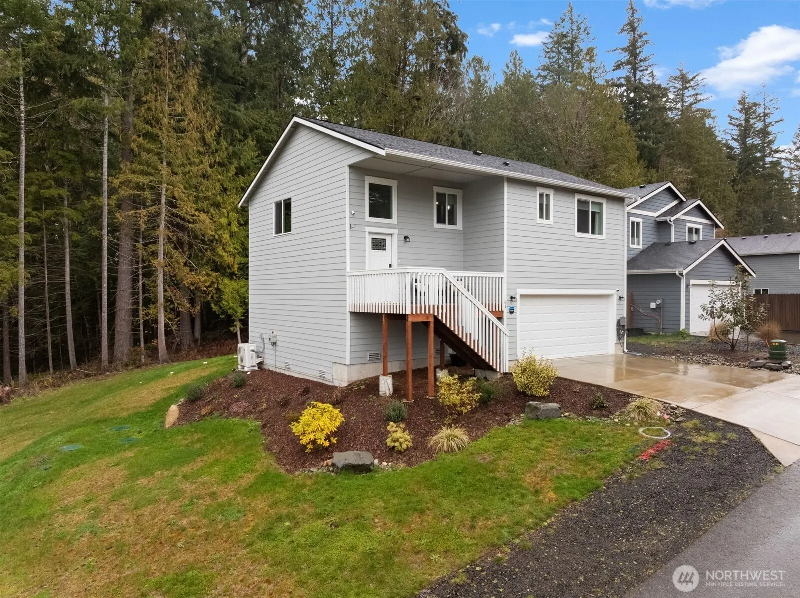 Better than new with standout finishes and true move-in-ready appeal. Inside, you’ll find beautiful LVP flooring, crisp white millwork, and thoughtful designer touches throughout—including charming wallpaper accents that adds personality and warmth.The heart of the home is the light-filled, open-concept living room and kitchen, featuring premium stainless steel appliances, slab granite counters, and a classic subway-tile backsplash. Whether you’re entertaining friends or enjoying a quiet evening at home, the layout flows effortlessly, with territorial views overlooking your private backyard. A large bonus room on the lower level offers flexible space for a media room, home office, playroom, or workout area.Comfort is covered year-round with the efficient ductless mini-split heat pump providing both heating and coveted A/C, while a 2-car garage adds convenience and extra storage.Step outside and enjoy peaceful surroundings with peek-a-boo views of Hood Canal. The neighboring open space parcel provides a sense of privacy and room to breathe, while still being part of a welcoming, connected community. Just minutes to Belfair and a short commute to Silverdale, Bremerton, and Shelton, this home offers the perfect balance of peaceful living, modern style, and everyday convenience.