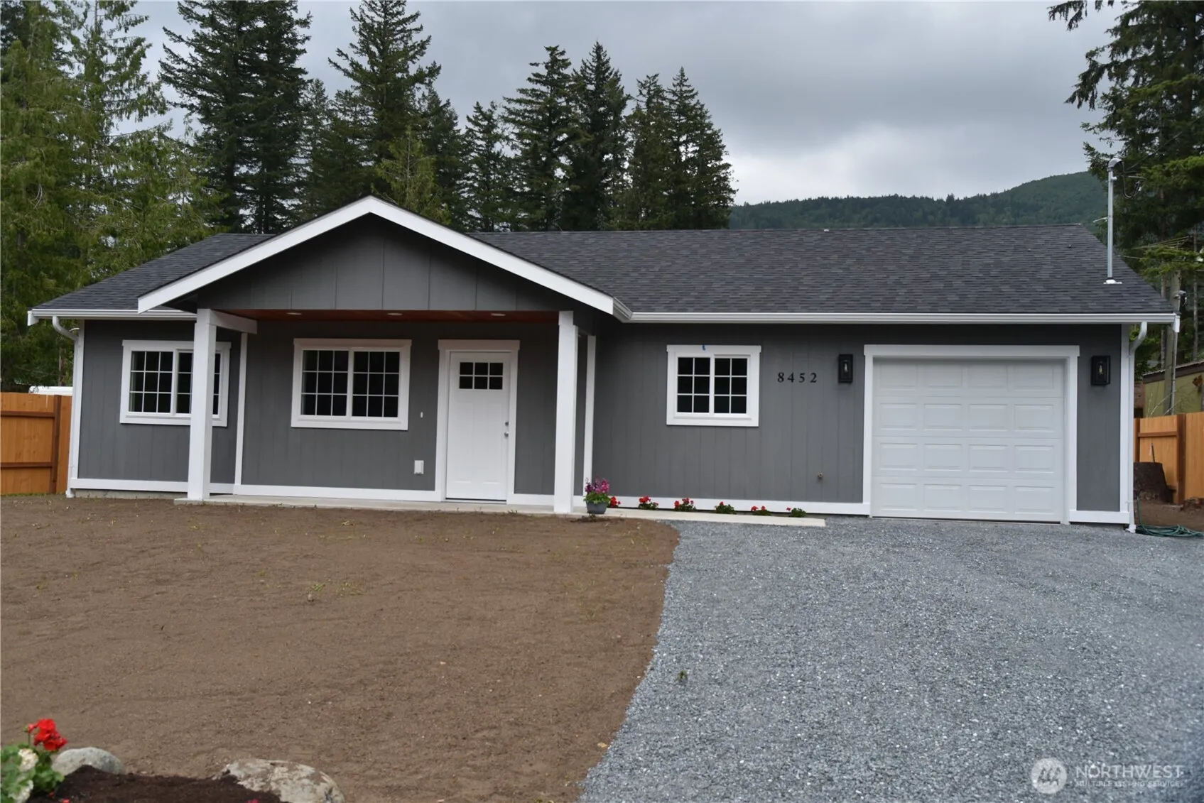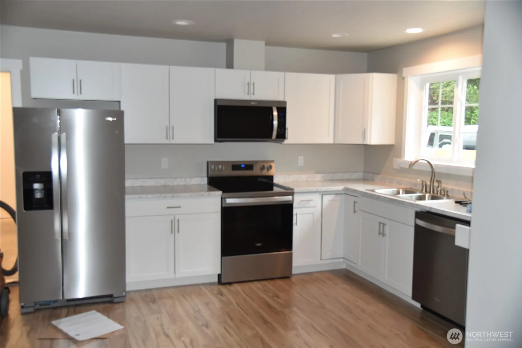 NEW 3 Bed 2 Bath home on 1/4 acre landscaped site. Stainless steel appliances included. Flooring is tile and vinyl plank. Home is on a dead end street with a view of Sumas mountain from the front door and a view of Red mountain from the rear patio. Large back yard and recently fenced on three sides. Air conditioning/heat pump installed for summer comfort. Home is 1106 square feet with an attached, insulated and finished 360 square feet garage. Lots of off street parking and vehicle access to back yard.