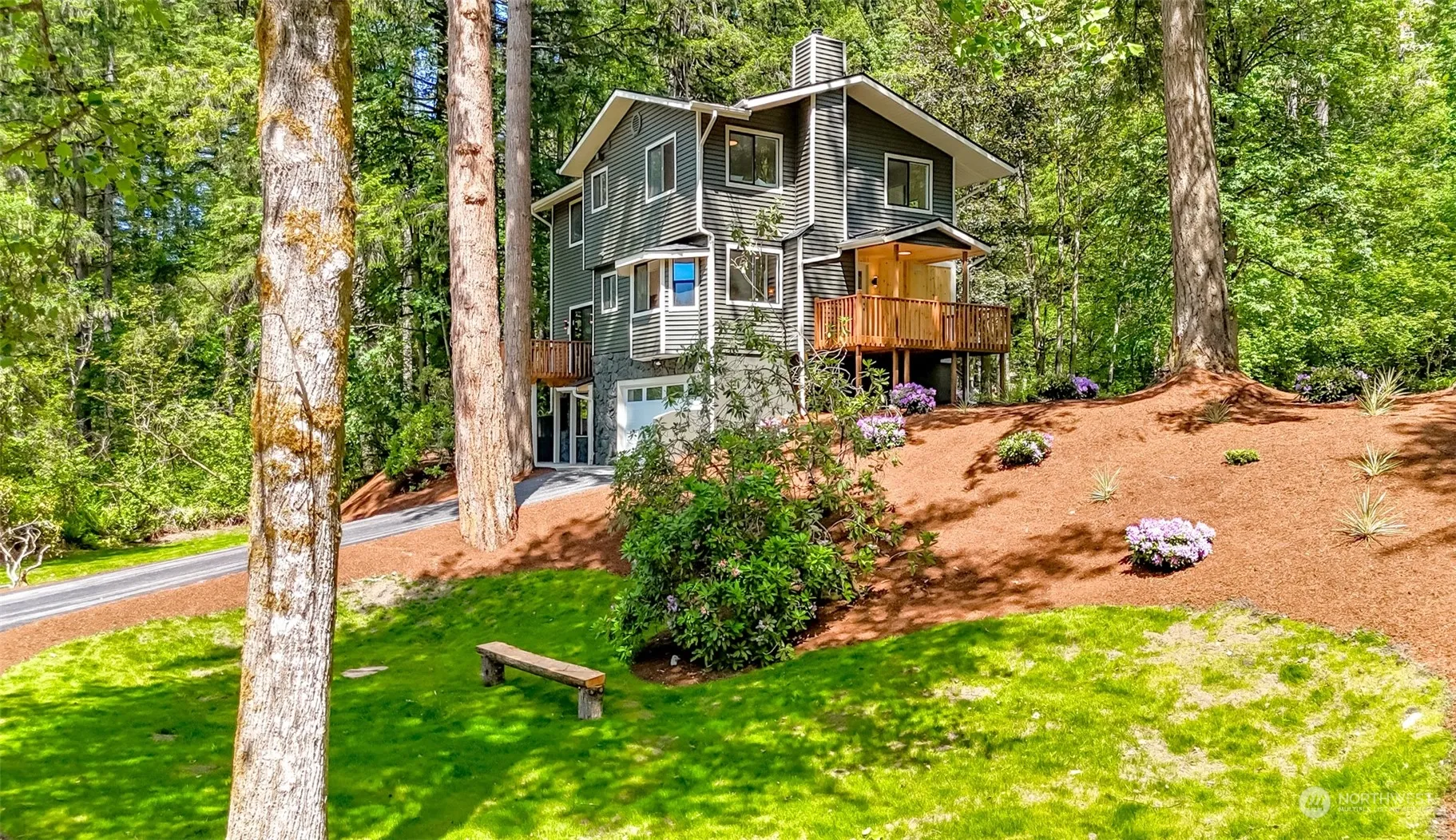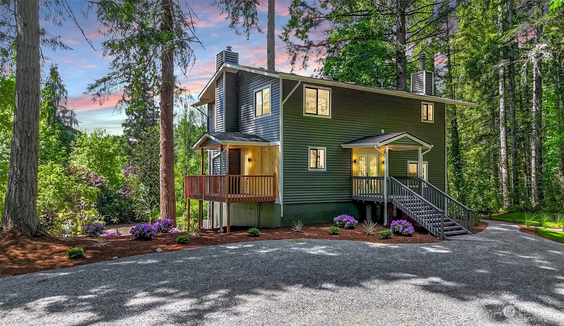 Greeted at a gated entry, you pass over the stream on your private bridge, thru two acres of serenity, to this remarkable makeover! NEW: roof, windows, drywall, paint, Luxury Vinyl Plank floors, doors, millwork & more. Stunning island kitchen boasts custom cabinetry, quartz counters & full height tile backsplash, flowing to dining & sunken living, both w/fireplaces. Generous Owners suite w/oversized tile shower & walk in closet w/organizers. Basement offers 2nd living w/kitchenette, separate laundry & private entry for ADU potential! Black fixtures, finishes & iron railings pop throughout. Mini split heat pumps/AC in ALL rooms. 2 car garage & space for all the toys. Scenery abound from multiple decks & sitting areas + a private fire pit.