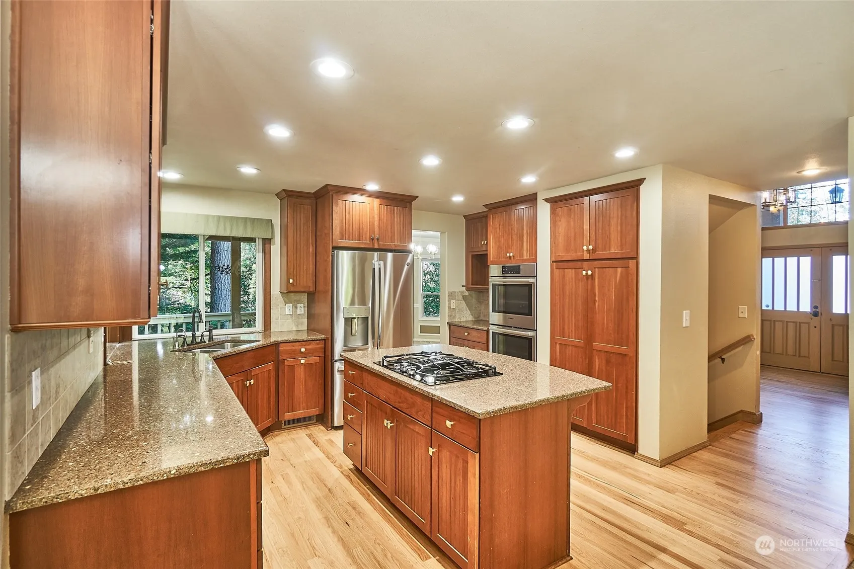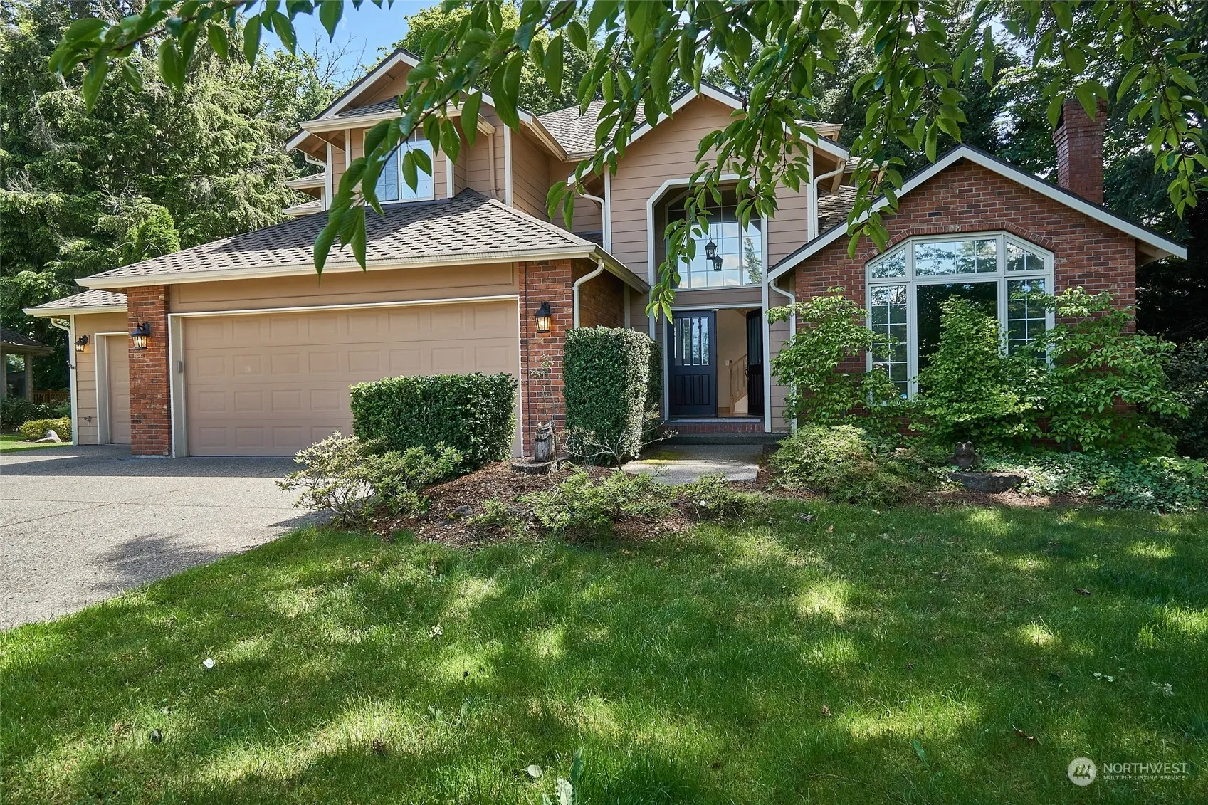 Lake Forest Estates 4 bed PLUS main floor den PLUS huge rec room downstairs with another finished room for an additional study or den or as bed with closet. Main floor with spacious kitchen with double oven, large island with drop in gas stove and room for barstools. Family room off the kitchen with wood burning fireplace insert and wine bar, opens to lg deck with french doors and complete NW privacy with evergreens and no one behind you. Enjoy the terraced backyard and firepit in the woods. Fully finished basement with full bath also opens to backyard patio. Upstairs is 4 bed and two full remodeled baths. Tankless hot water heater, heat pump, built in vacuum and 50 year presidential comp roof. Community access to Lake Wilderness and park.