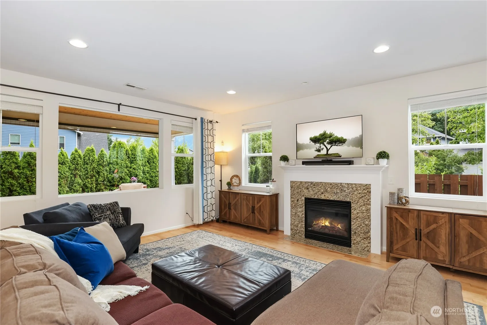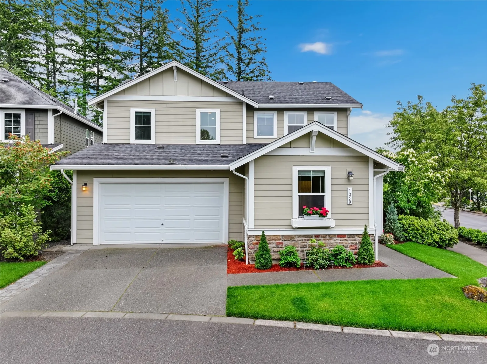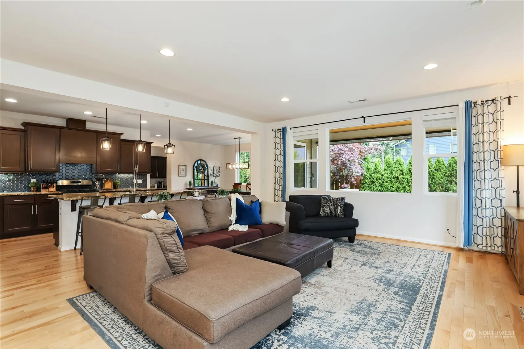 Rare find! Stunning corner lot backing to greenbelt in highly sought after Cedar Falls Neighborhood! Nestled on loop near idyllic park w stunning Mt Si + Rattlesnake Ridge views. Main level is flooded w/natural light + maple hardwood floors leading to spacious living area. Updated kitchen features glass hexagon tile backsplash + 9ft single slab granite counter island w/new lighting. Oversized walk-in pantry w/ample storage & flows sensibly. Main level guest suite w/fully renovated bath. Guest suite w/renovated bath. Primary features 2 dual walk-in closets + en suite bath + 2 additional beds. Meticulously landscaped w/2-tiered, two-toned wrap-around composite wood deck + hot tub. Near schools + sport fields + community Park. Welcome Home!
