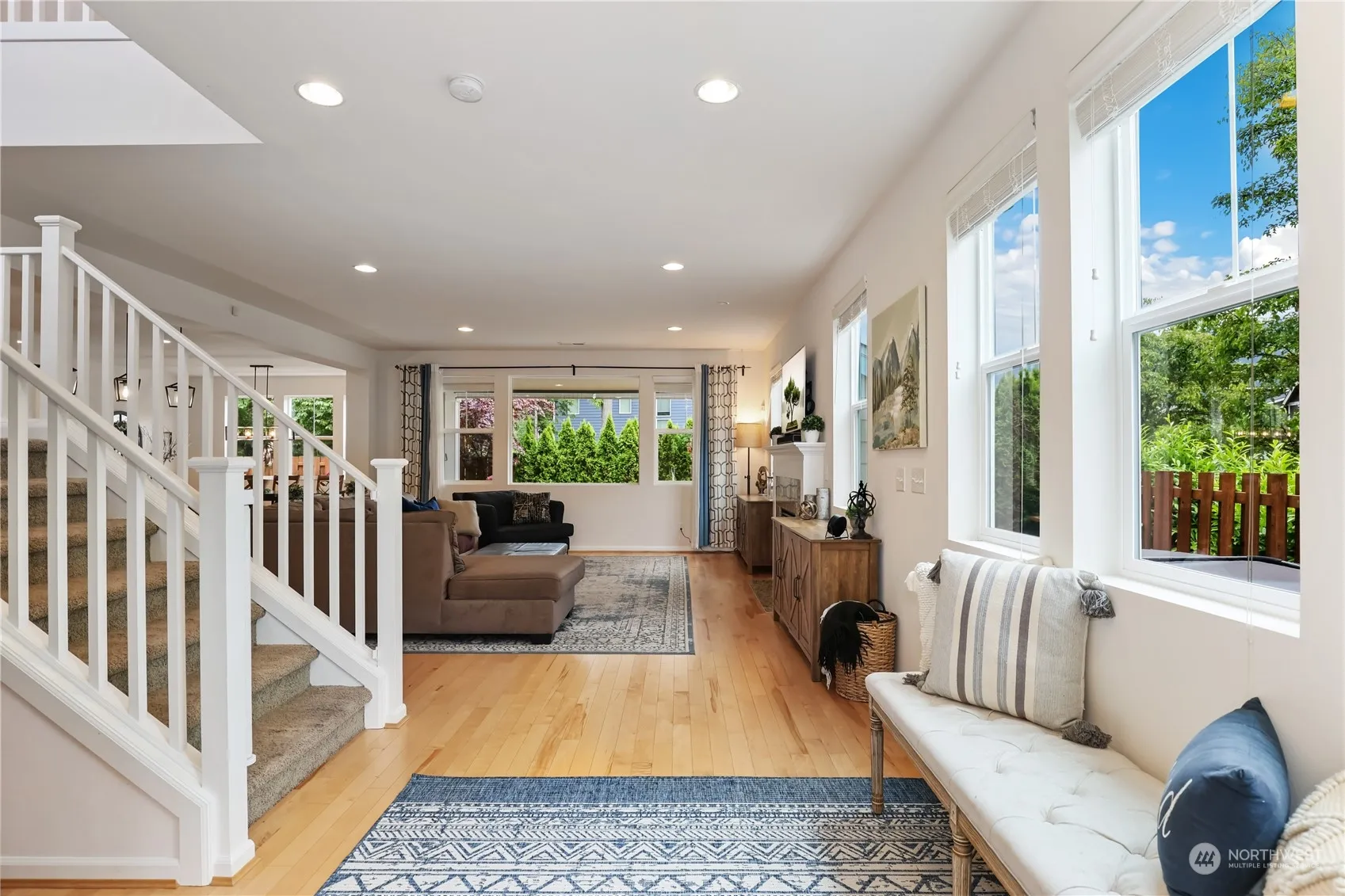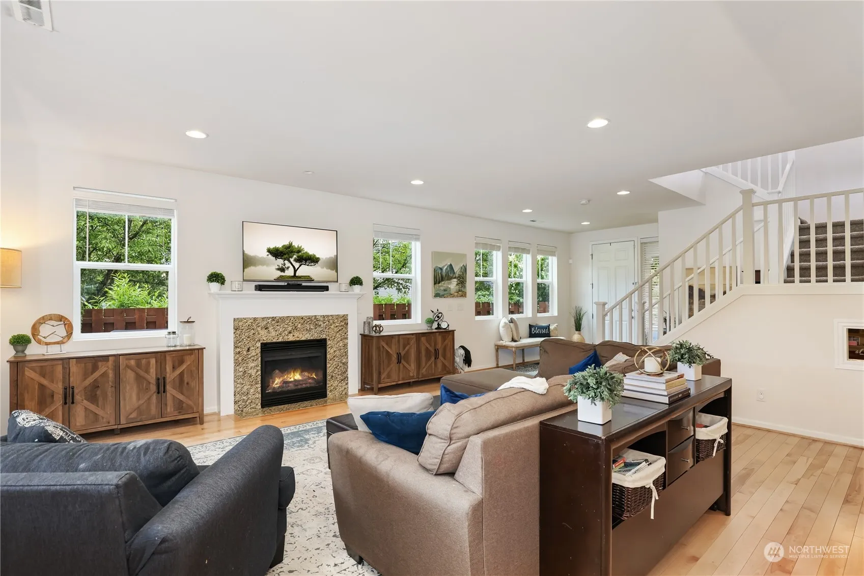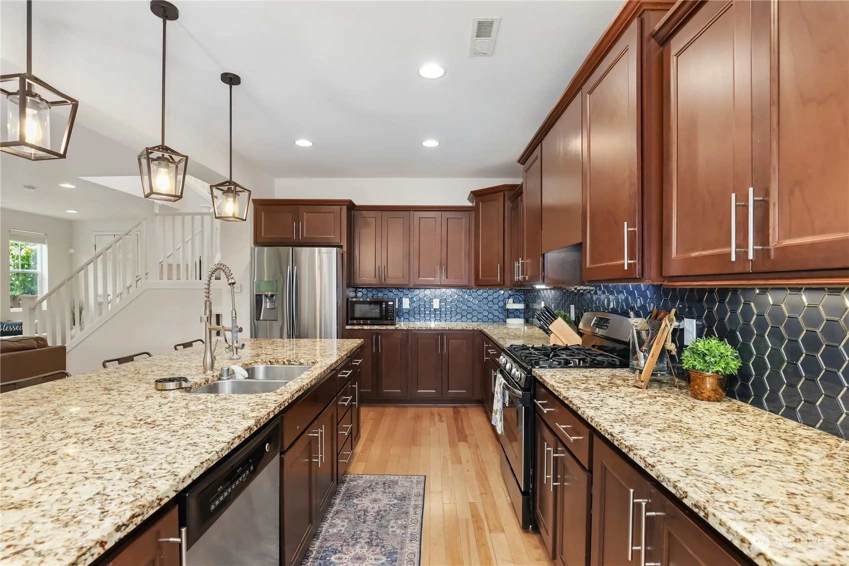 Rare find! Stunning corner lot backing to greenbelt in highly sought after Cedar Falls Neighborhood! Nestled on loop near idyllic park w stunning Mt Si + Rattlesnake Ridge views. Main level is flooded w/natural light + maple hardwood floors leading to spacious living area. Updated kitchen features glass hexagon tile backsplash + 9ft single slab granite counter island w/new lighting. Oversized walk-in pantry w/ample storage & flows sensibly. Main level guest suite w/fully renovated bath. Guest suite w/renovated bath. Primary features 2 dual walk-in closets + en suite bath + 2 additional beds. Meticulously landscaped w/2-tiered, two-toned wrap-around composite wood deck + hot tub. Near schools + sport fields + community Park. Welcome Home!