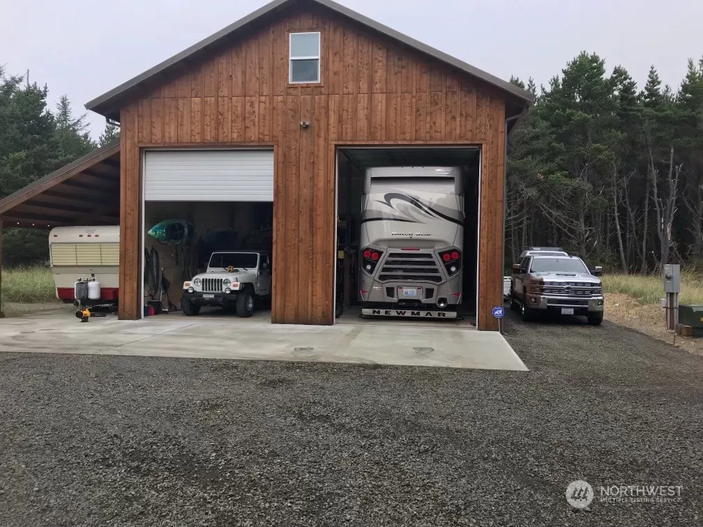 Beach Retreat waiting for you to start enjoying the beautiful ocean and it has to offer. Located just 5 mins to Ocean Park and 10 mins to Long Beach. As you enter the property you will find a new built one story light and bright 2 bed home. Large covered porch for your enjoyment. An oversized garage will provide you with plenty of room for toys, boats and vehicles. If this is not enough storage, up the path is a barndominium with a 30X48 Fully insulated shop. Tall doors and ceilings make it easy for boats, motorhome and etc. Up the steps to a fantastic 920 sq ft living quarters. Be ready to be wowed by breathtaking ocean views. This space is so comfy, you will never want to leave. RV hookups, and a fire pit and much more. Come take a look!