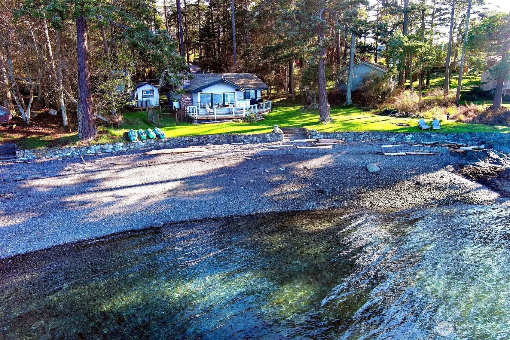 Warm pine paneled Cape San Juan cabin with a no bank sand and gravel beach with a nice rock bulkhead. Cozy wood burning fireplace with rock surround. The recently updated cabin offers one bedroom, plus a den, and two bathrooms. Open kitchen, dining, and living room floor plan offers expansive views of Griffin Bay. Only three concrete steps lead down to the 131 feet of beach. Harbor Island which is a national bird sanctuary brings in all kinds of wildlife in addition to our winged friends. Sea lions, seals, eagles, geese, ducks, blue herons, and oyster catchers frequent the vista in front of the cabin. Deer and fox are also visitors to the cabin. All kinds of fishing nearby and excellent Dungeness crab fishing is located about ¾ miles west in Griffin Bay. Cape San Juan offers community water, roads, pool, moorage facility, and a expansive gravel community beach near the entrance. The neighborhood is adjacent to Cattle Point State Park and American Camp National Park which has spectacular trails and beaches. This property is one of the nicest in the islands with its beach and wildlife. Furniture and personal property included in price subject to short exception list.