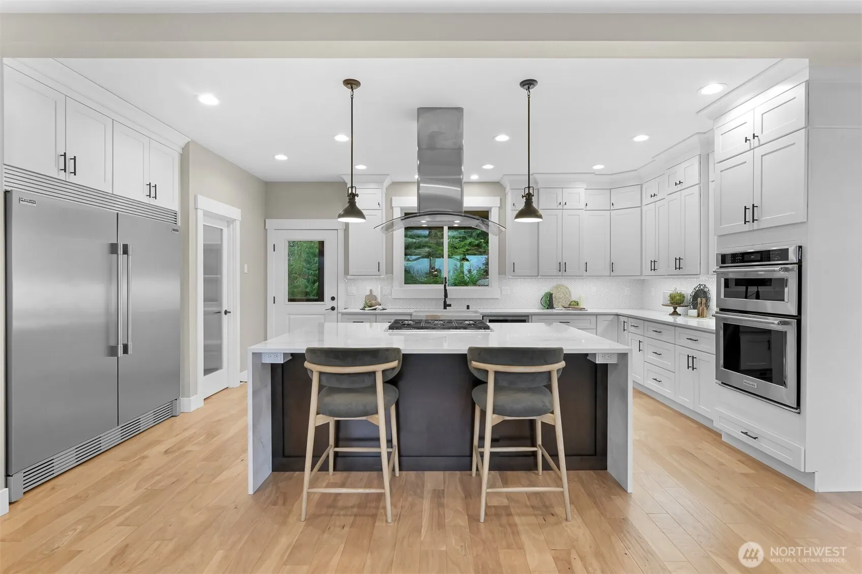 Step into this contemporary masterpiece in Bellingham’s coveted South Side. The open-concept design boasts soaring 12-foot ceilings, a chef’s kitchen with a stunning 7-foot quartz waterfall island, commercial-grade appliances, and a spacious walk-in pantry. A covered deck off the kitchen overlooks a private backyard with BBQ hookups and stairs—ideal for year-round entertaining.The main floor features a tranquil primary suite with a spa-like ensuite and walk-in closet, a cozy living room with a gas fireplace, a dedicated office, and a convenient laundry room. Upstairs, you’ll find two spacious bedrooms—one with serene bay views—and a guest bath with quartz countertops and a tiled shower/tub. The lower level offers versatility with a bedroom, full bath, kitchenette, and an impressive media room.The 1,129-square-foot, extra-deep 3-car garage is a dream, complete with clear garage door panels for abundant natural light—perfect for storage or hobbies. Beyond the home, adventure awaits with Samish Trail access right outside, plus Galbraith Mountain, Lake Padden, and top-notch shopping and dining just minutes away. This property blends luxury, functionality, and an unbeatable location—truly a rare find!