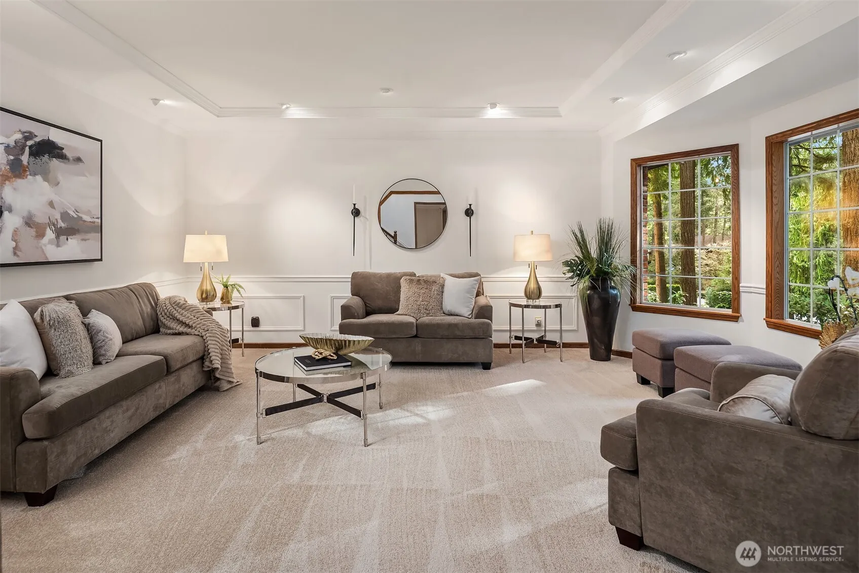 Exceptional residence within the gated community of Sahalee Estates, just steps from the fairways of Sahalee Country Club. Offering 3,415 SQ FT of living space, this 4 BR,2.75-bath home blends warmth & timeless character. A welcoming main-level entry with soaring ceilings & detailed wainscoting, setting the tone for classic elegance. Formal living room, illuminated by expansive windows, invites gatherings, dining room provides a refined setting. The center of the home, the kitchen features rich cabinetry, granite countertops, SS appliances, & gas cooktop, with picturesque golf course views. Beyond glass doors inspired by Frank Lloyd Wright, the cozy family room offers a fireplace & built-ins, ideal for everyday living. A spacious bonus room w/fireplace & wall-length bookcase provides flexibility as a media/private retreat. Upstairs, double French doors reveal the expansive primary suite, complete with a balcony overlooking the course, a generous walk-in closet, & a five-piece ensuite dual vanities & separate shower. An adjoining home office or fourth bedroom. Three additional bedrooms and a full guest bath offer ample space. Outside, a new deck and mature landscaping along the 3 South fairway create a private retreat. With a three-car garage and proximity to Metropolitan Market, Trader Joe’s, Costco, dining, entertainment, downtown Redmond, Highway 520, and Microsoft, all within the Lake Washington School District, this Sahalee home is truly exceptional.