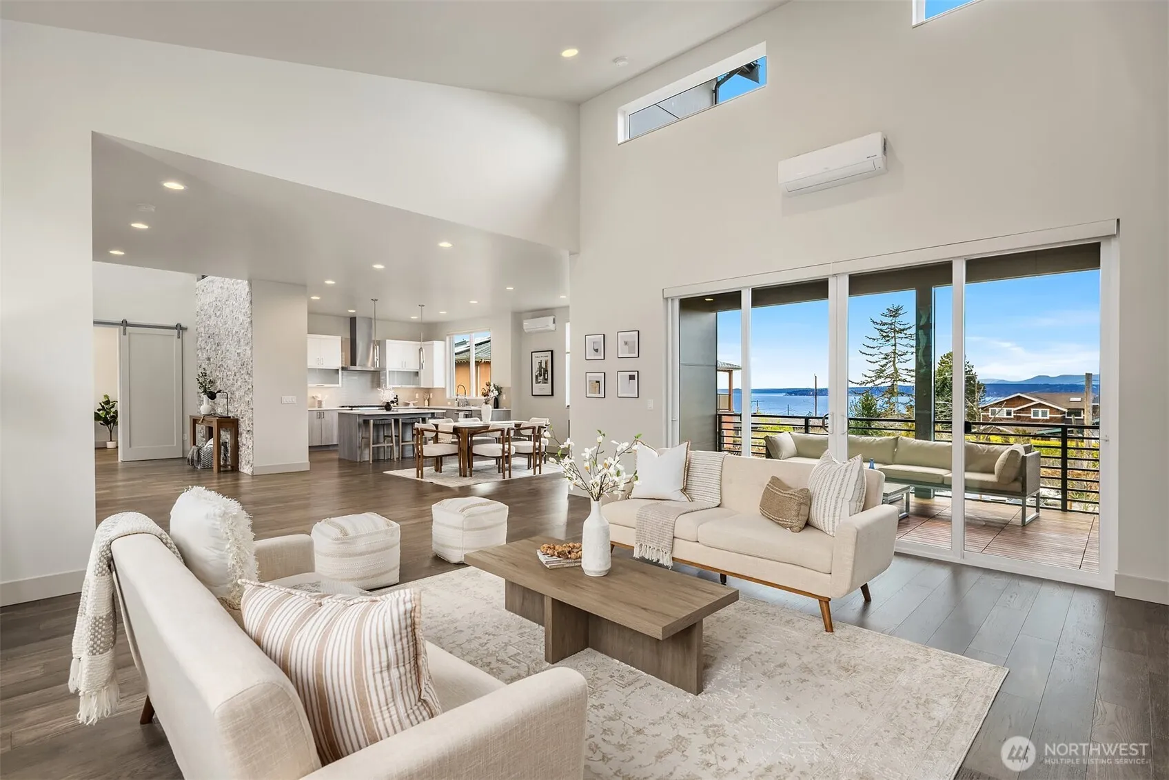 Richmond Beach living w/ stunning views & contemporary style Soaring 2-story entry welcomes w/ striking travertine accent wall. Generous open-concept design maximizes west-facing views of Sound & Olympics. Watch sunsets. Airy & light-filled throughout, main level features wide-plank hardwoods & gas fireplace framed by custom built-ins. Easy access to covered view deck for seamless indoor-outdoor flow. Gourmet kitchen showcases dual-tone flat-panel cabinetry & chef-grade Thermador appliances: 8-burner gas range. Spacious Primary Suite offers private balcony, sitting area, oversized WIC w/ built-ins & spa-like 5-pc bath. Upstairs family room & lower-level rec-room w/ $30K surround sound system w/ KEF in-wall & in-ceiling speakers. Updated landscaping w/ raised garden beds & accent lighting. 2-car garage. Mins to Kings, beach, & downtown Edmonds.